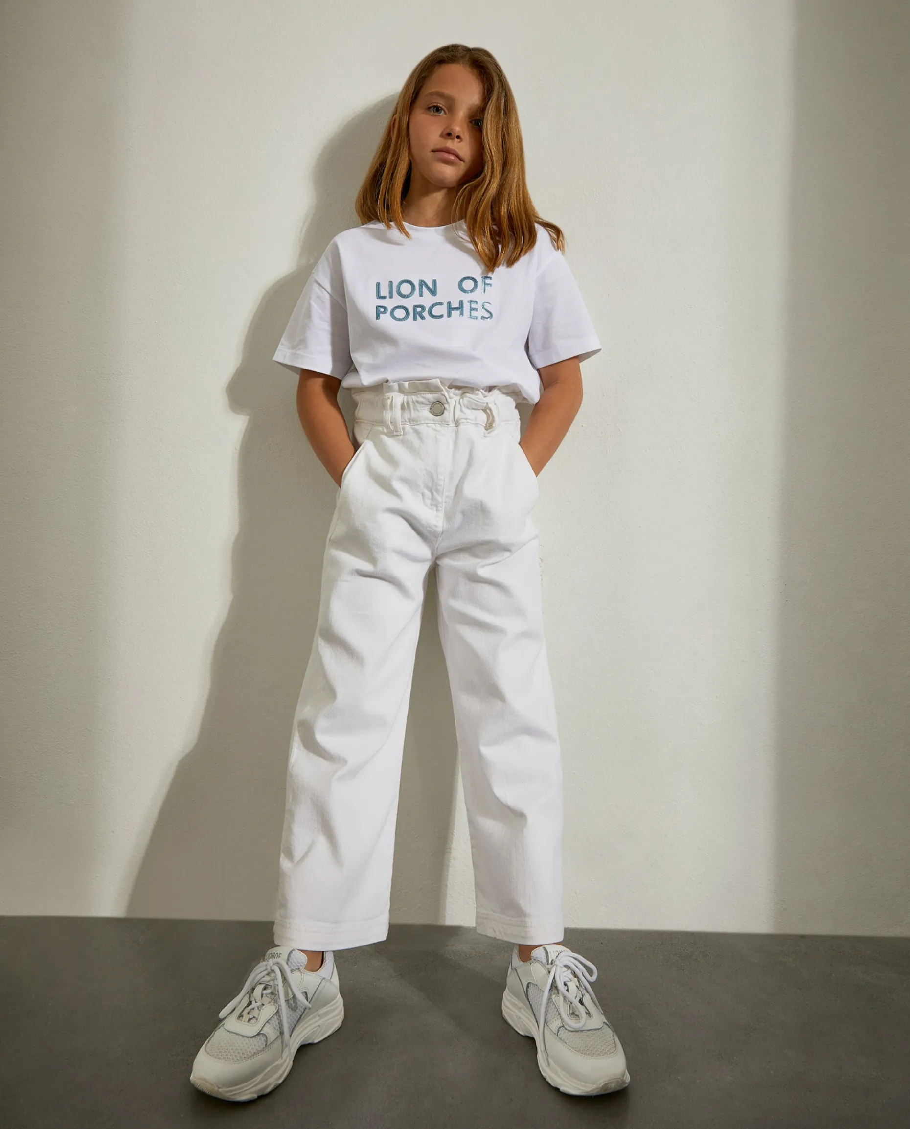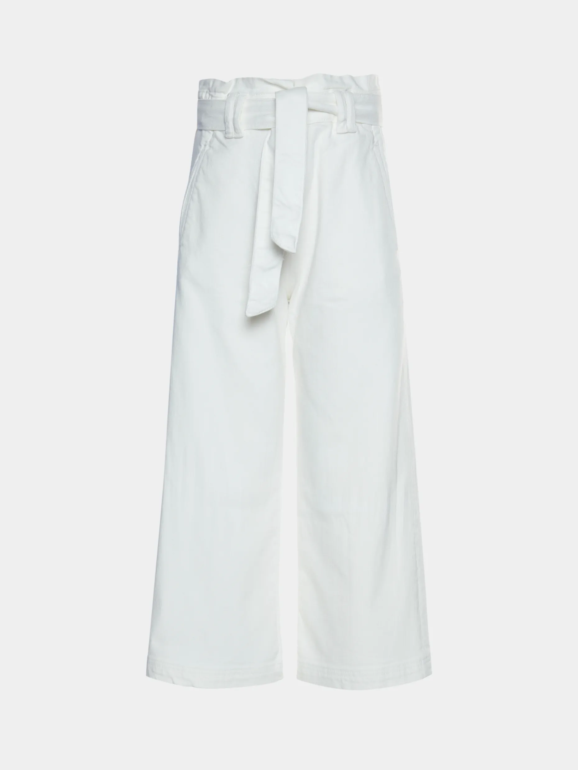 Calças largas em sarja com cinto na própria sarja para fazer laço. Estampado no bolso traseiro em contraste.