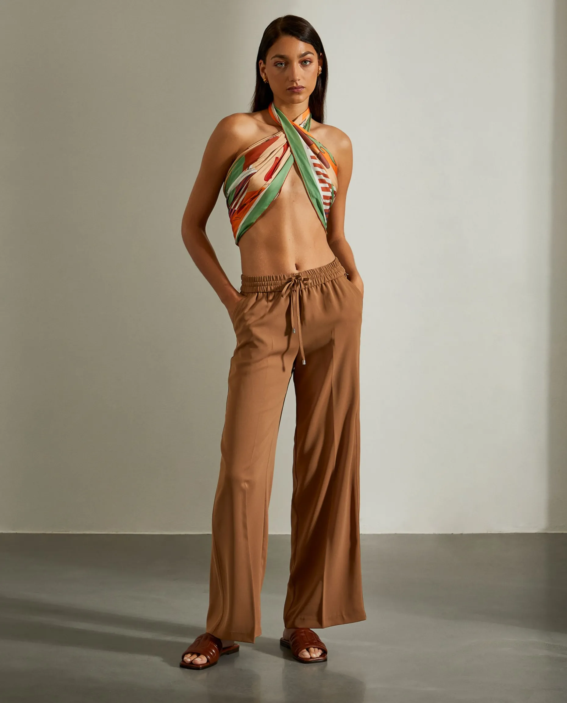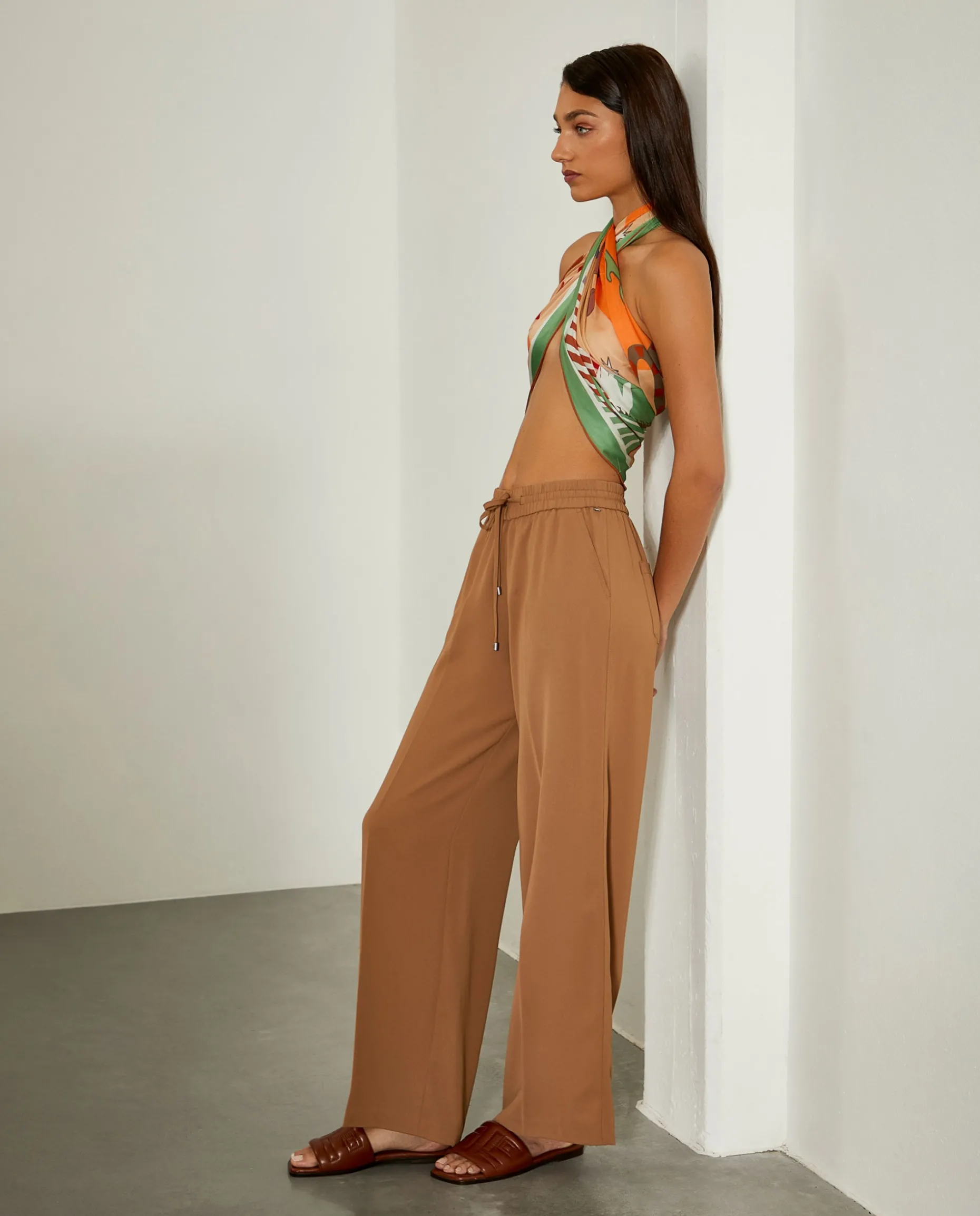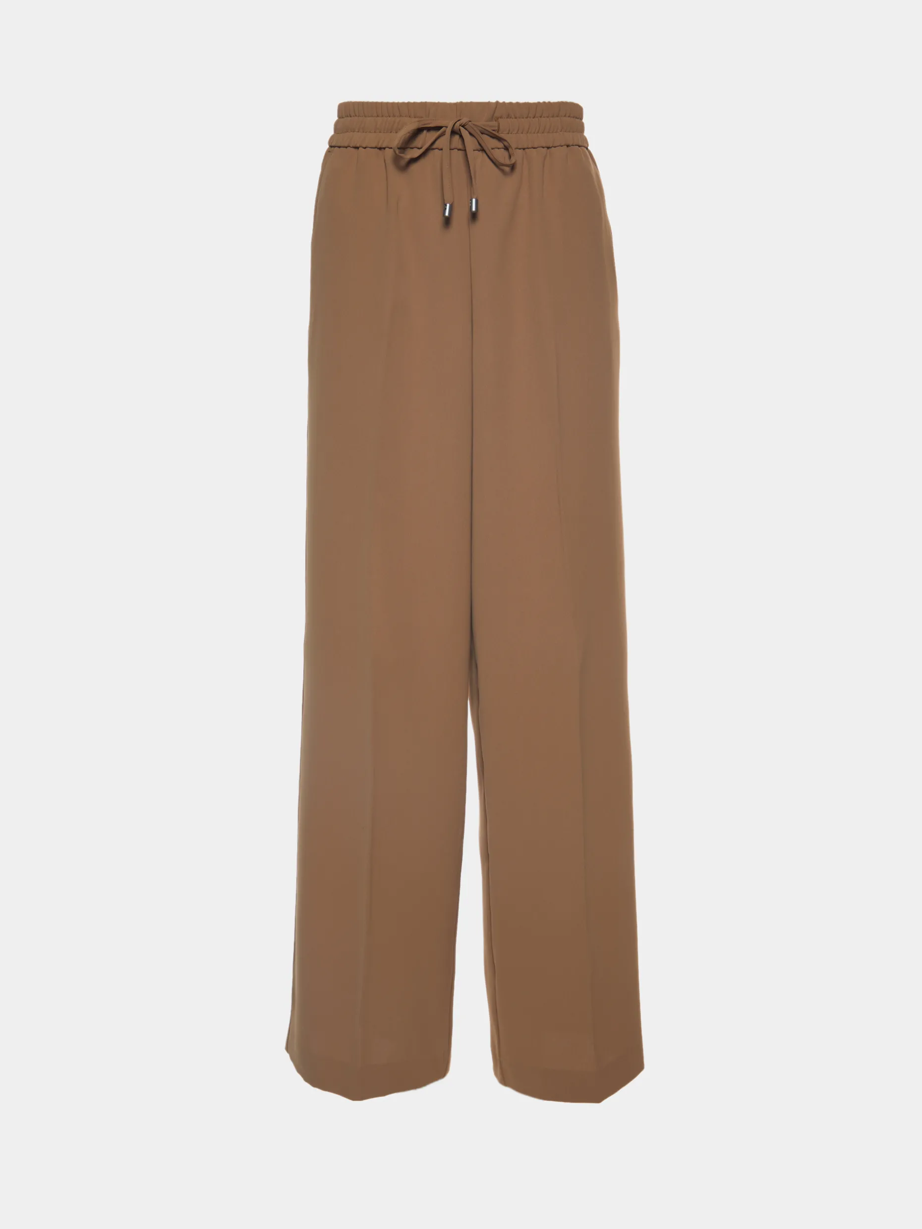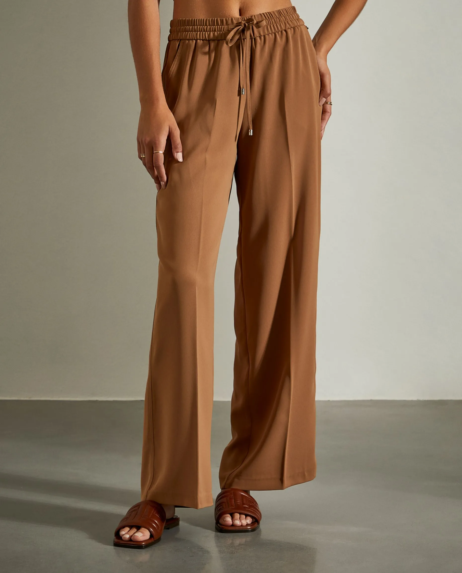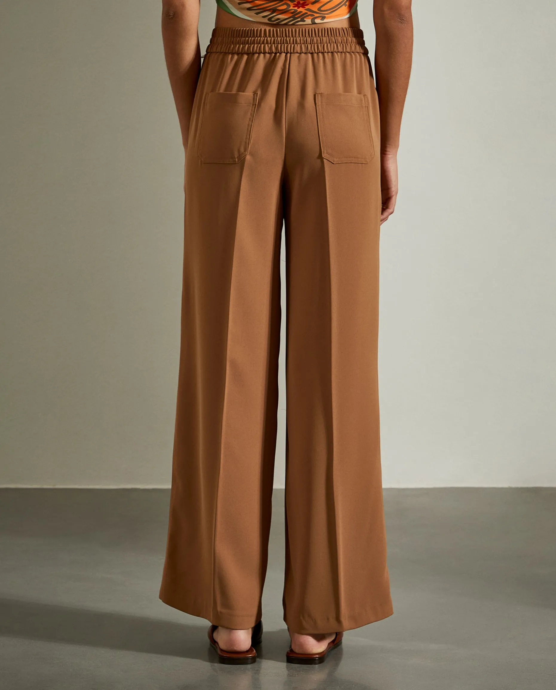 Calças de perna larga com vinco e cintura ajustada com cordão e elástico.