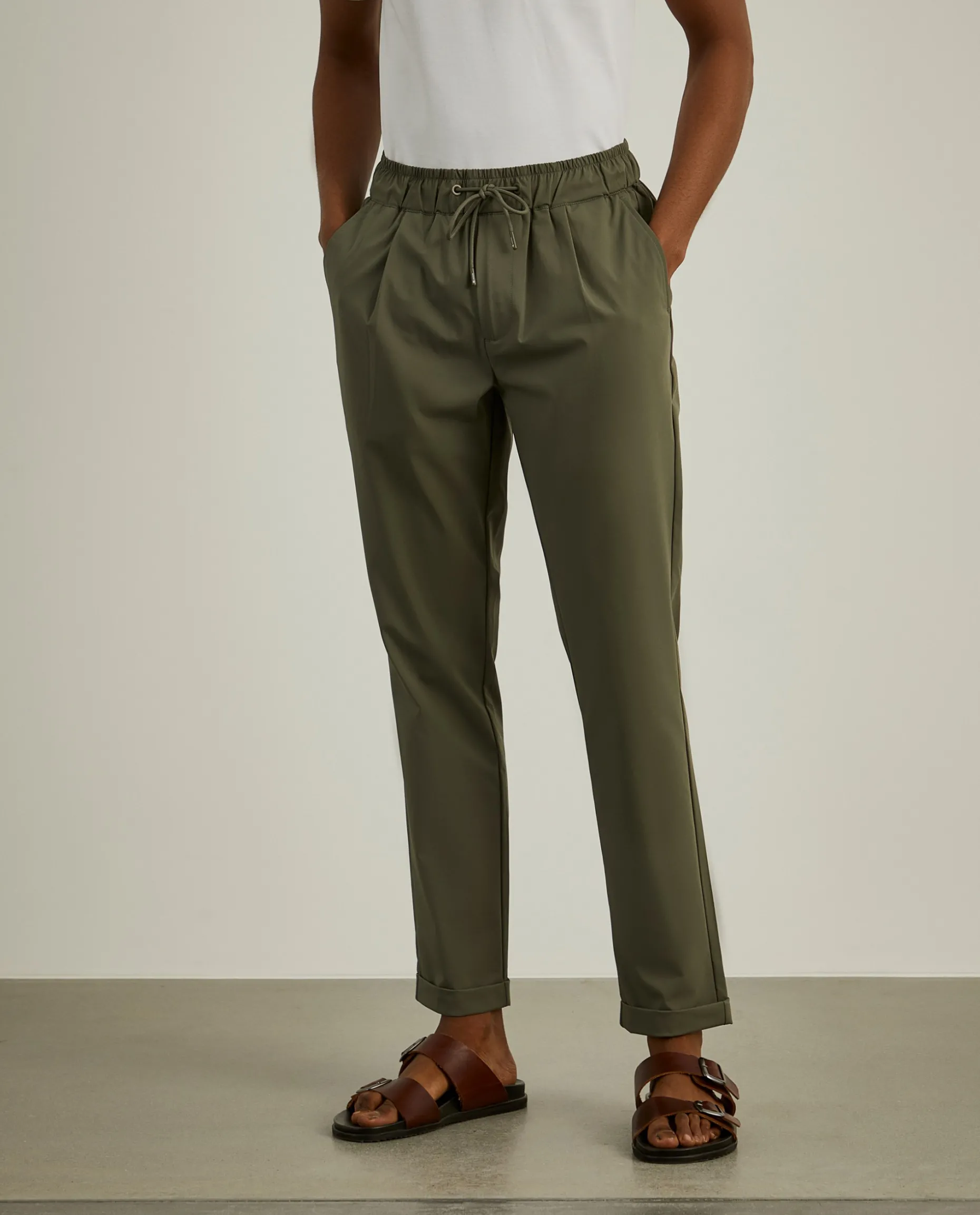 Calças jogger em malha técnica com cintura elástica ajustável por cordão. Com bolsos laterais e atrás, finalizam com dobra na base da perna.