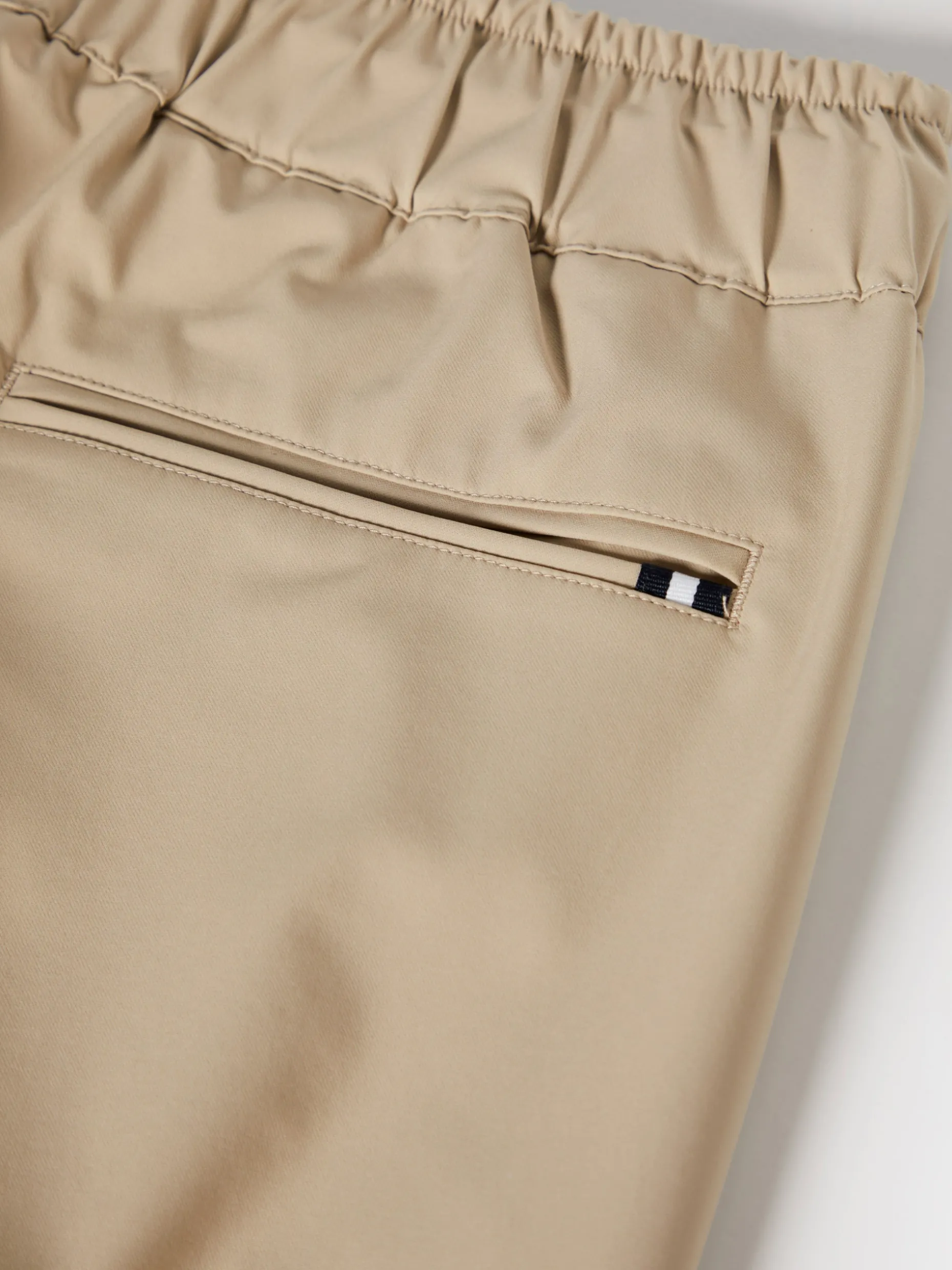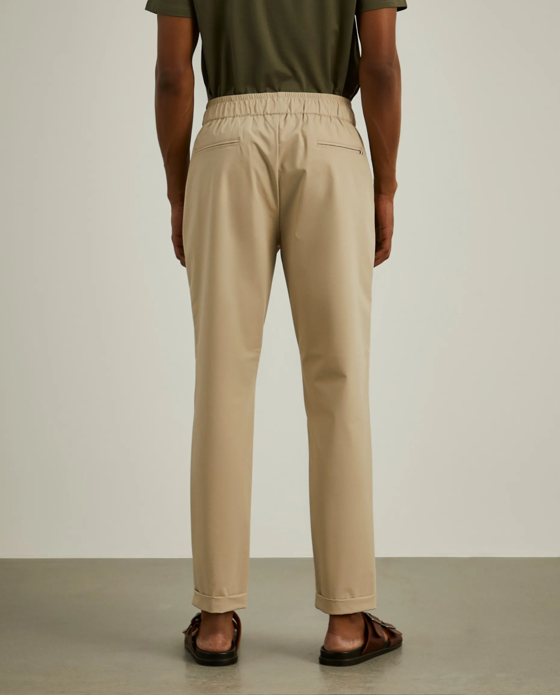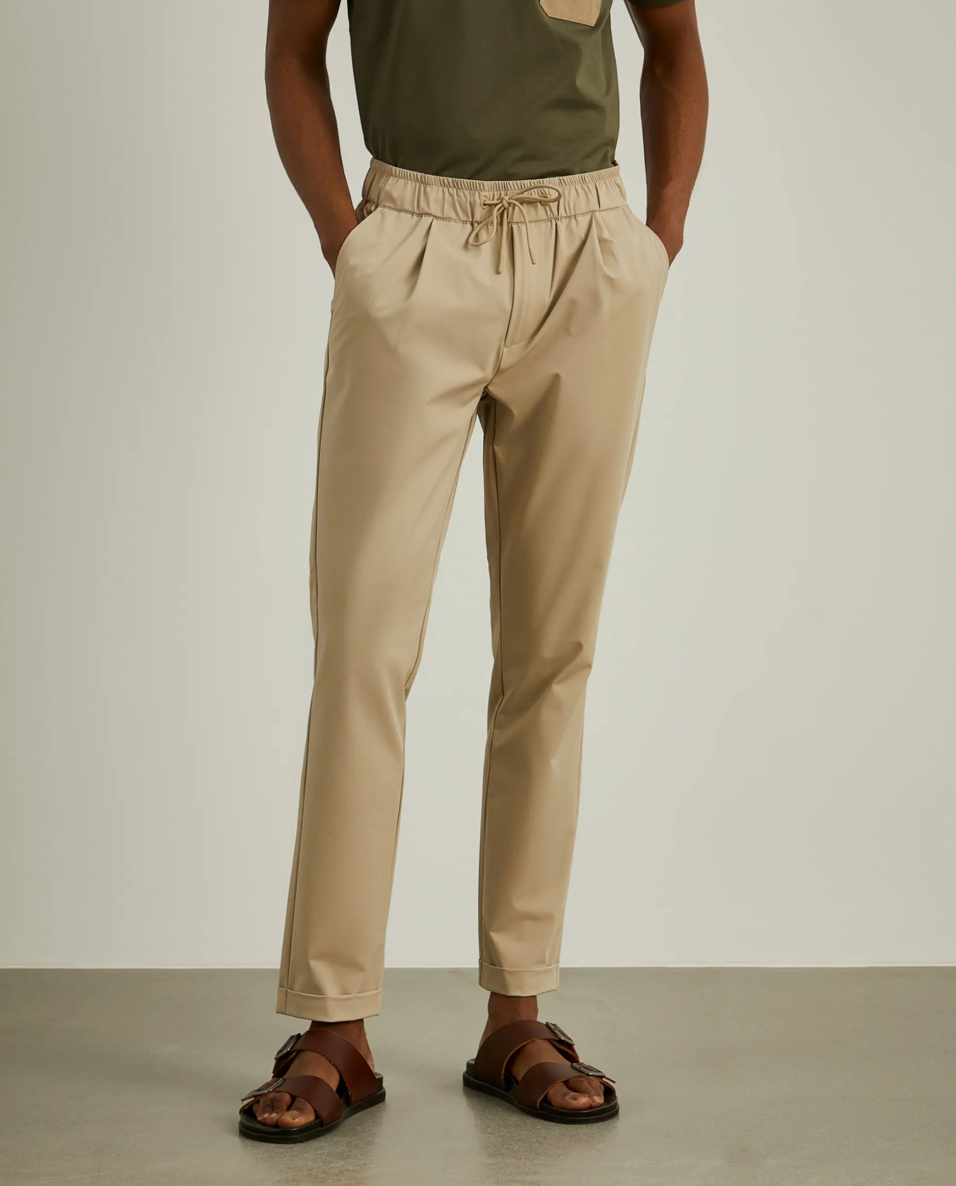 Calças jogger em malha técnica com cintura elástica ajustável por cordão. Com bolsos laterais e atrás, finalizam com dobra na base da perna.