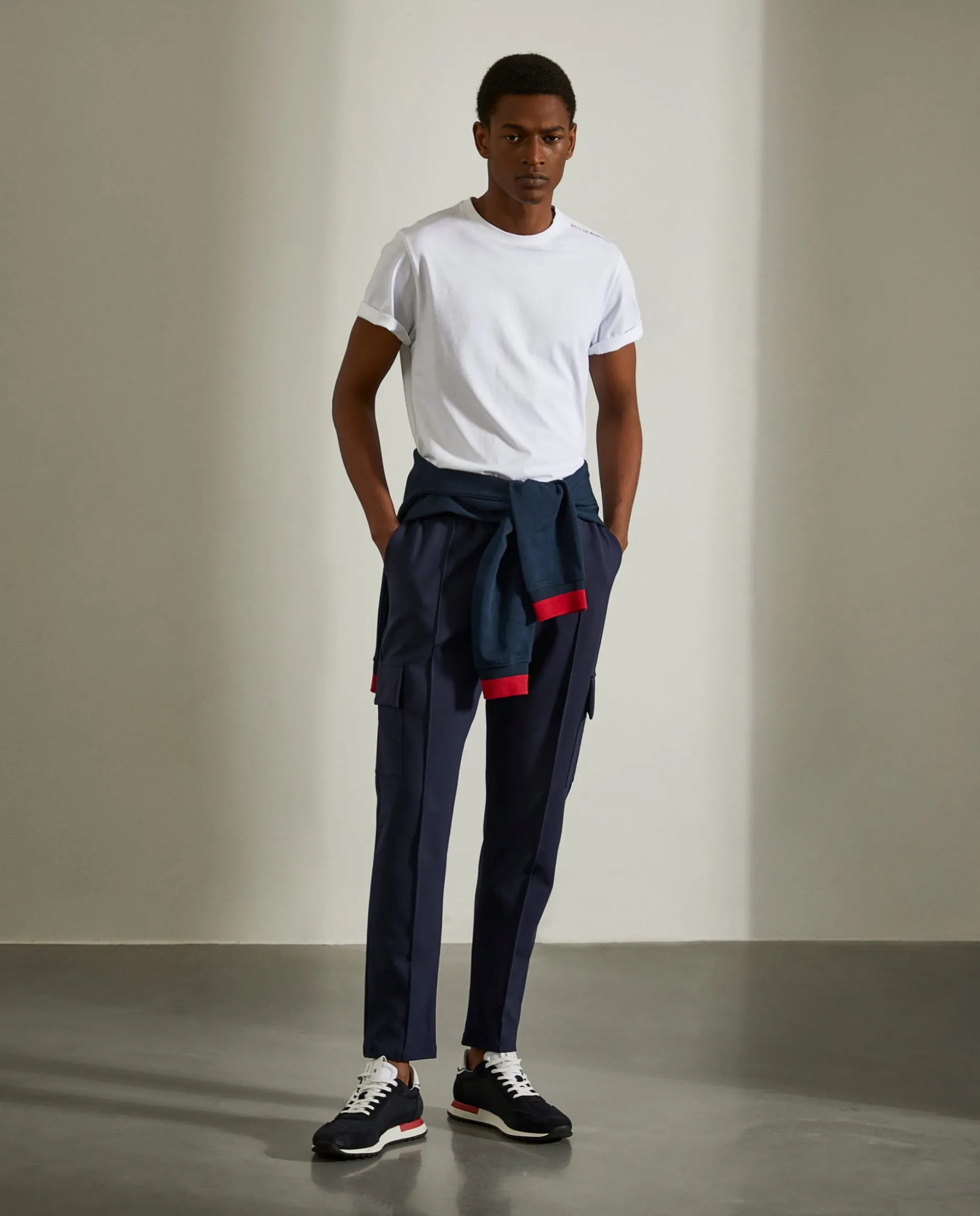 Calças jogger confecionadas em malha com bolsos nas laterais. Cordões à cor com ponteiras em contraste. Bolso traseiro com estampado em contraste.