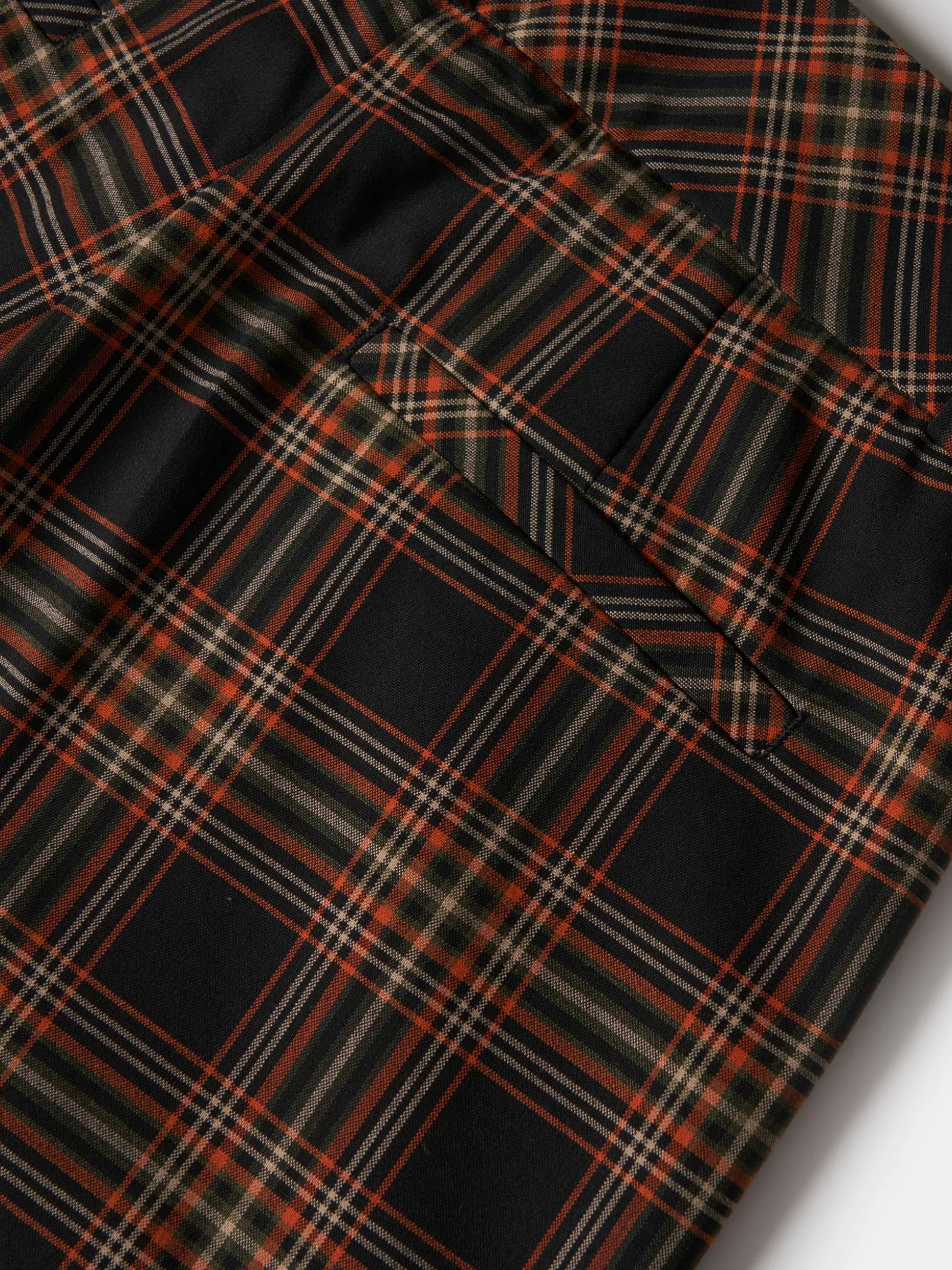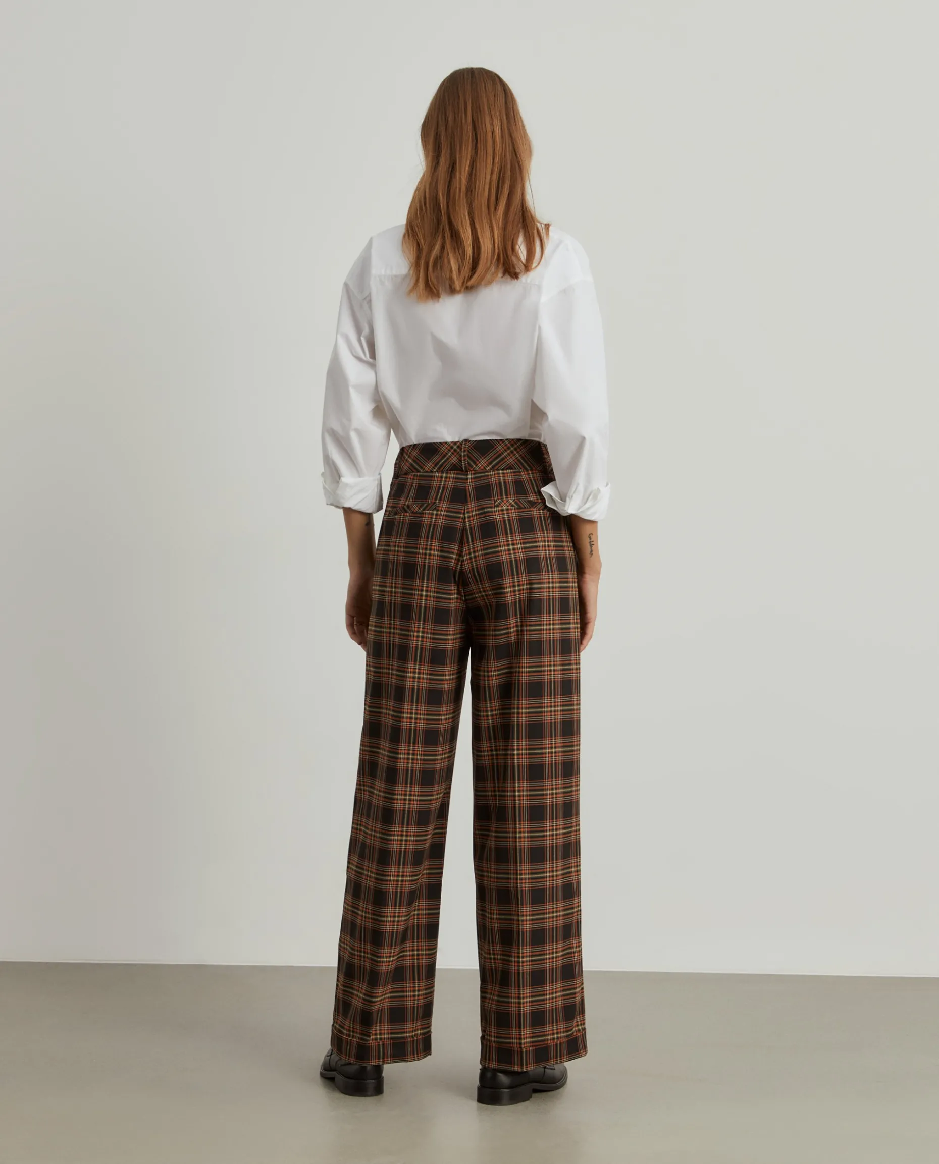 Calças largas xadrez com prega na frente. Apertam na frente com fecho oculto e dois botões. Dois bolsos laterais e dois bolsos na parte posterior.