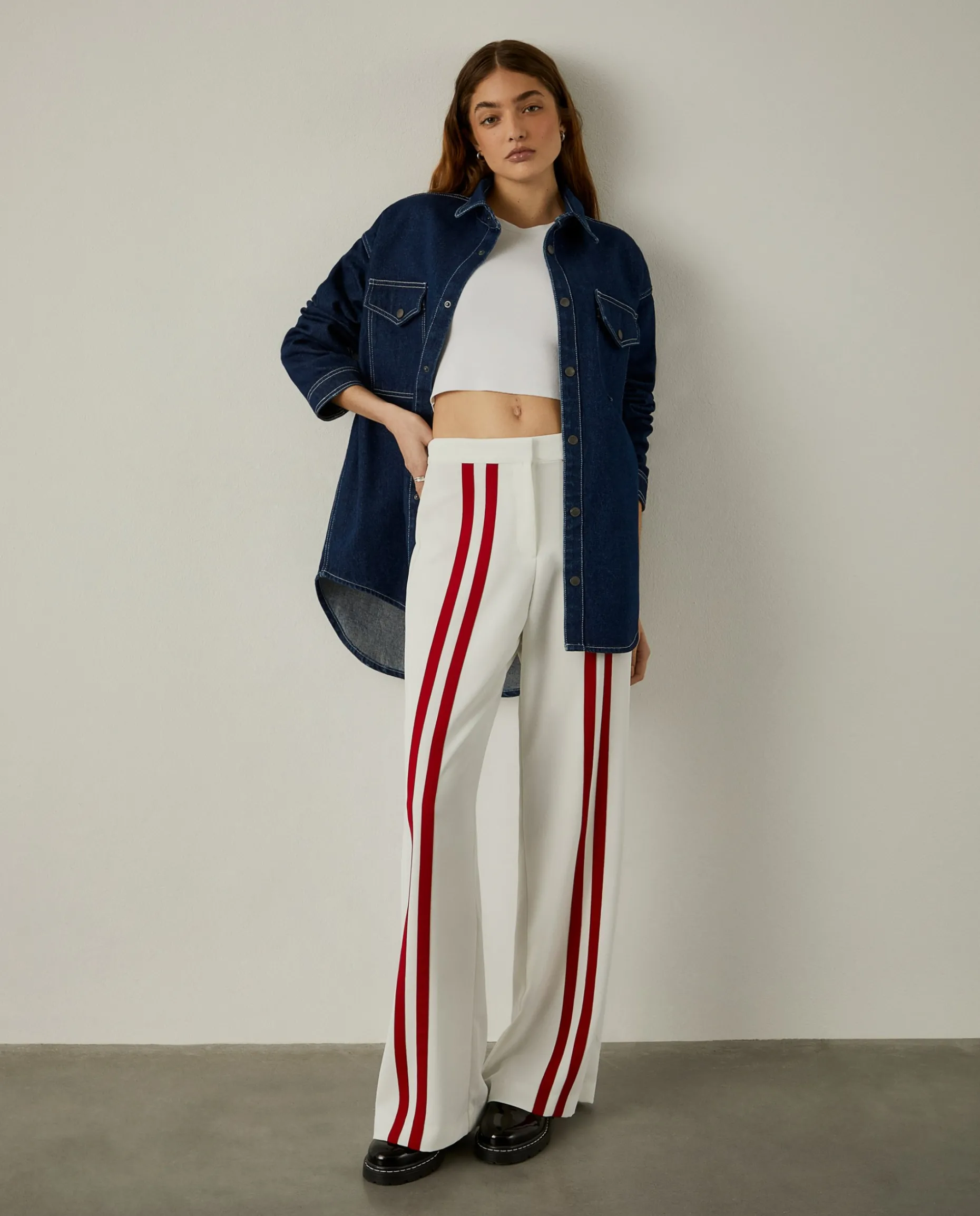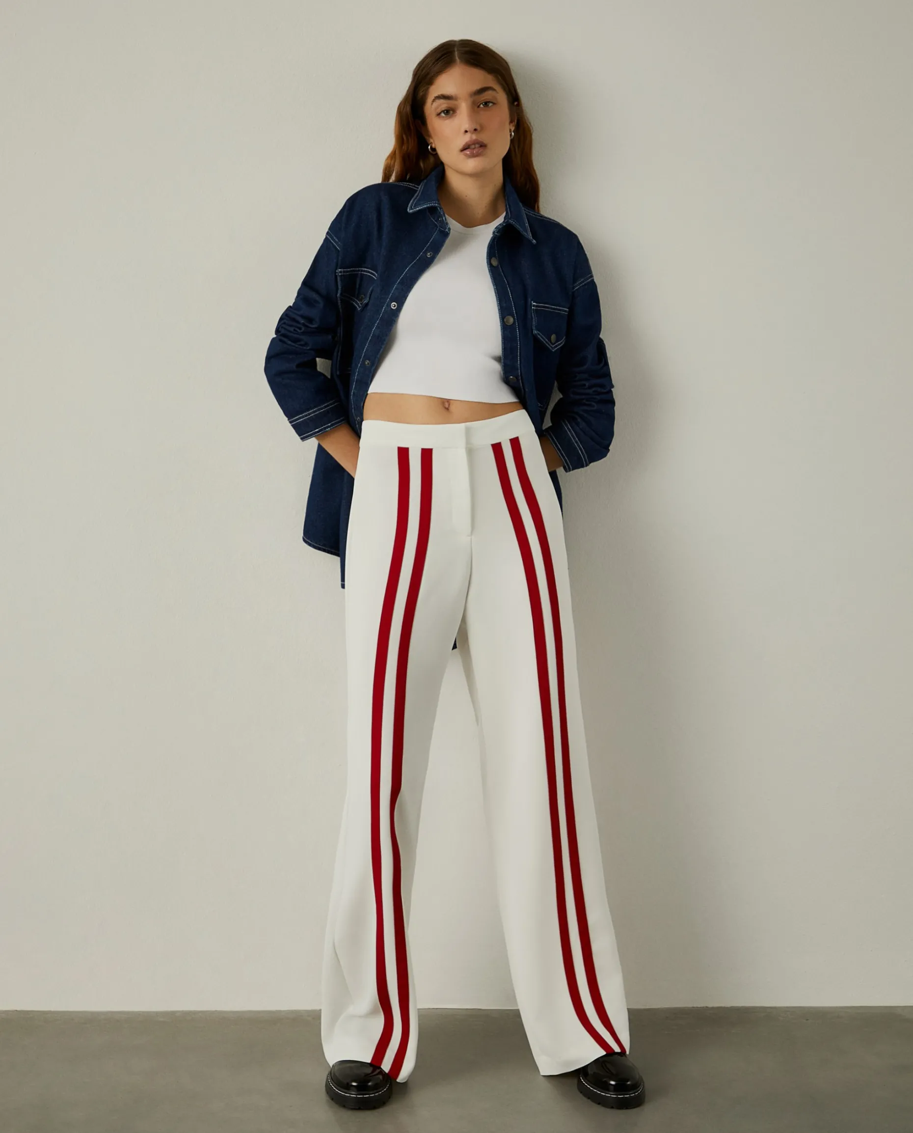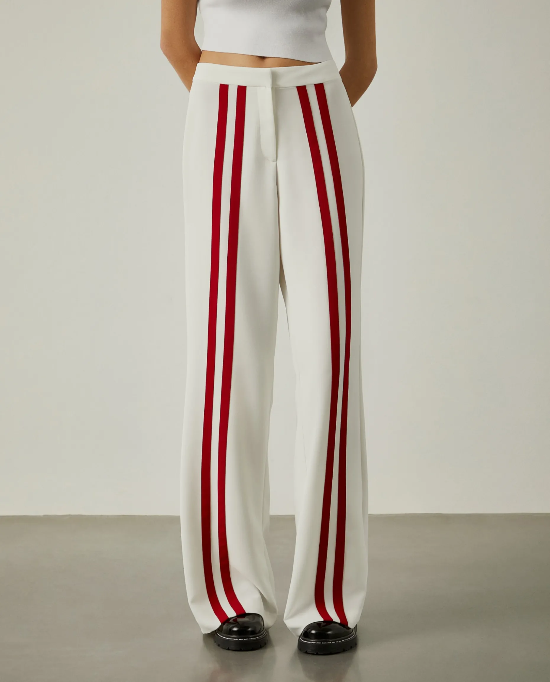 Calças loose fit com riscas vermelhas verticais em contraste. Confecionadas na totalidade em cupro, um material leve, macio, eco-friendly e sustentável. Para um total look, veja também a camisa cropped da mesma coleção. Uma peça Lion of Porches x Paatiff, produzida em Portugal e desenhada com recurso a ferramentas de inteligência artificial.