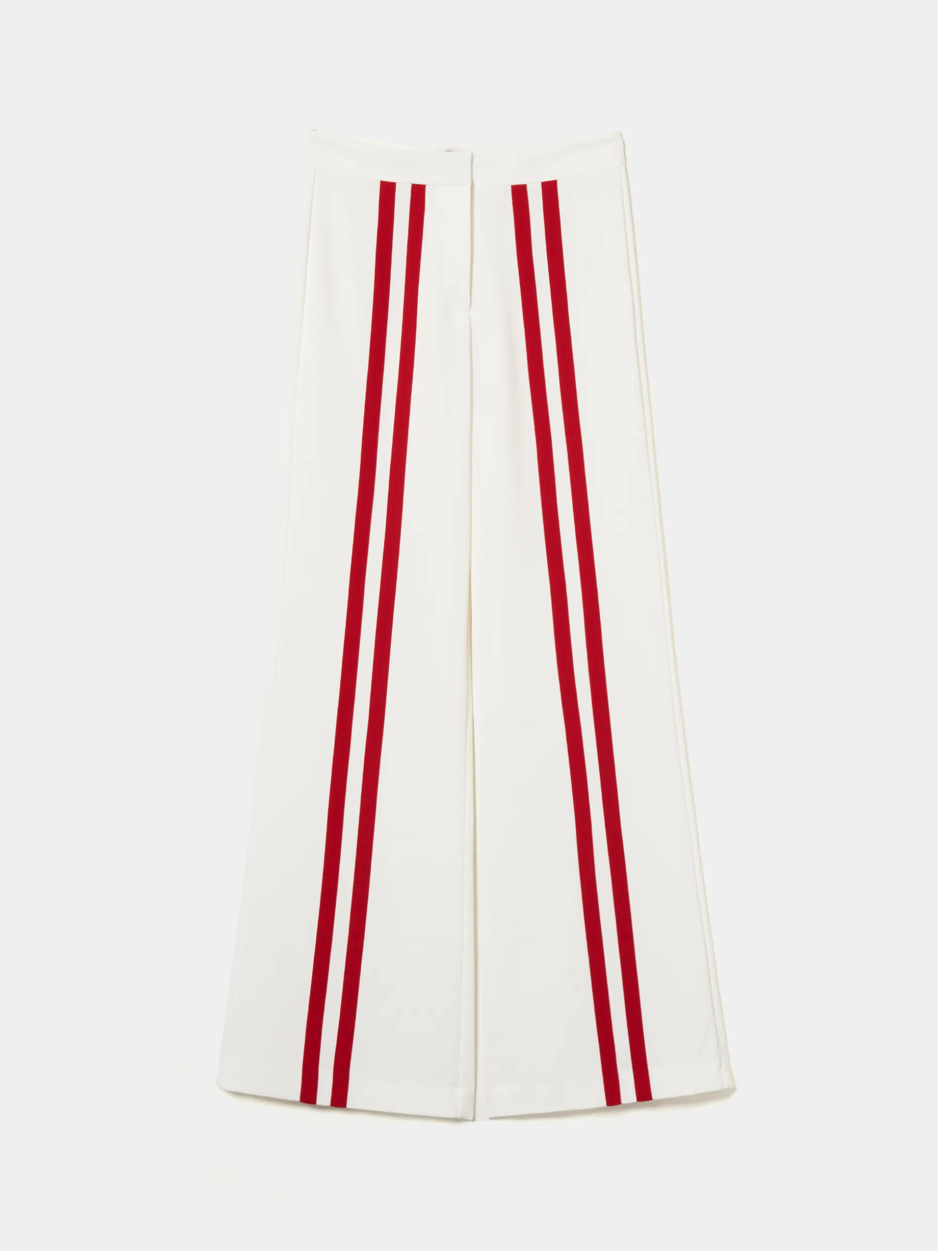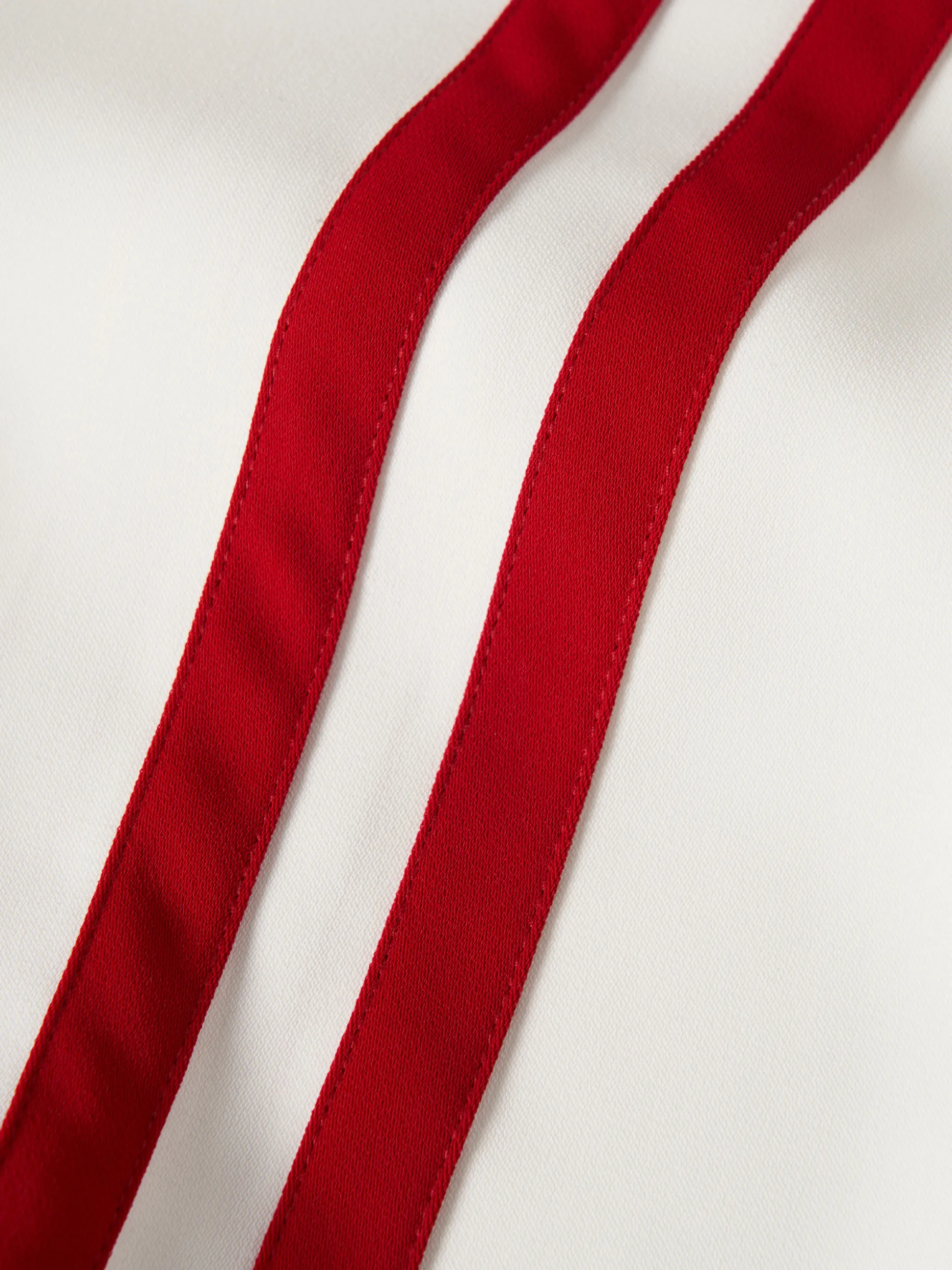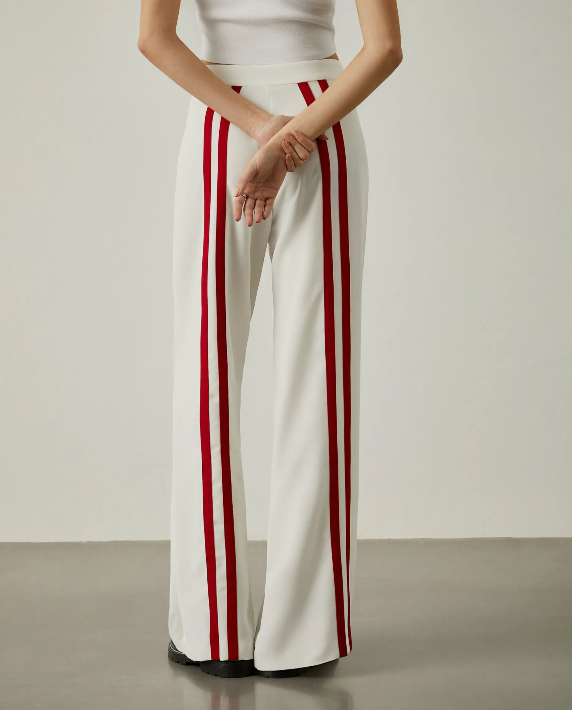 Calças loose fit com riscas vermelhas verticais em contraste. Confecionadas na totalidade em cupro, um material leve, macio, eco-friendly e sustentável. Para um total look, veja também a camisa cropped da mesma coleção. Uma peça Lion of Porches x Paatiff, produzida em Portugal e desenhada com recurso a ferramentas de inteligência artificial.