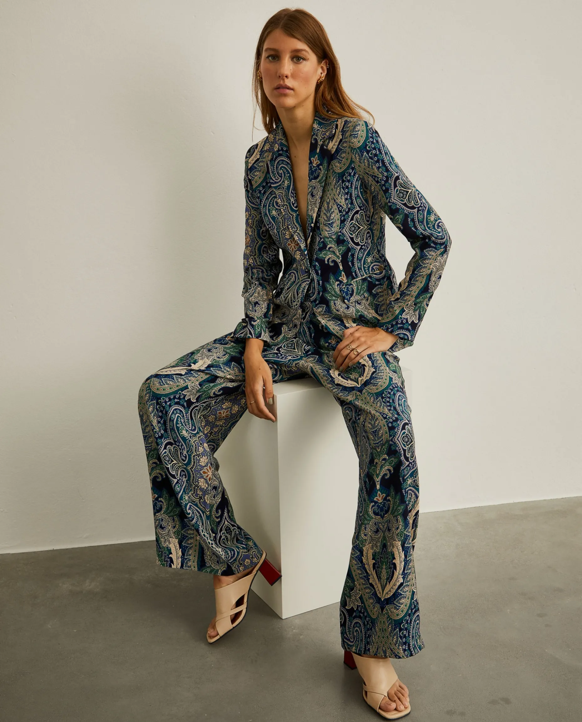Calças pantalona, de cintura elástica, com estampado de cornucópias para quem aprecia looks originais e mais arrojados. Para um total look, veja também o blazer da mesma coleção.