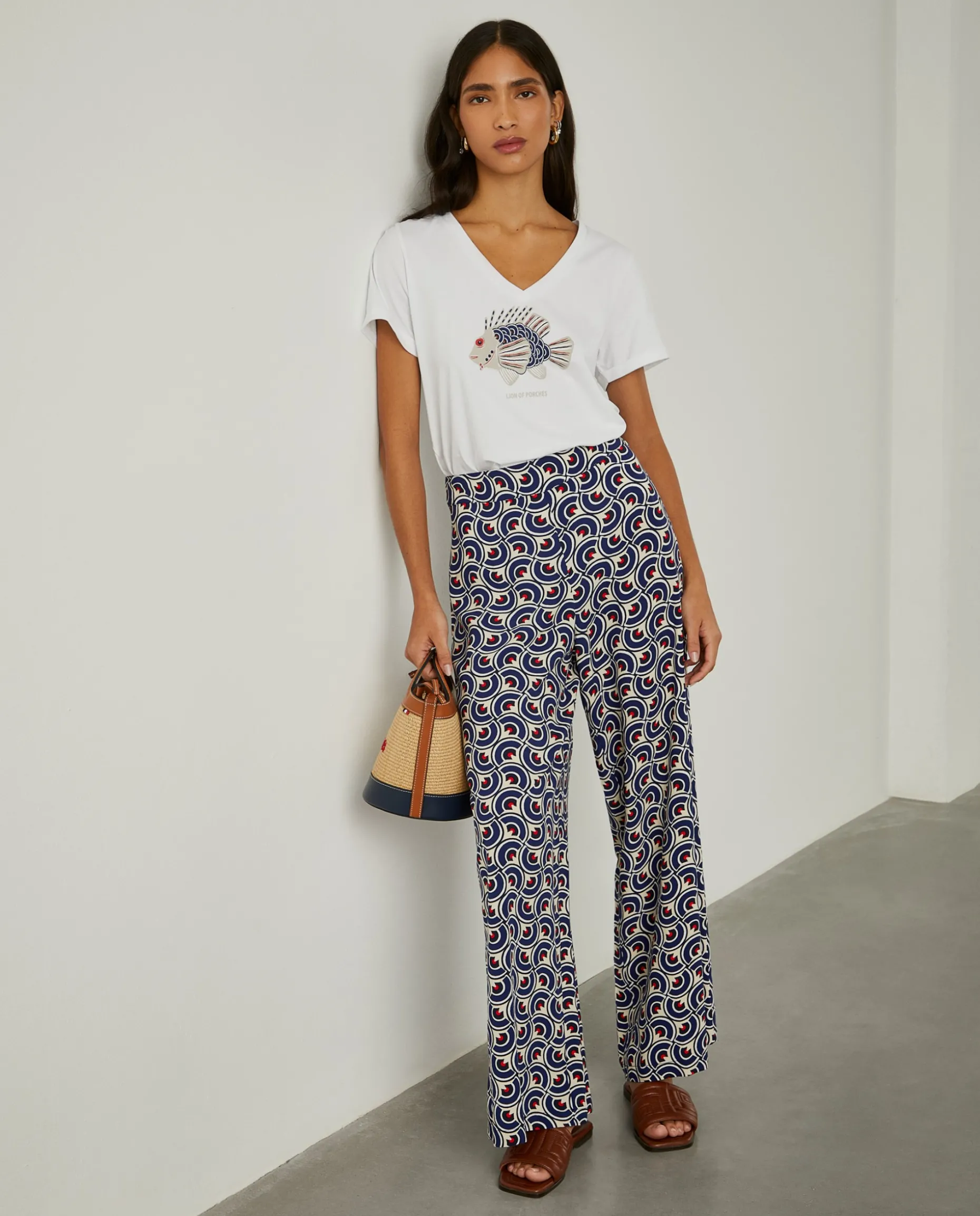 Se aprecia padrões originais e looks diferenciadores, veja estas calças pantalona com padrão geométrico all over. Apertam atrás com fecho invisível. Para um total look, veja também a blusa, o lenço ou o vestido camiseiro da mesma coleção.