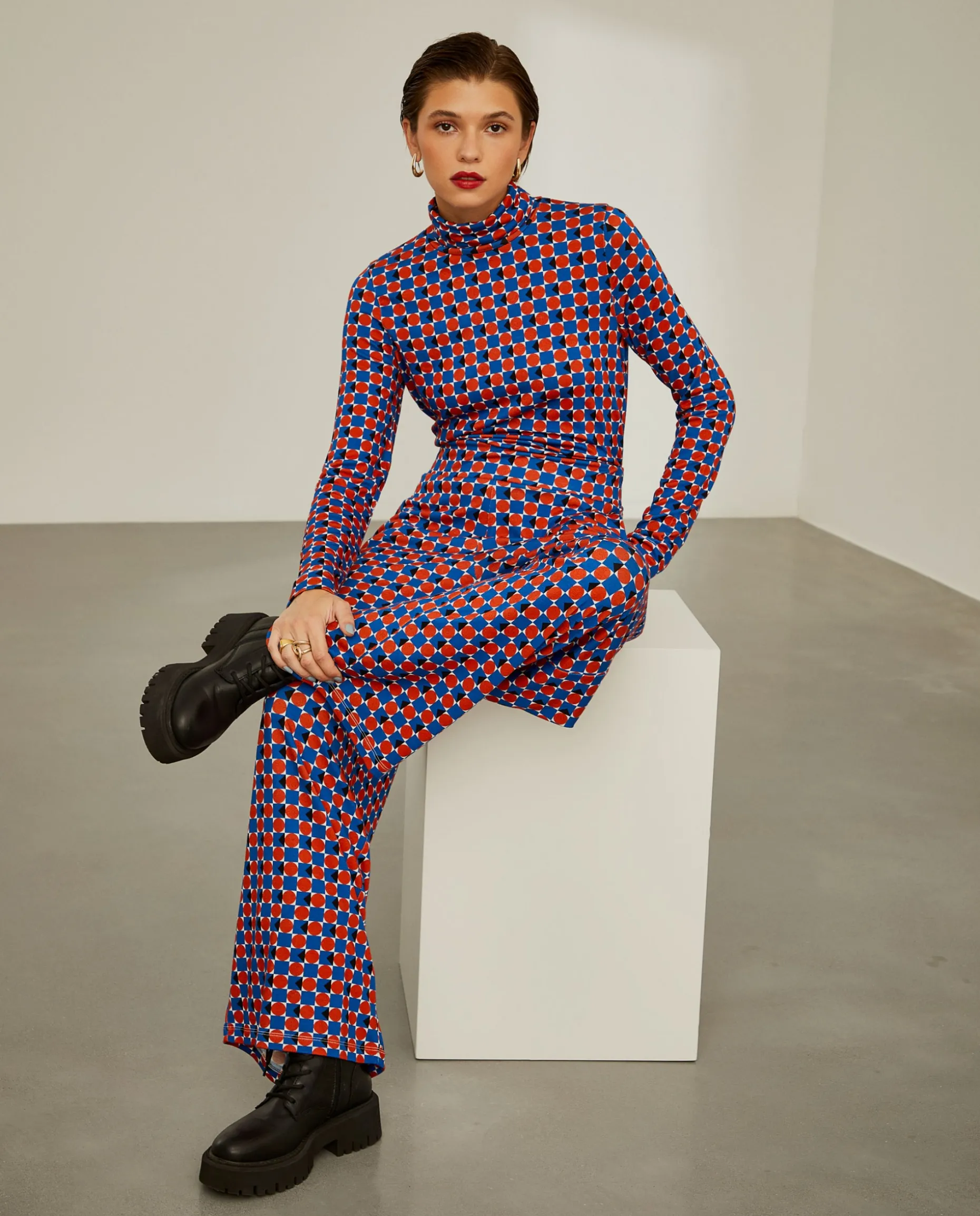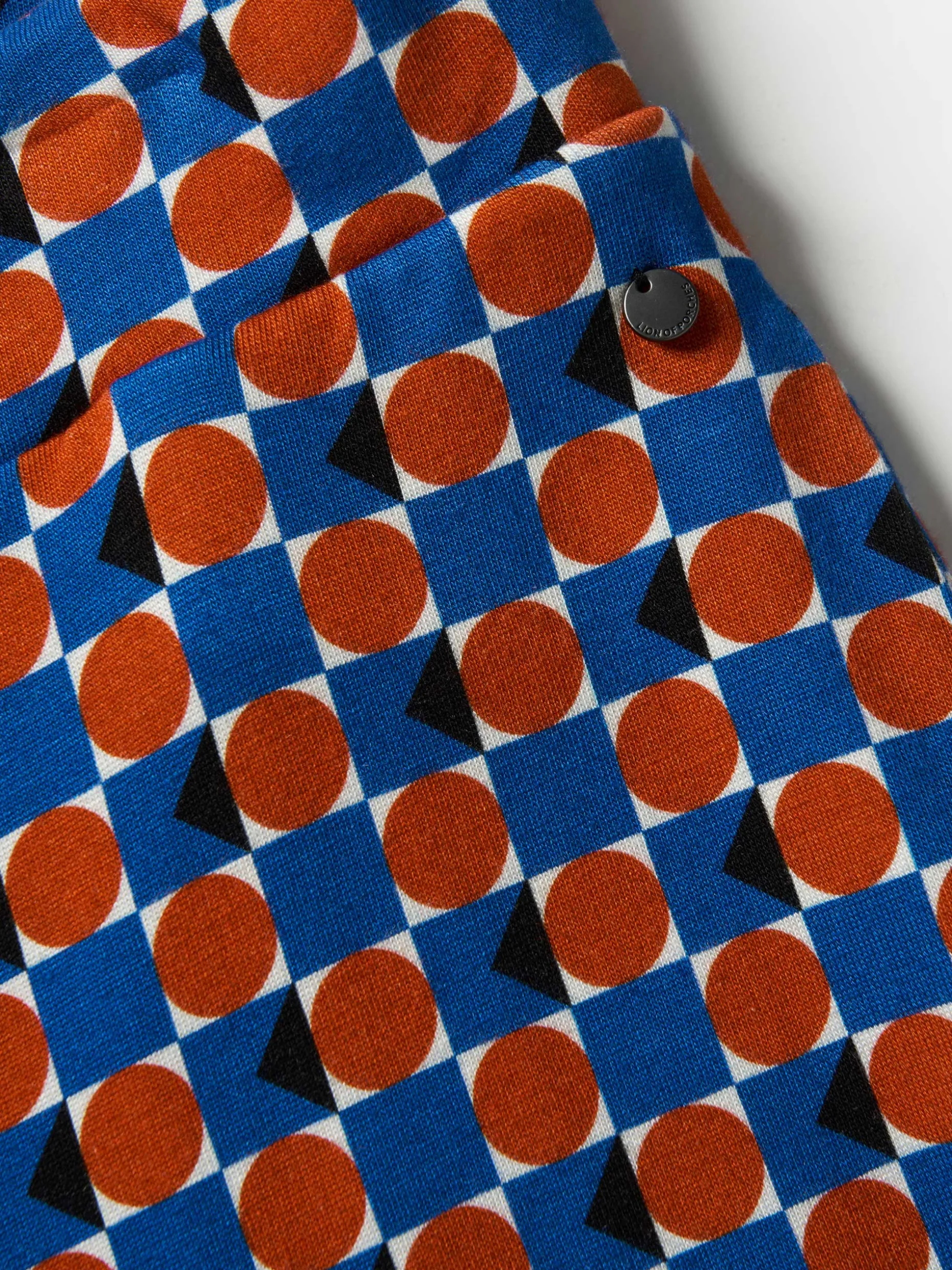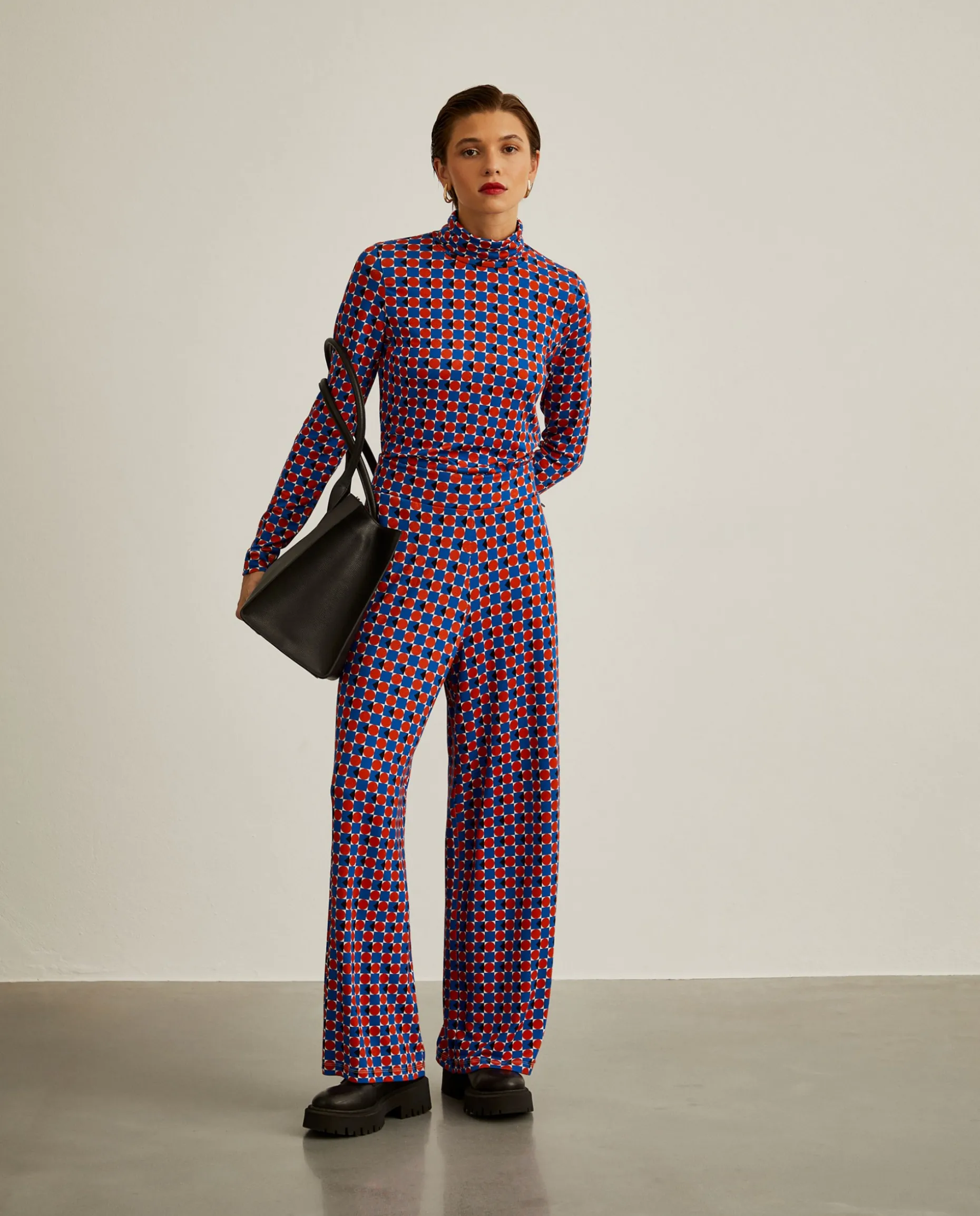 Calças de malha estilo pantalona, com padrão geométrico colorido all over. De cintura elástica, são perfeitas para a mulher que aprecia ser o centro das atenções. Para um total look, veja a camisola da mesma coleção.