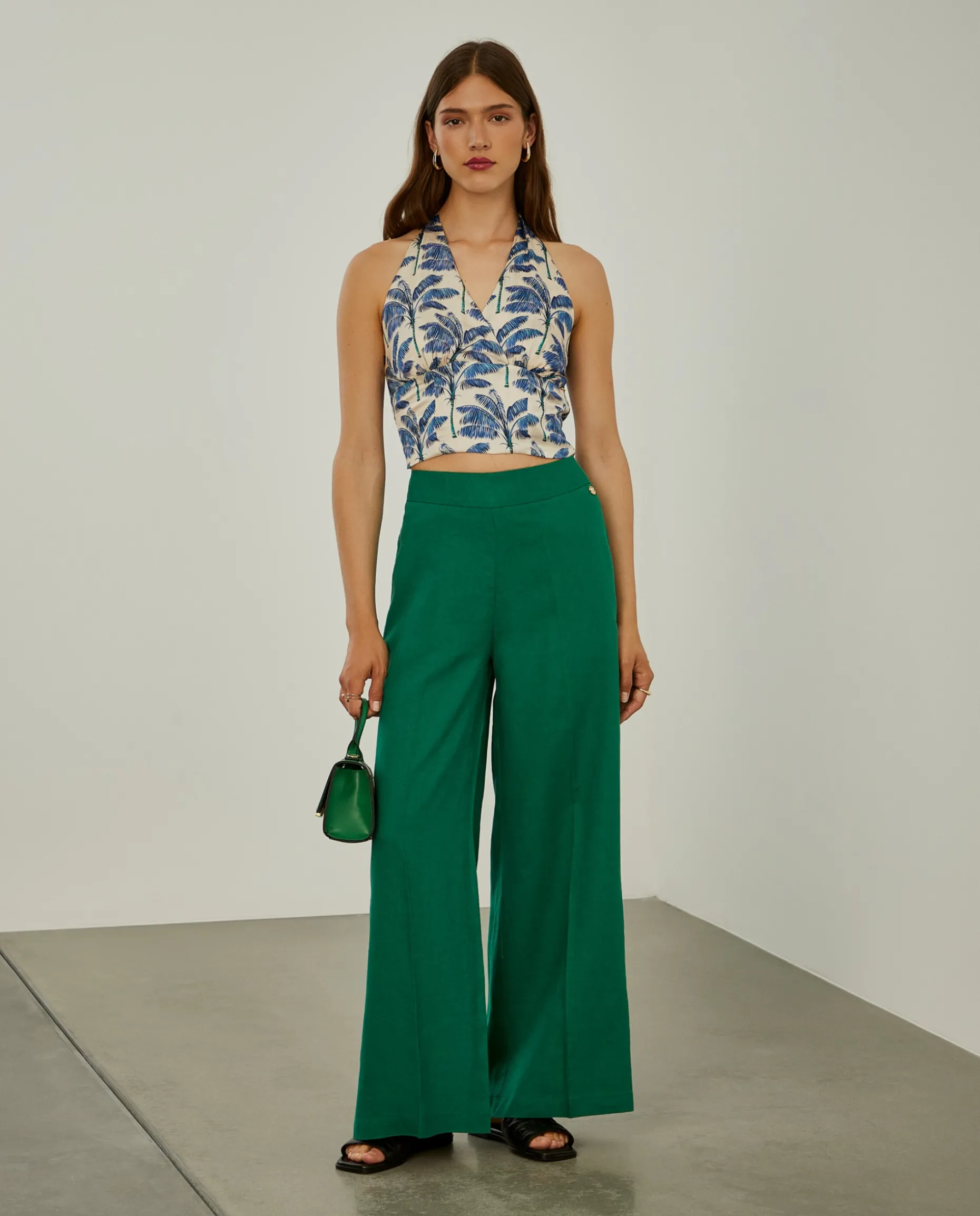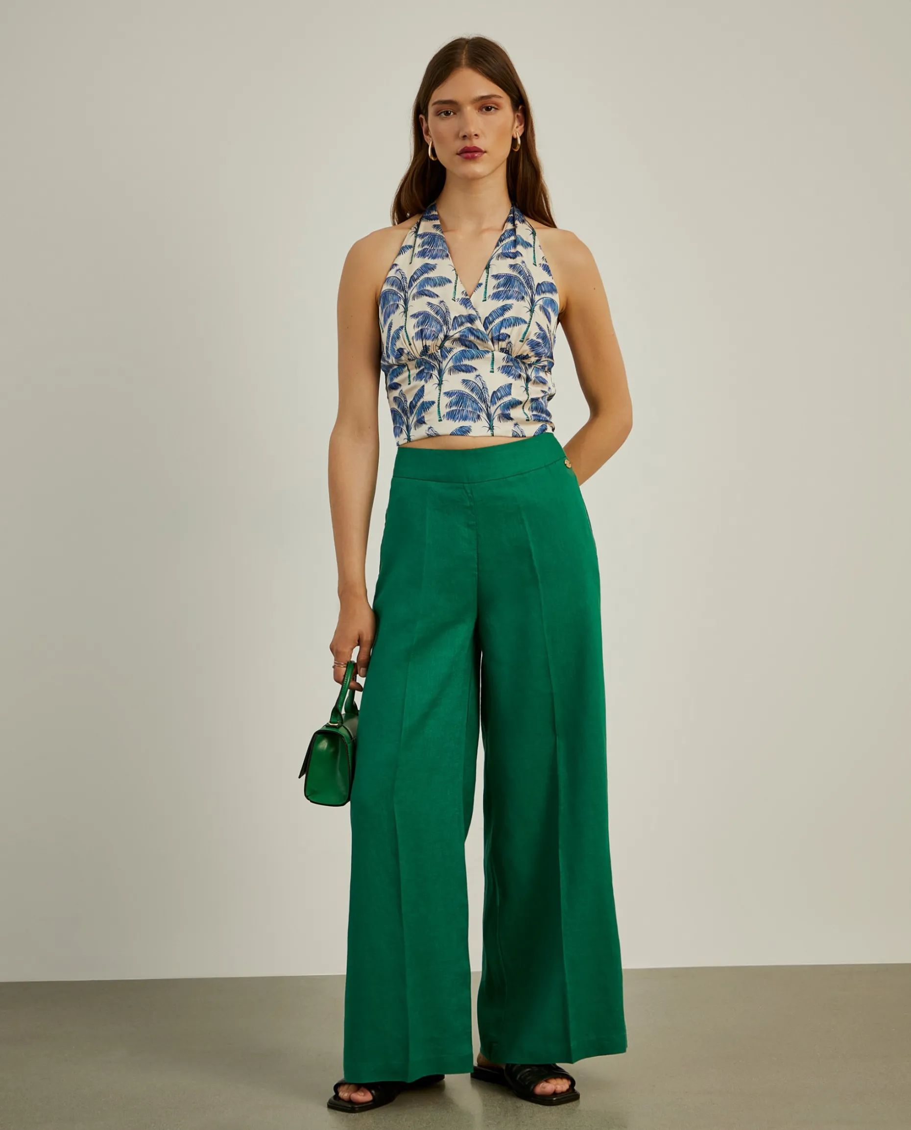 Calças pantalona vincadas, leves e elegantes, com aperto através de fecho invisível nas costas. São confecionadas num dos materiais preferidos das estações mais quentes, o linho, que confere à peça maior leveza, respirabilidade e durabilidade. Para um total look, veja também a camisa da mesma coleção.