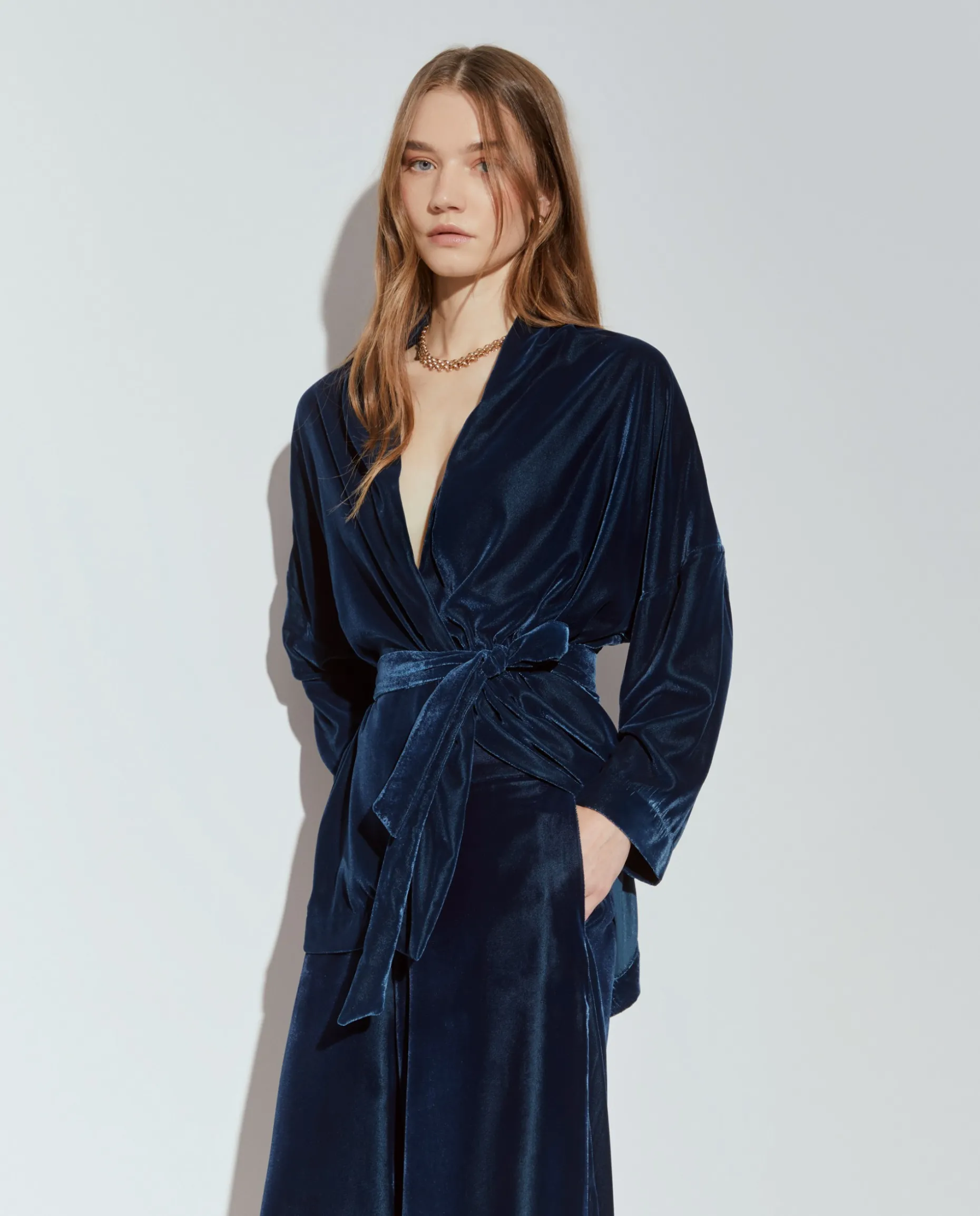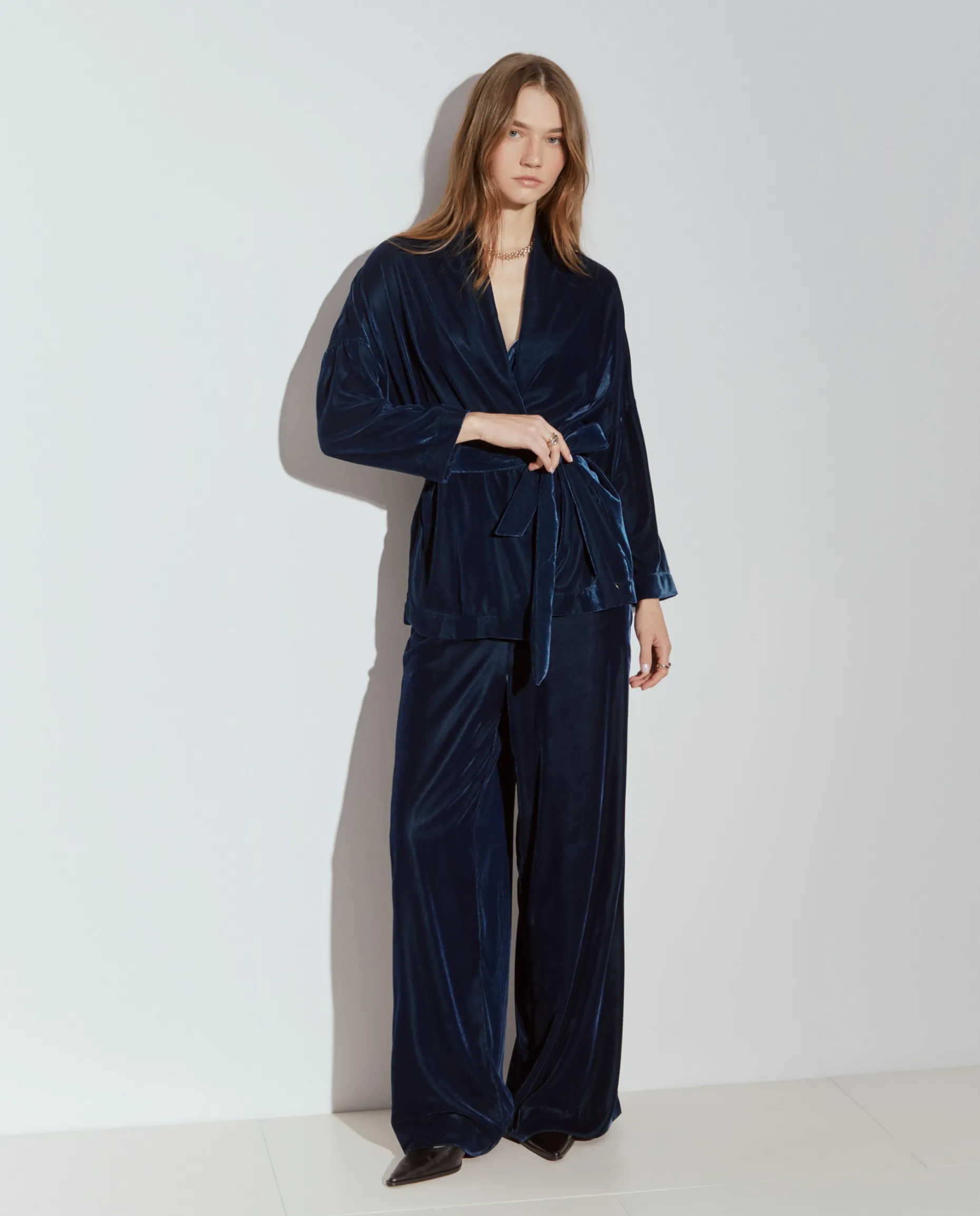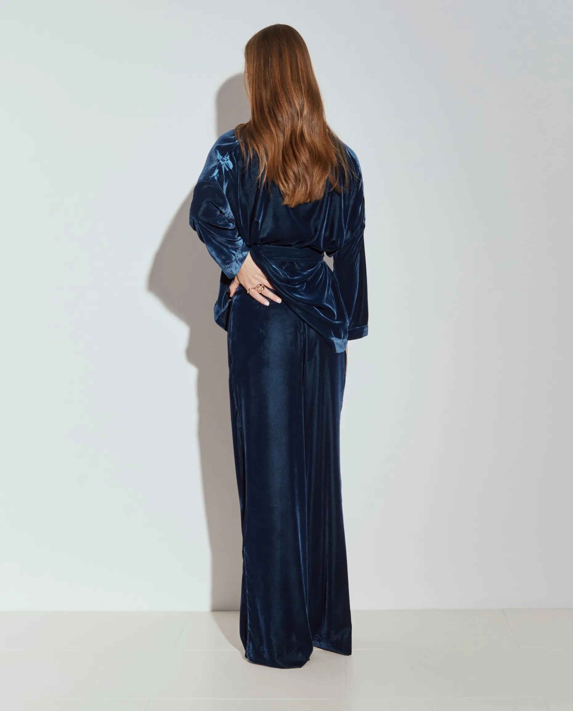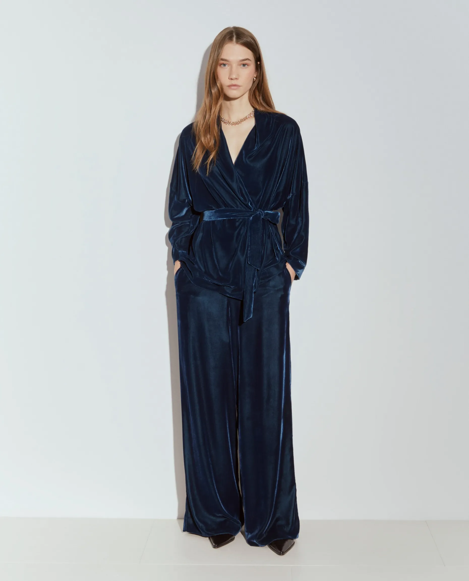 Estas calças pantalona em veludo destacam-se pela sofisticação e conforto. O tecido de veludo confere um toque luxuoso e uma textura suave, ideal para um look elegante em dias mais frios. Com um corte amplo e fluido, proporcionam liberdade de movimento e um caimento que alonga a silhueta. A cintura alta e ajustada cria um contraste harmonioso com o volume das pernas, adicionando um toque moderno ao visual. Fecho invisível atrás. Para um total look, veja também o blazer da mesma coleção.