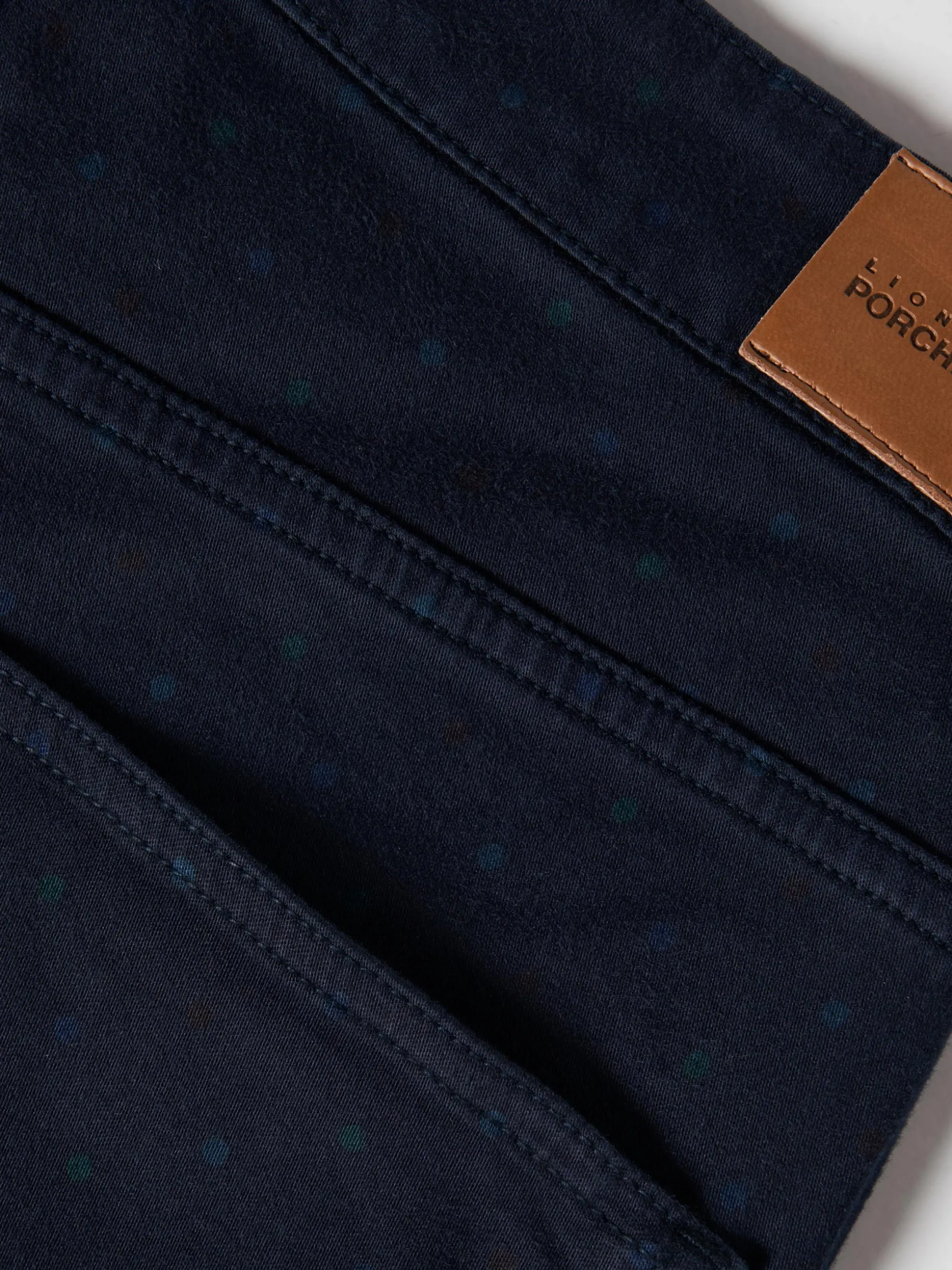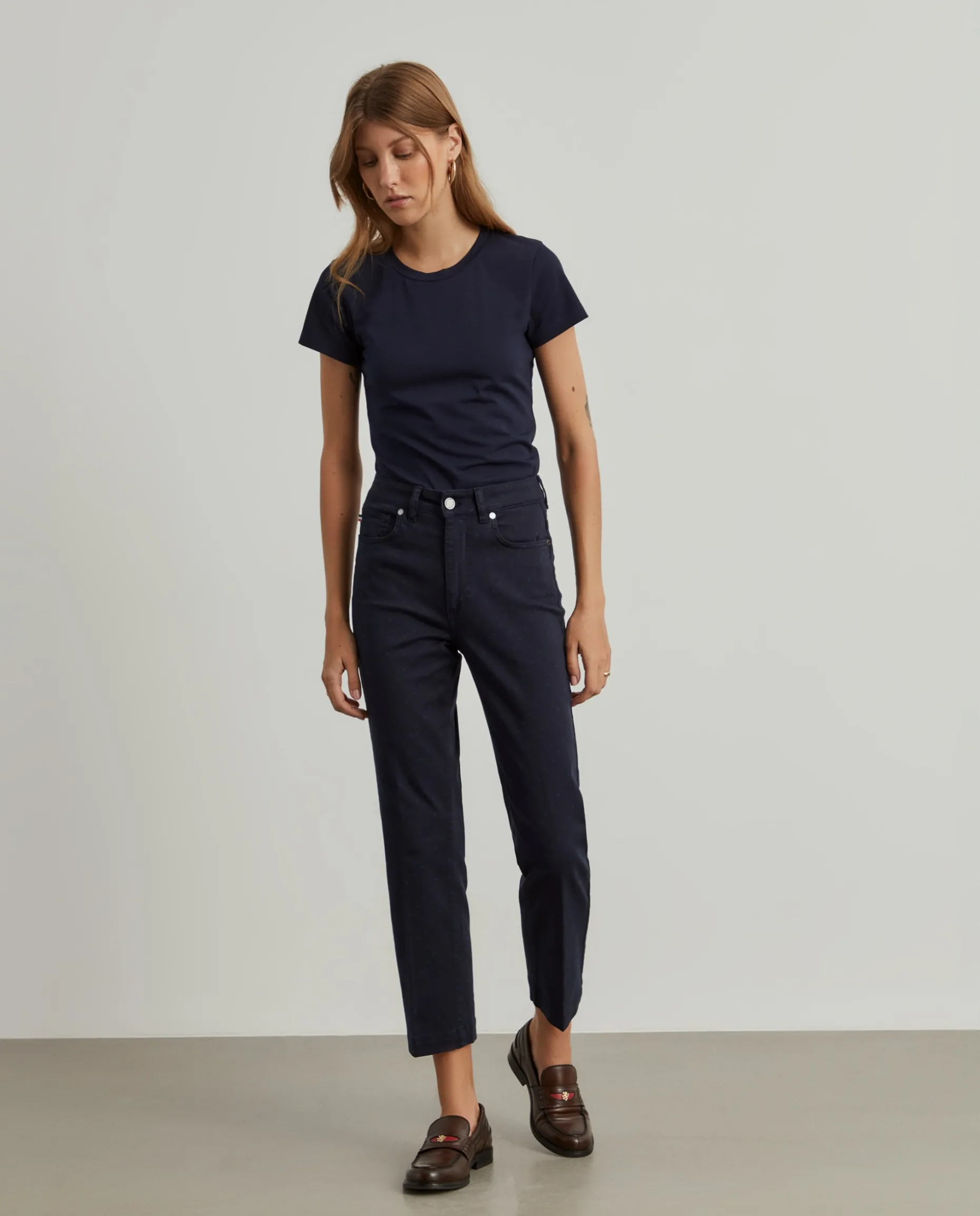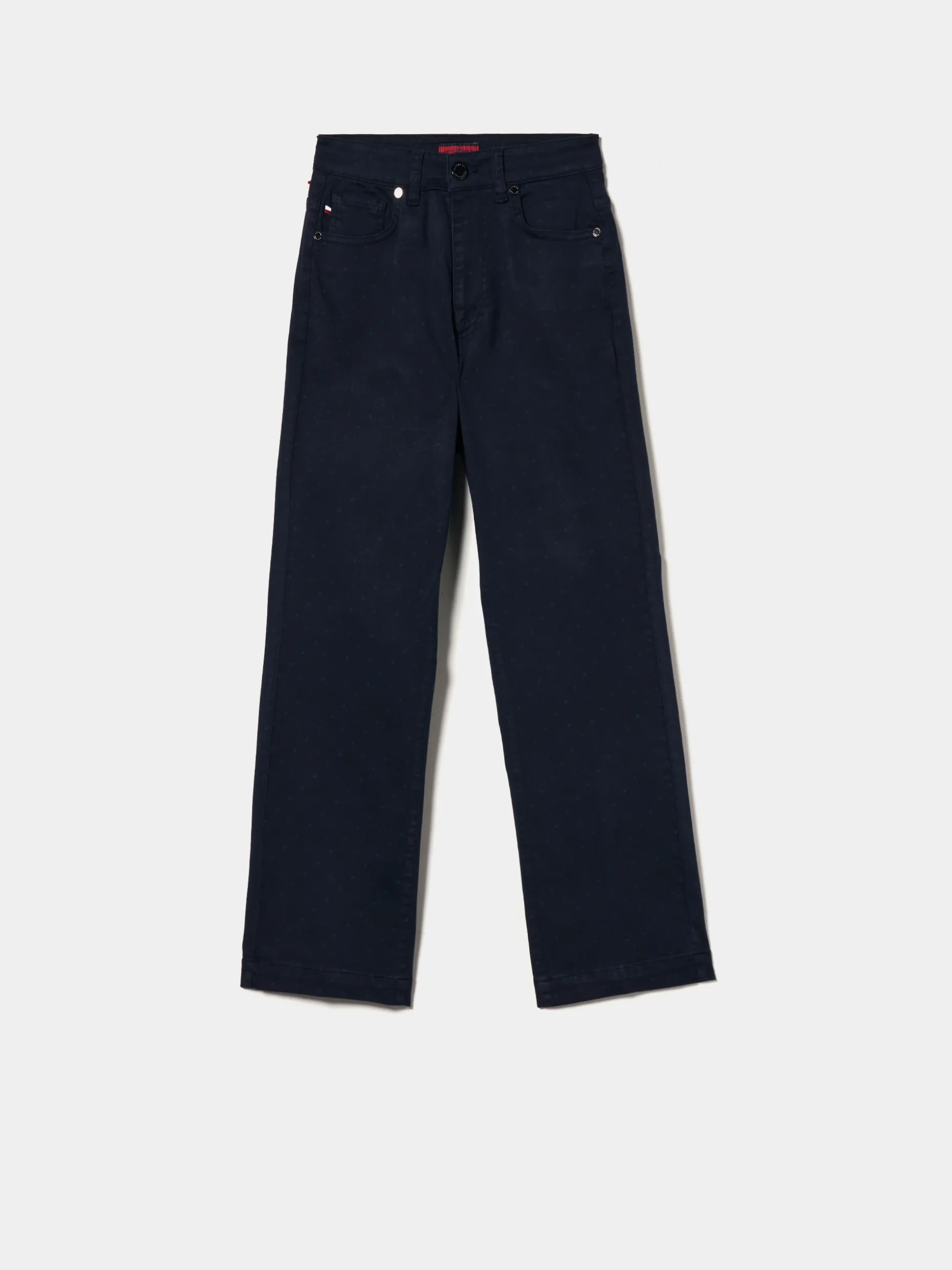 Calças polka dots, regular fit. Padrão de bolinhas subtil. Com abertura através de botão e fecho oculto por carcela. Bolsos frontais e traseiros.