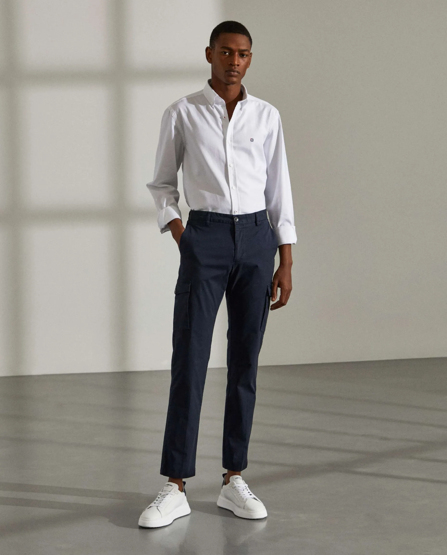 Calças Chino Regular Fit. Confecionadas com algodão stretch. Apertam com fecho e botão personalizado. Bolsos laterais, bolsos cargo com estampado personalizado “Lion Of Porches” e dois bolsos posteriores.