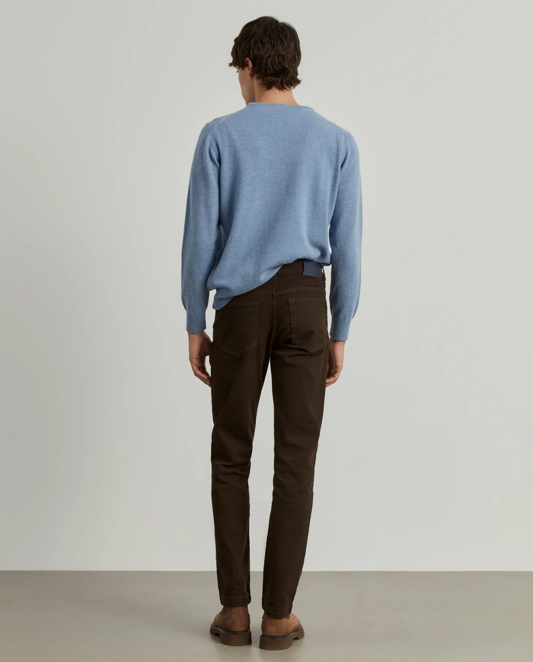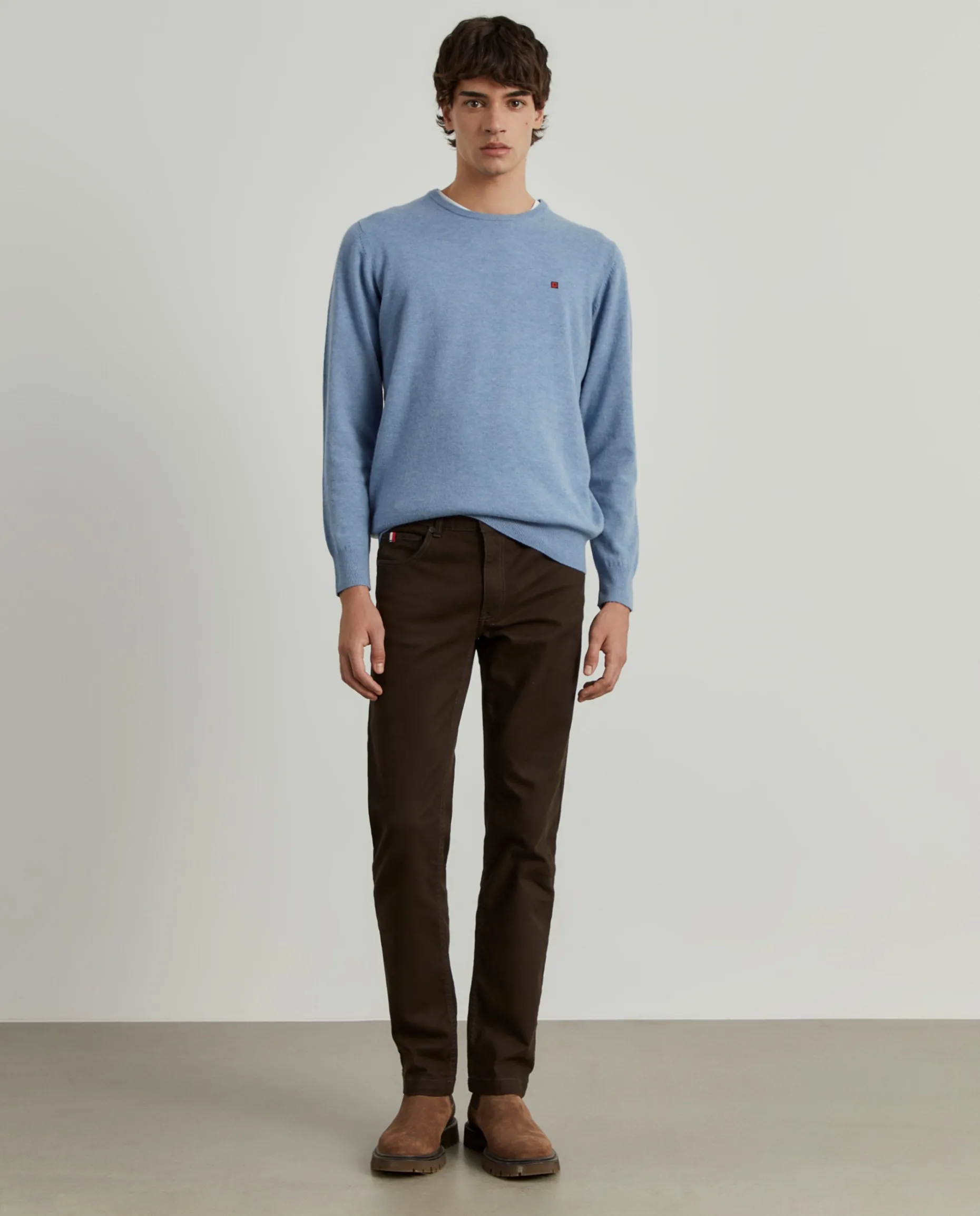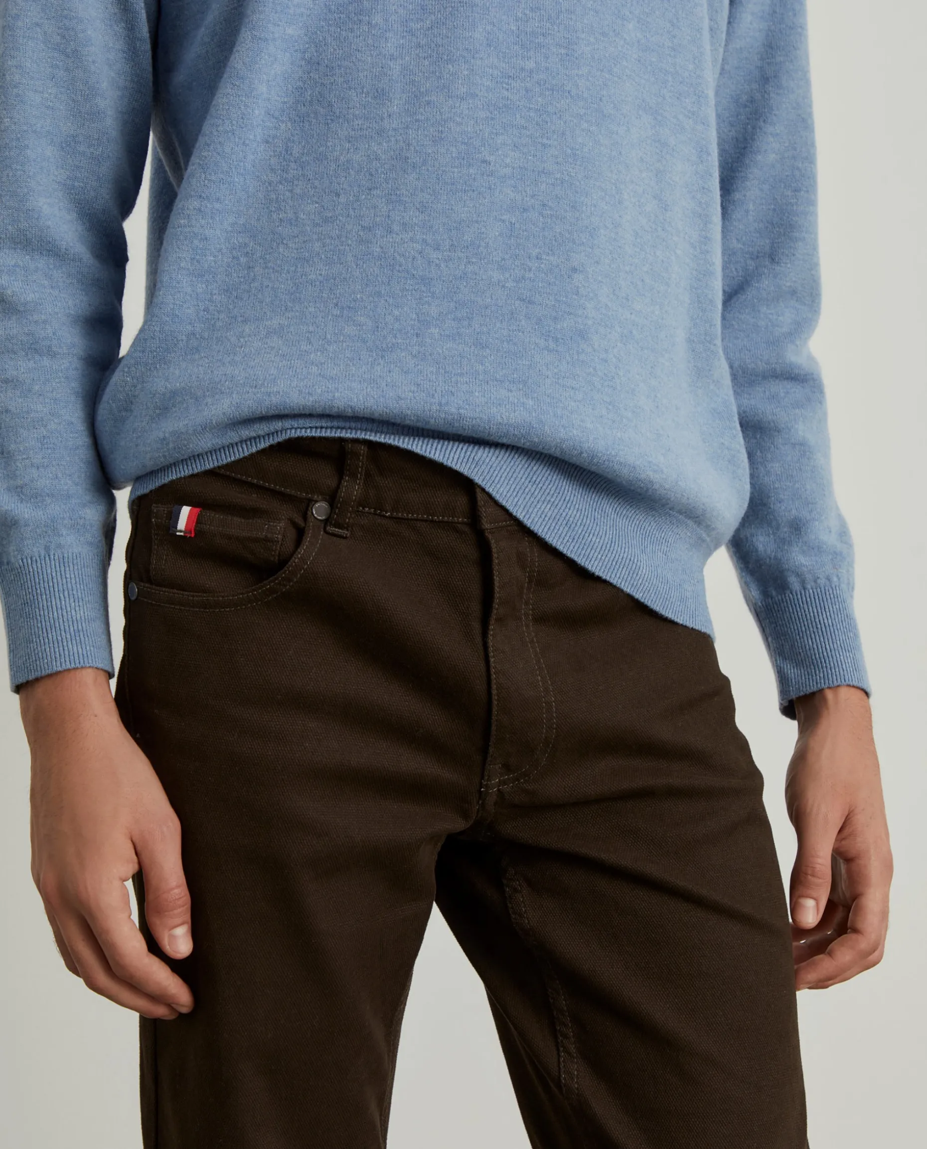 Calças Regular Fit com cinco bolsos. Botões e rebites personalizados. Etiqueta atrás no cinto “Lion Of Porches”. Fita tricolor no bolso de moedas.