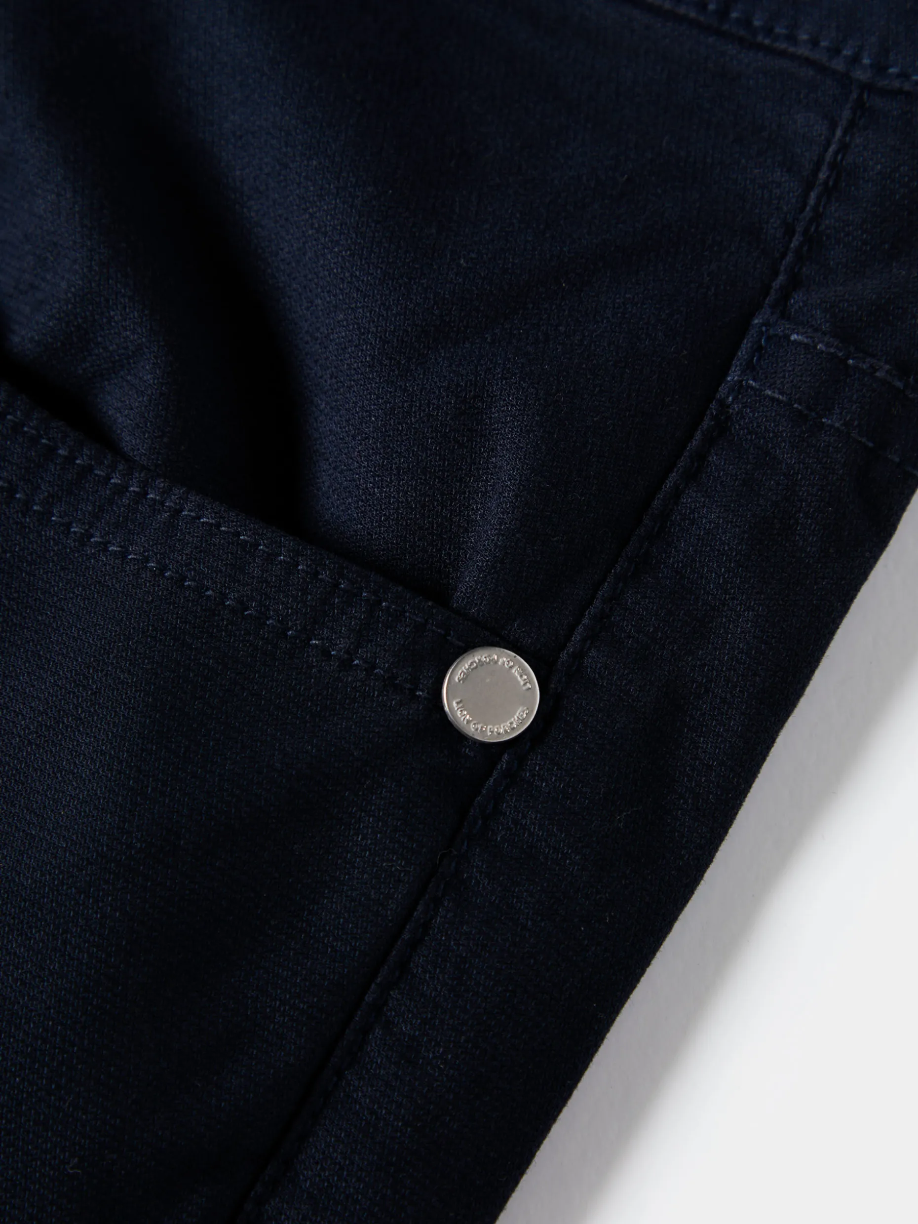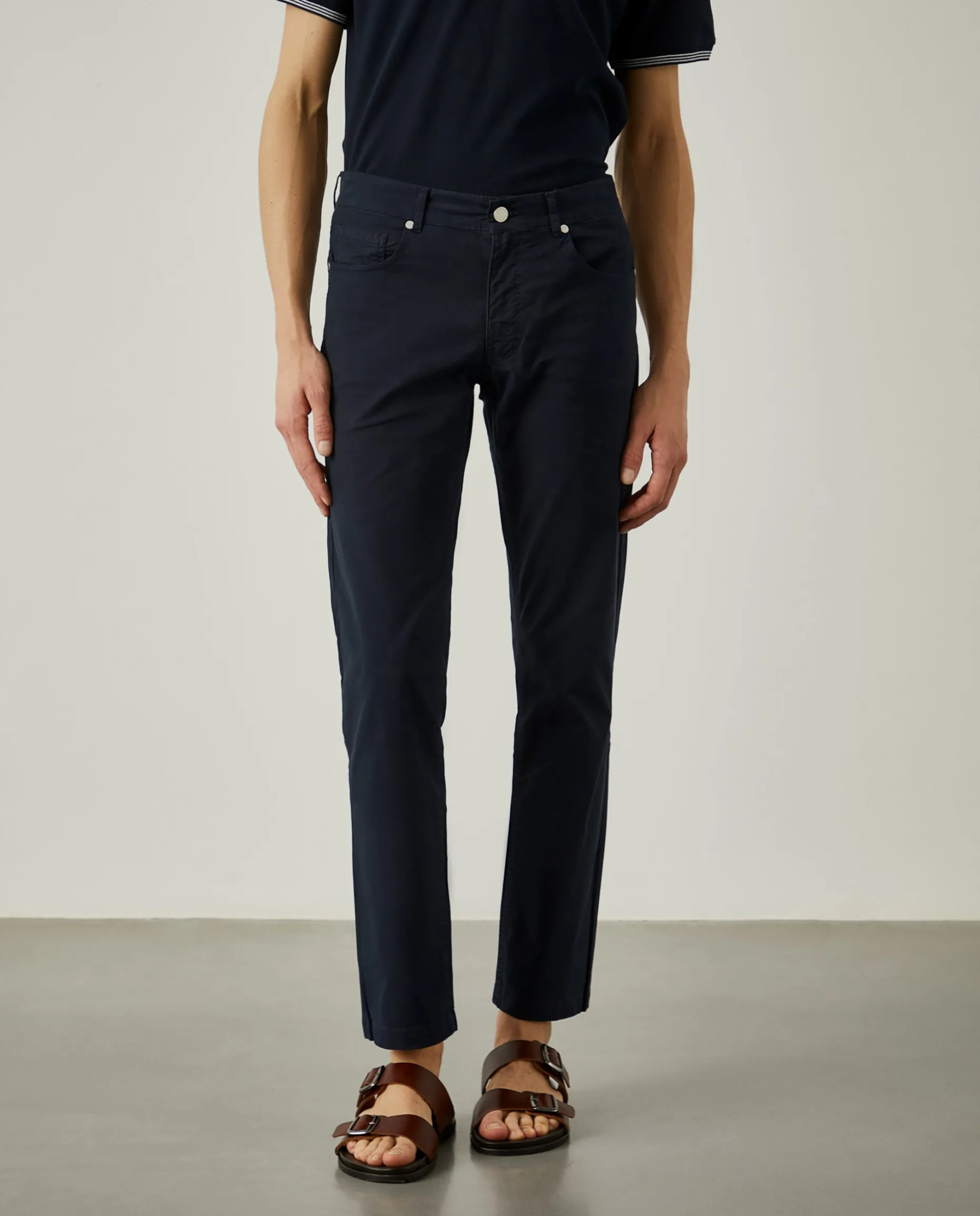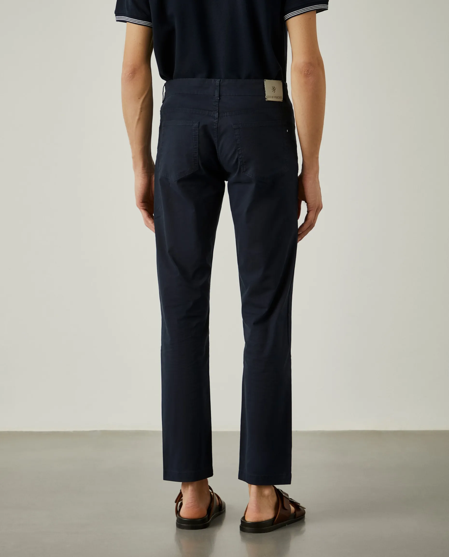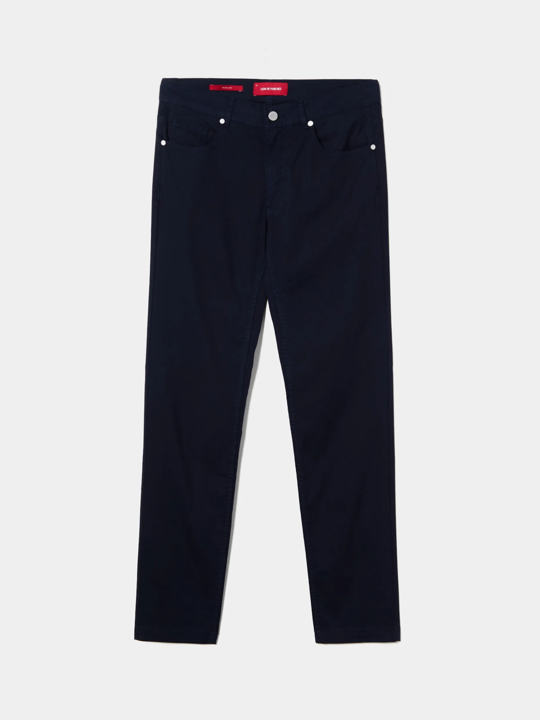 Calças de fit regular com cinco bolsos: três frontais (um pequeno para moedas) e dois traseiros. Aperta com botão e fecho de correr oculto por carcela. Finaliza com etiqueta Lion of Porches atrás no cinto.