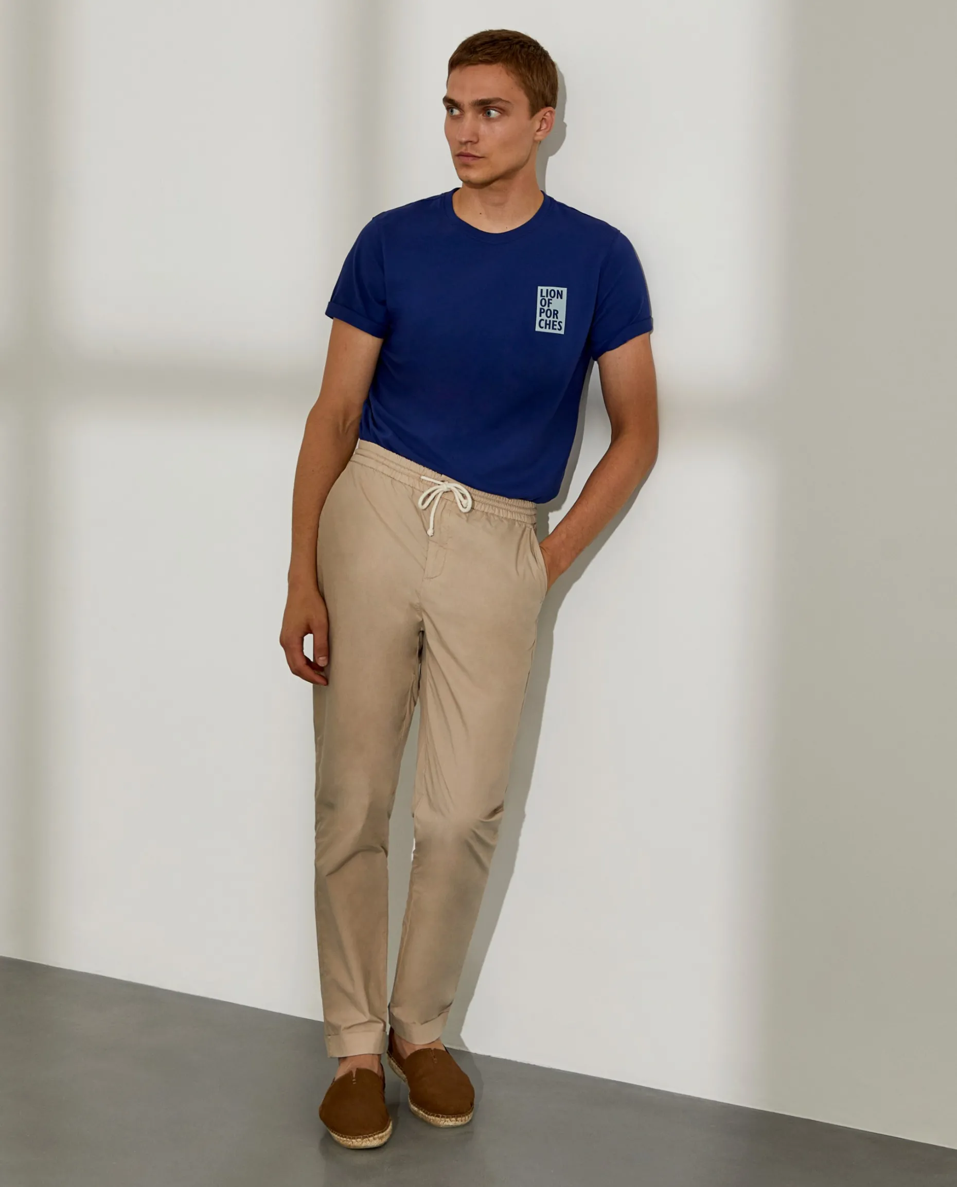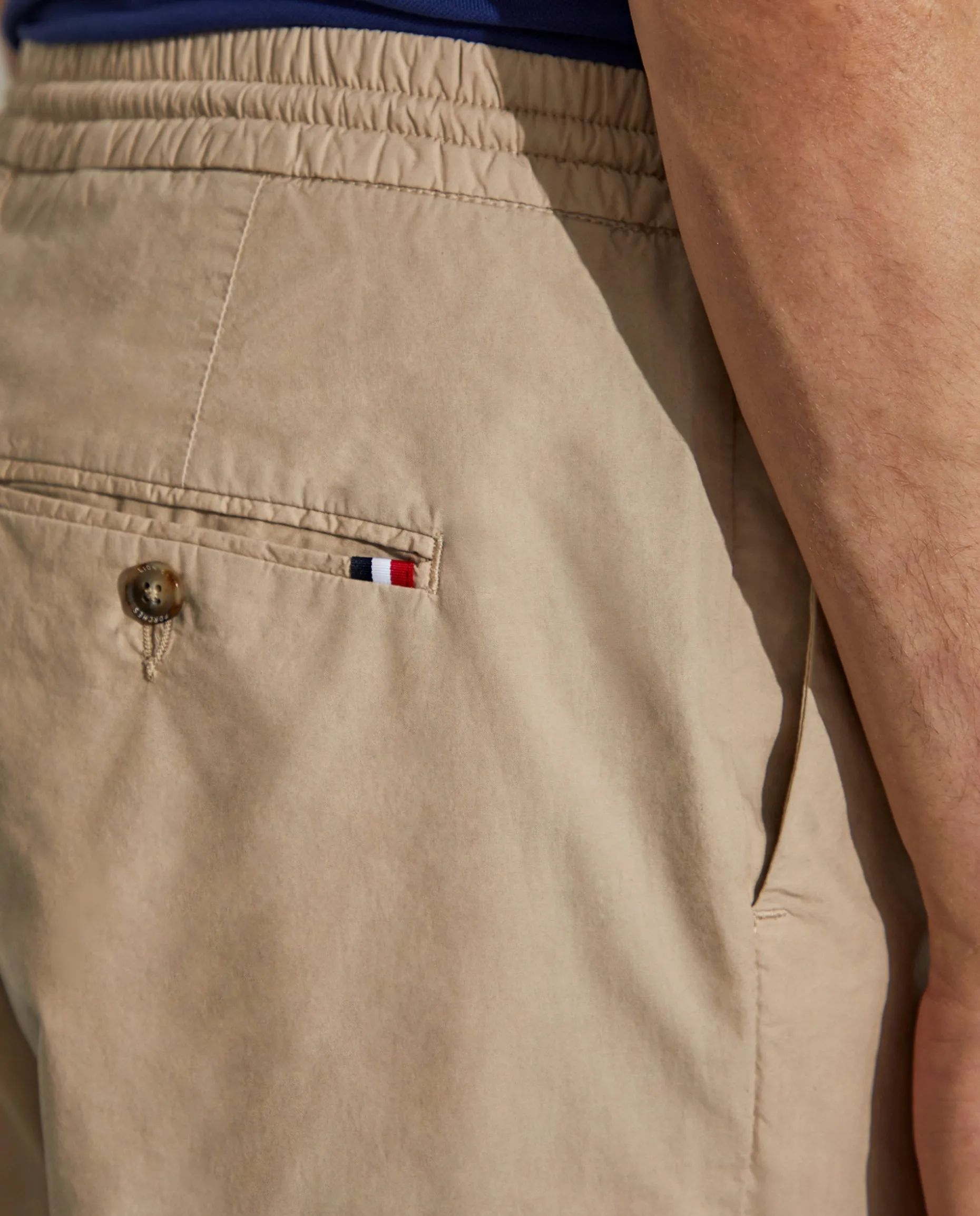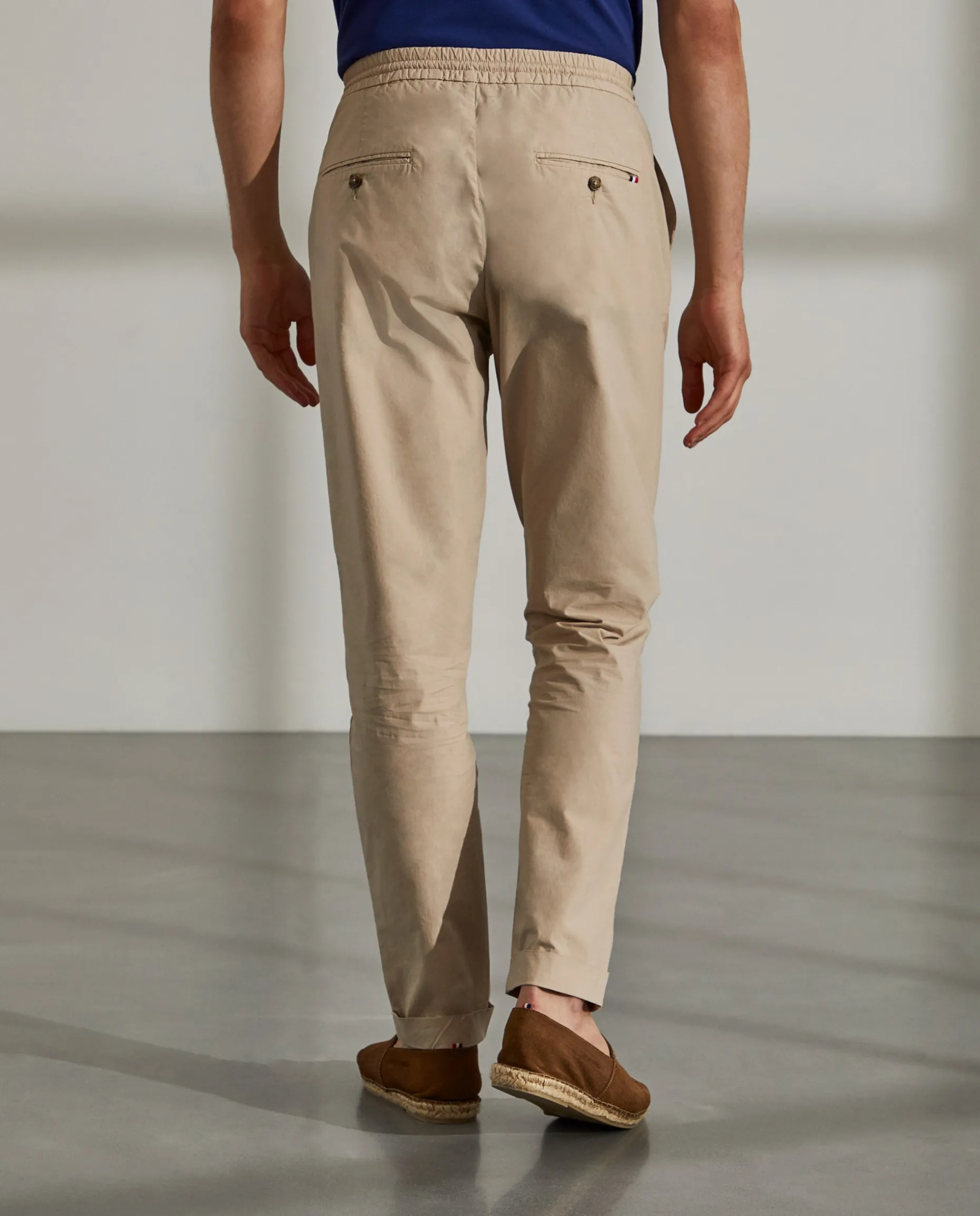Calças Regular Fit. Condecionadas em algodão. Cintura elástica com fecho, cordão e botão personalizado. Bolsos laterais e dois bolsos posteriores com fita decorativa no bolso direito.