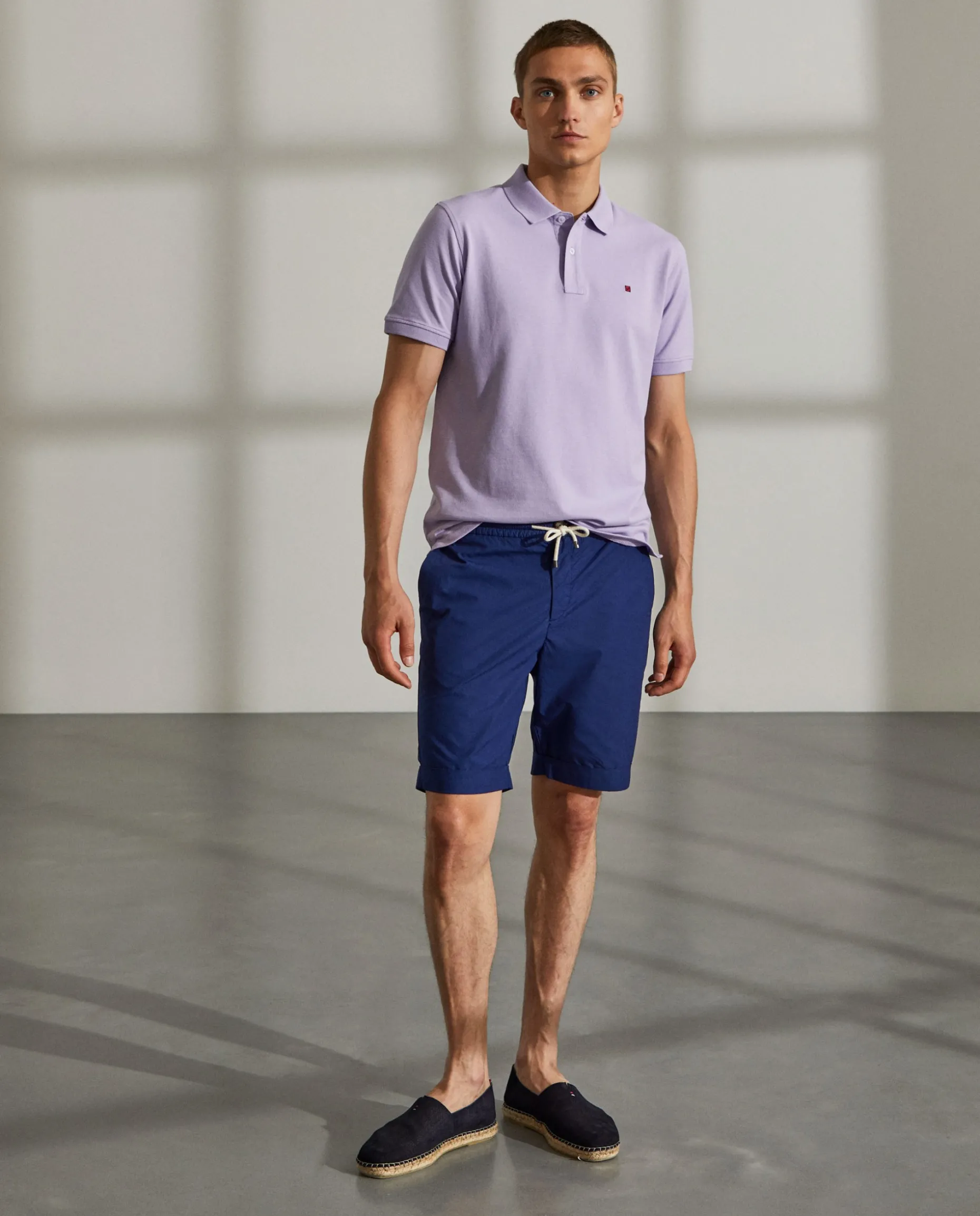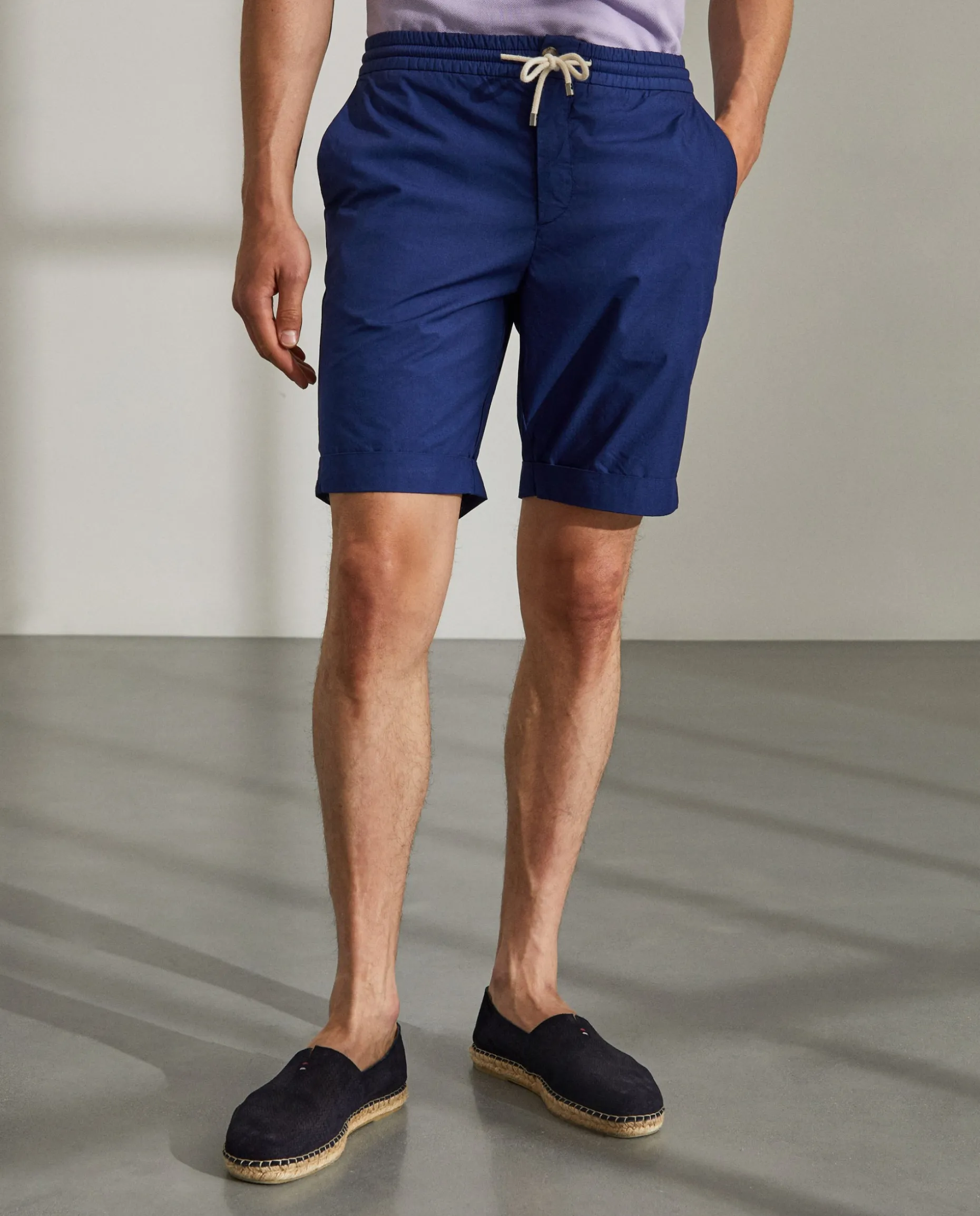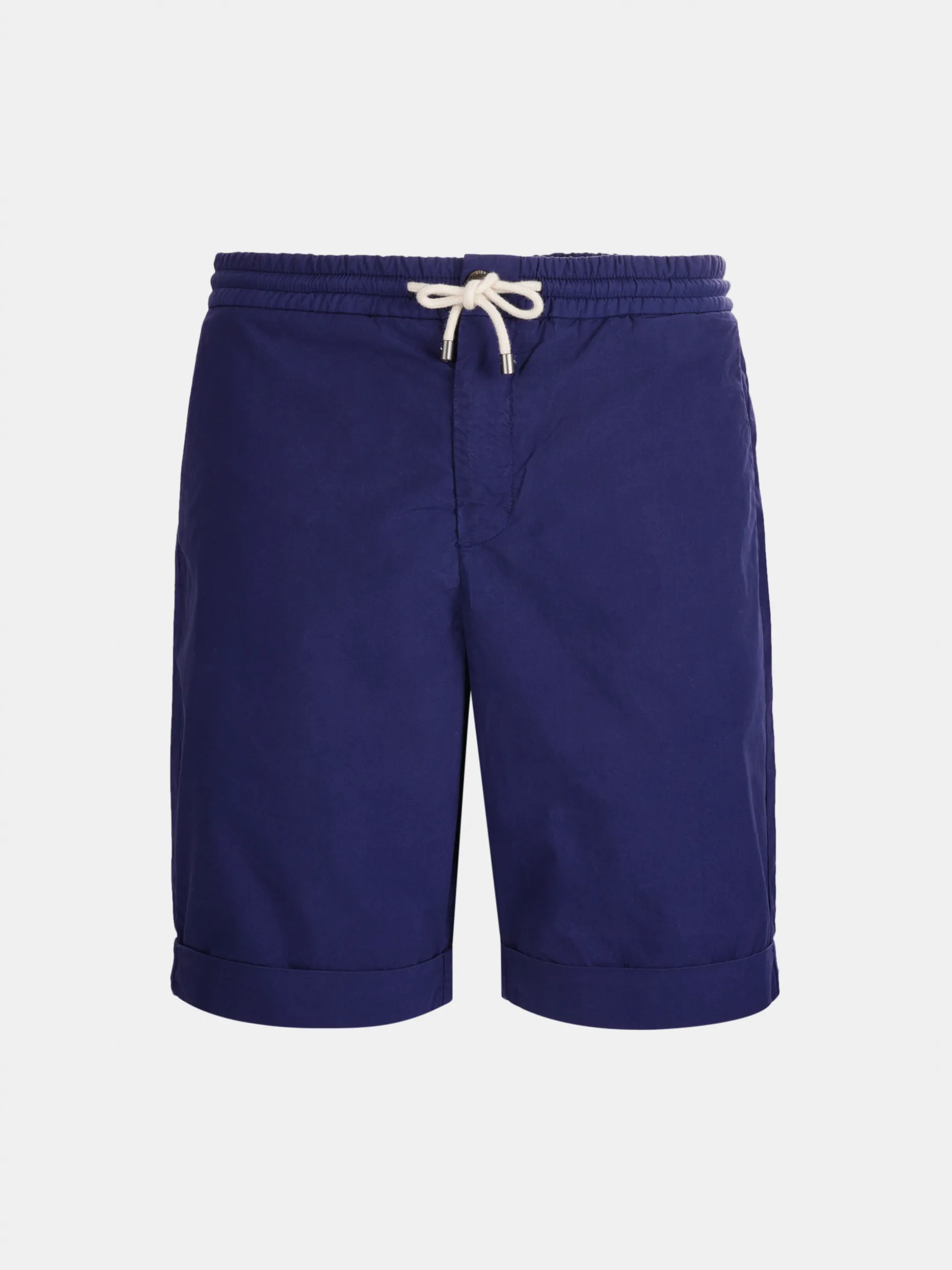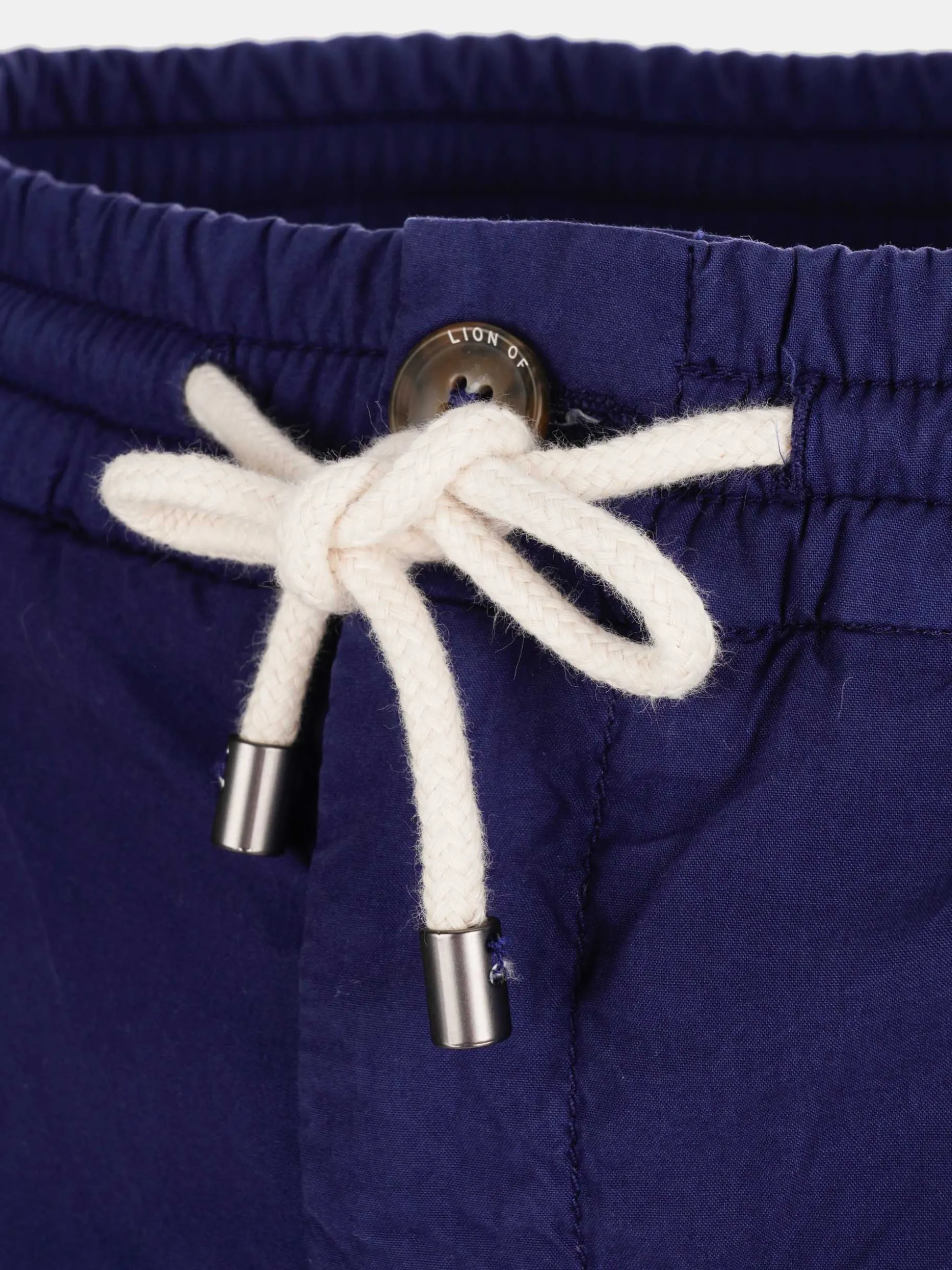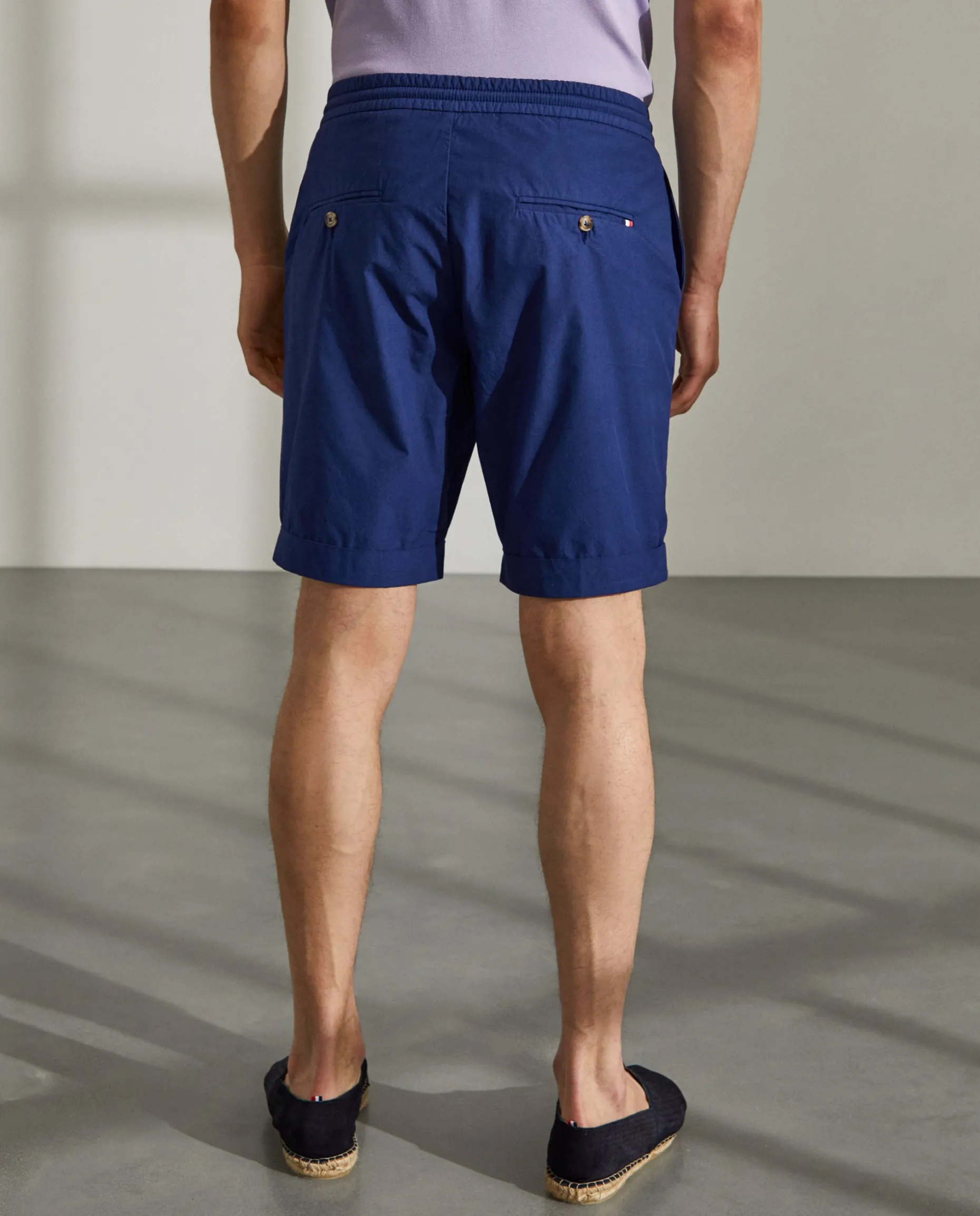 Bermudas confecionadas em algodão. Cintura elástica com fecho, cordão e botão personalizado. Bolsos laterais e bolsos posteriores com fita decorativa no bolso direito.