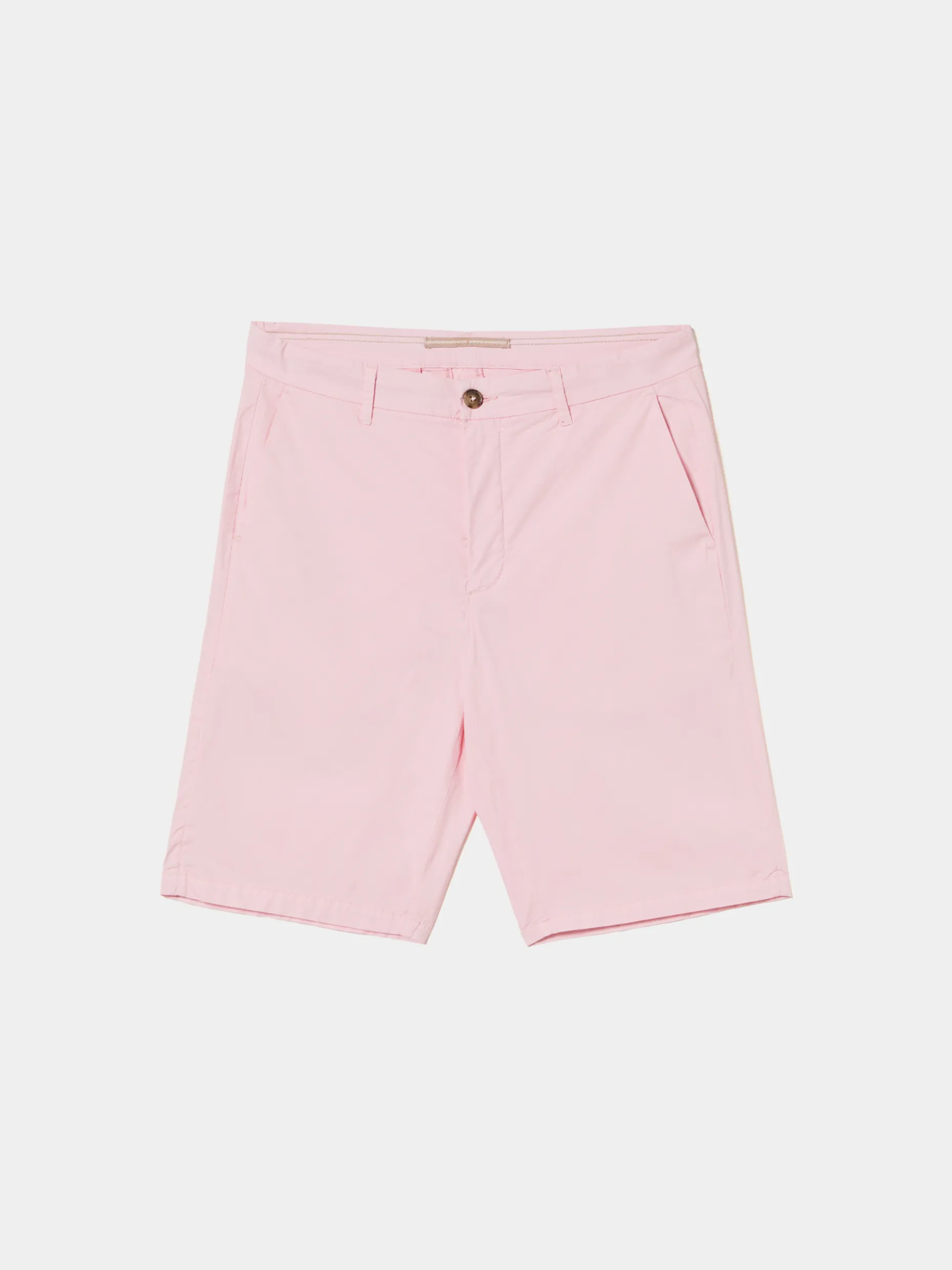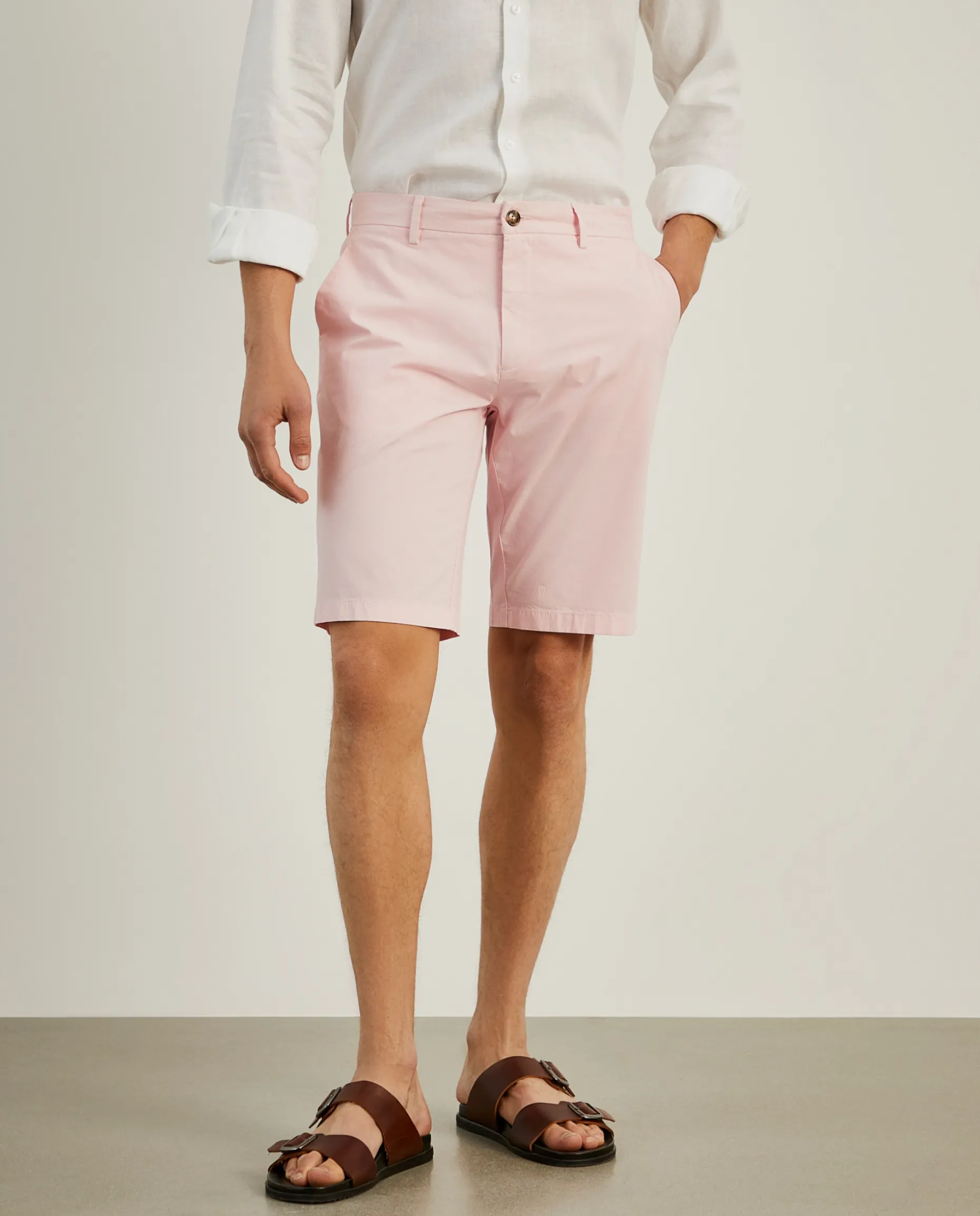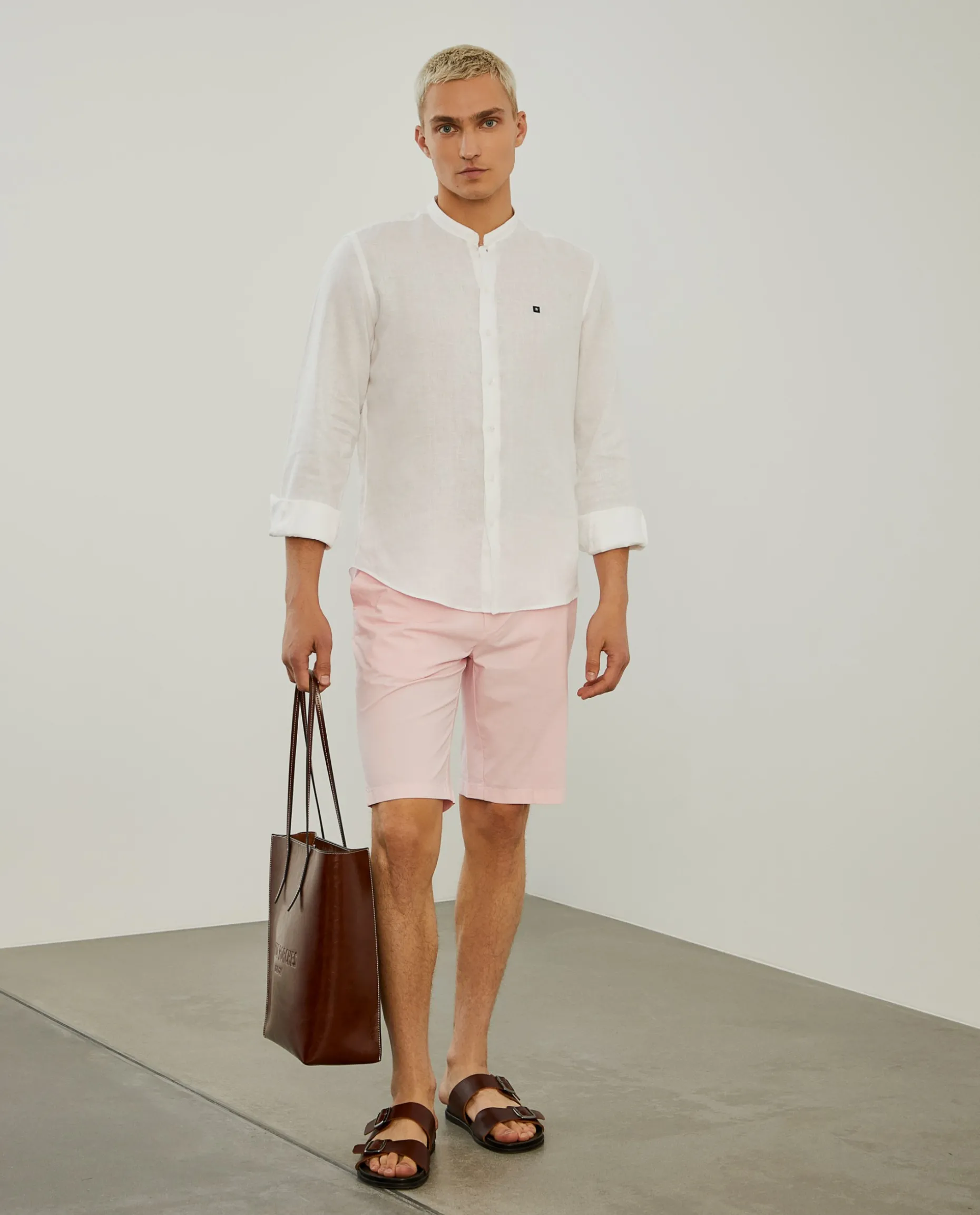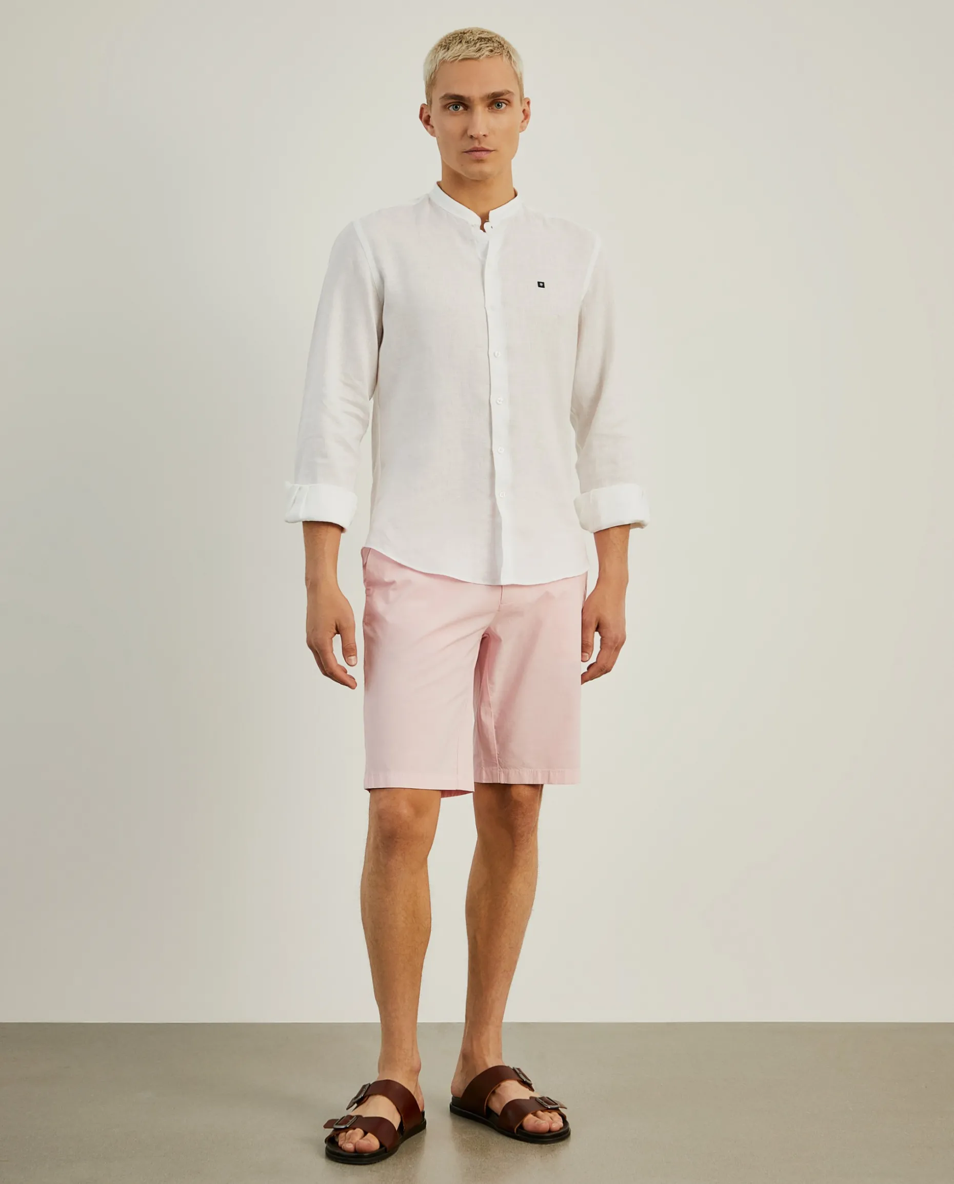 Um must-have de verão, estes calções bermuda são de cor lisa e têm bolsos laterais e traseiros. Apertam com botão e fecho de correr oculto por carcela. São confecionados em algodão com uma pequena percentagem de elastano para maior conforto e facilidade de movimento. Disponíveis em várias cores.