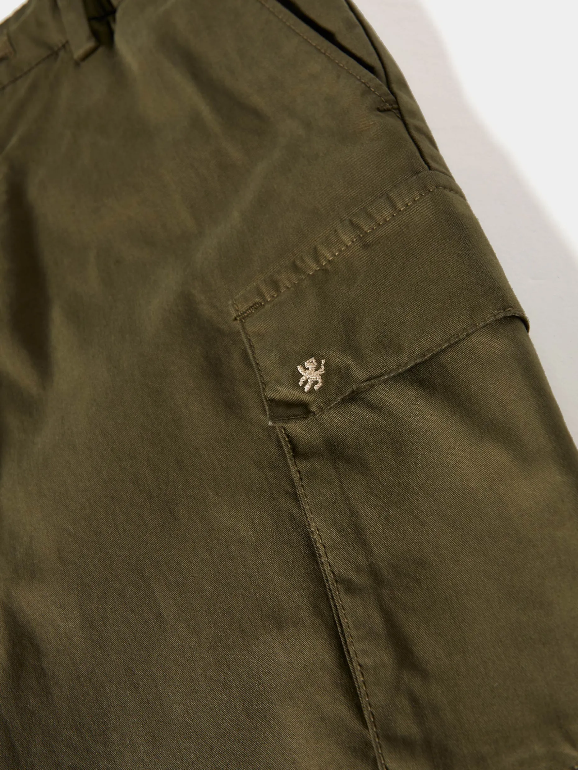 Calções cargo de sarja. Com bolsos de pala laterais, tem cintura elástica e aperto através de botão e fecho de correr, e ainda cordão no mesmo tom. Finaliza com pequeno leão bordado em contraste de cor no bolso. Atrás, também tem bolsos. É confecionado em algodão com uma pequena percentagem de elastano para maior conforto e facilidade de movimentos.