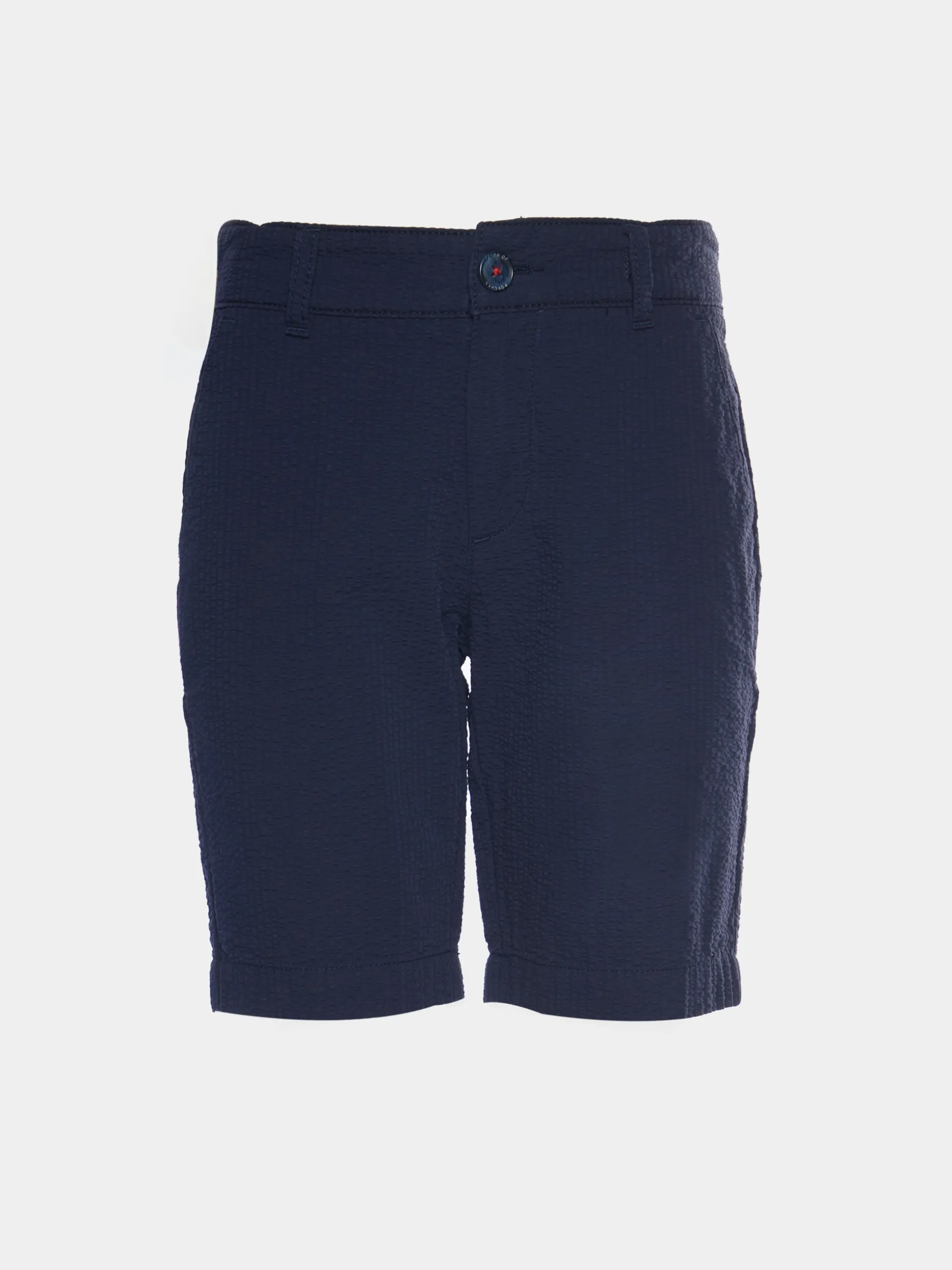 Calções chino em tecido enrugado. Botões personalizado cosidos em contraste. Detalhe da fita de riscas bicolor no bolso de trás.