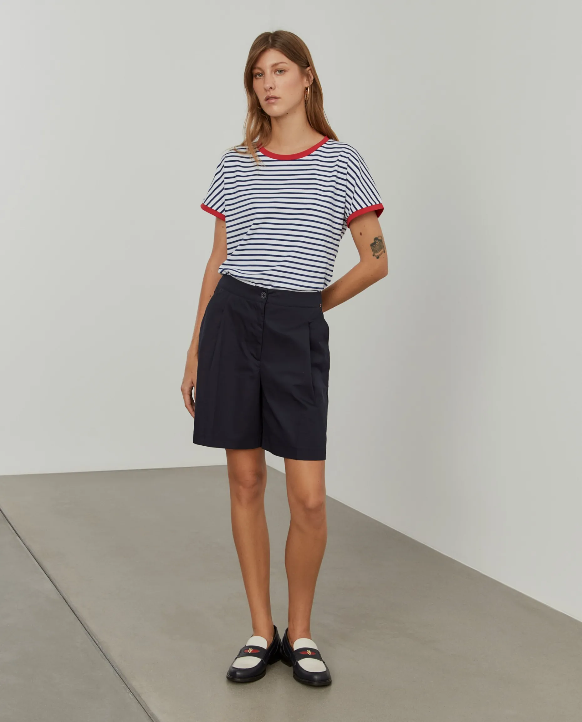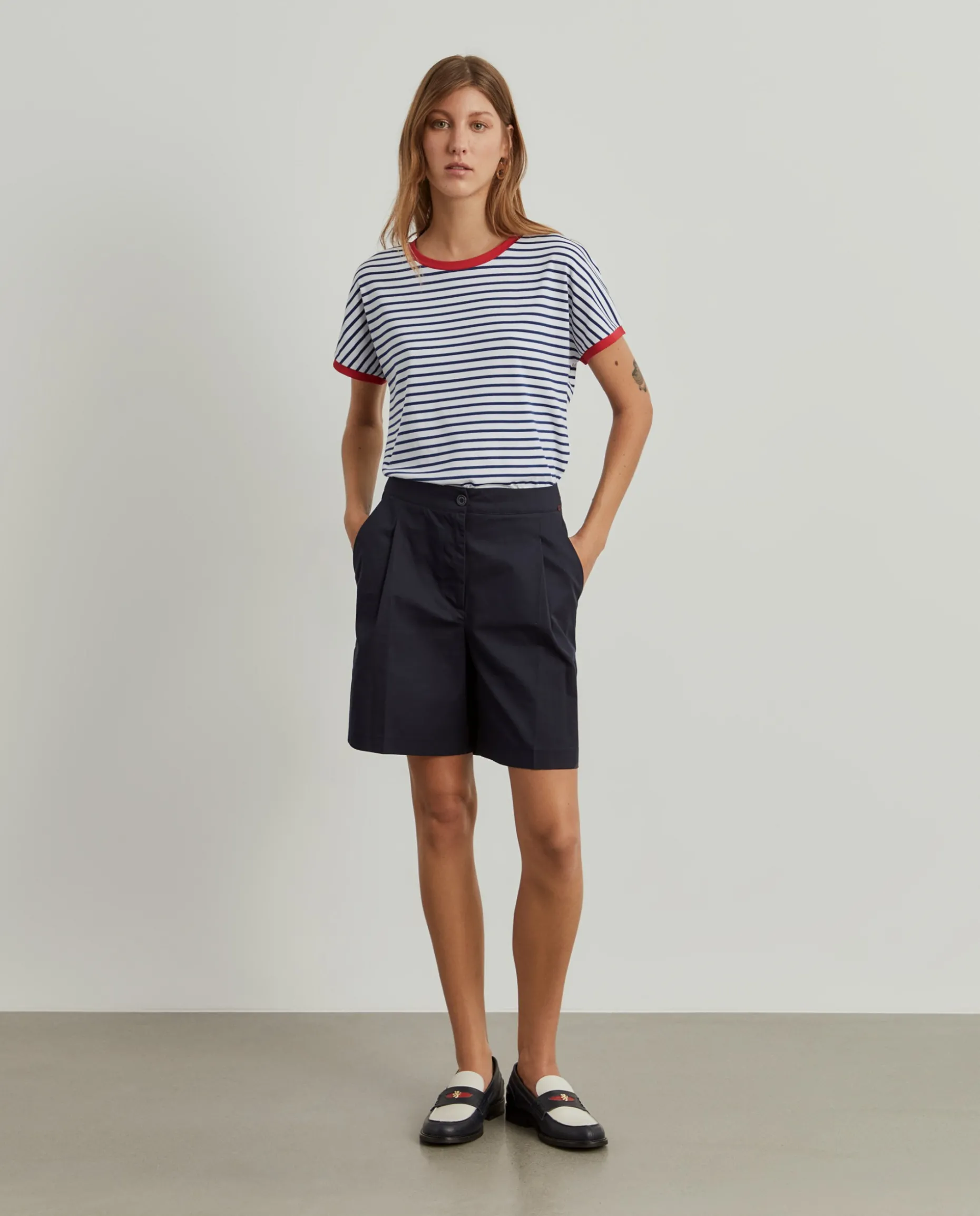 Calções chino com pregas. Com pregas e bolsos frontais e traseiros. Confecionados, na totalidade, em cupro, um material leve, macio, eco-friendly e sustentável.