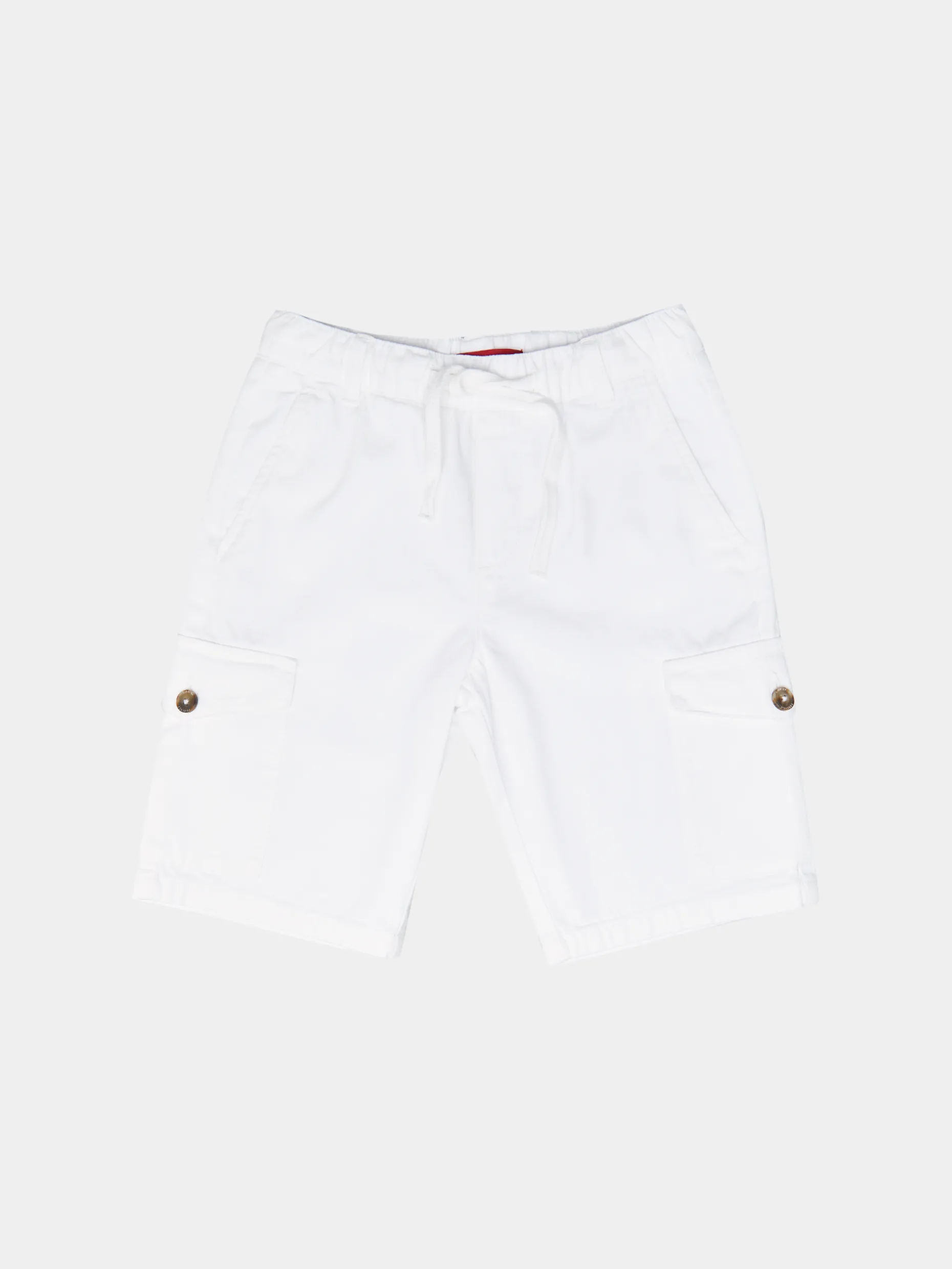 Calções em sarja com bolsos nas laterais. Cinto com elástico e cordões à cor. Bolso de chapa traseiro com botão.