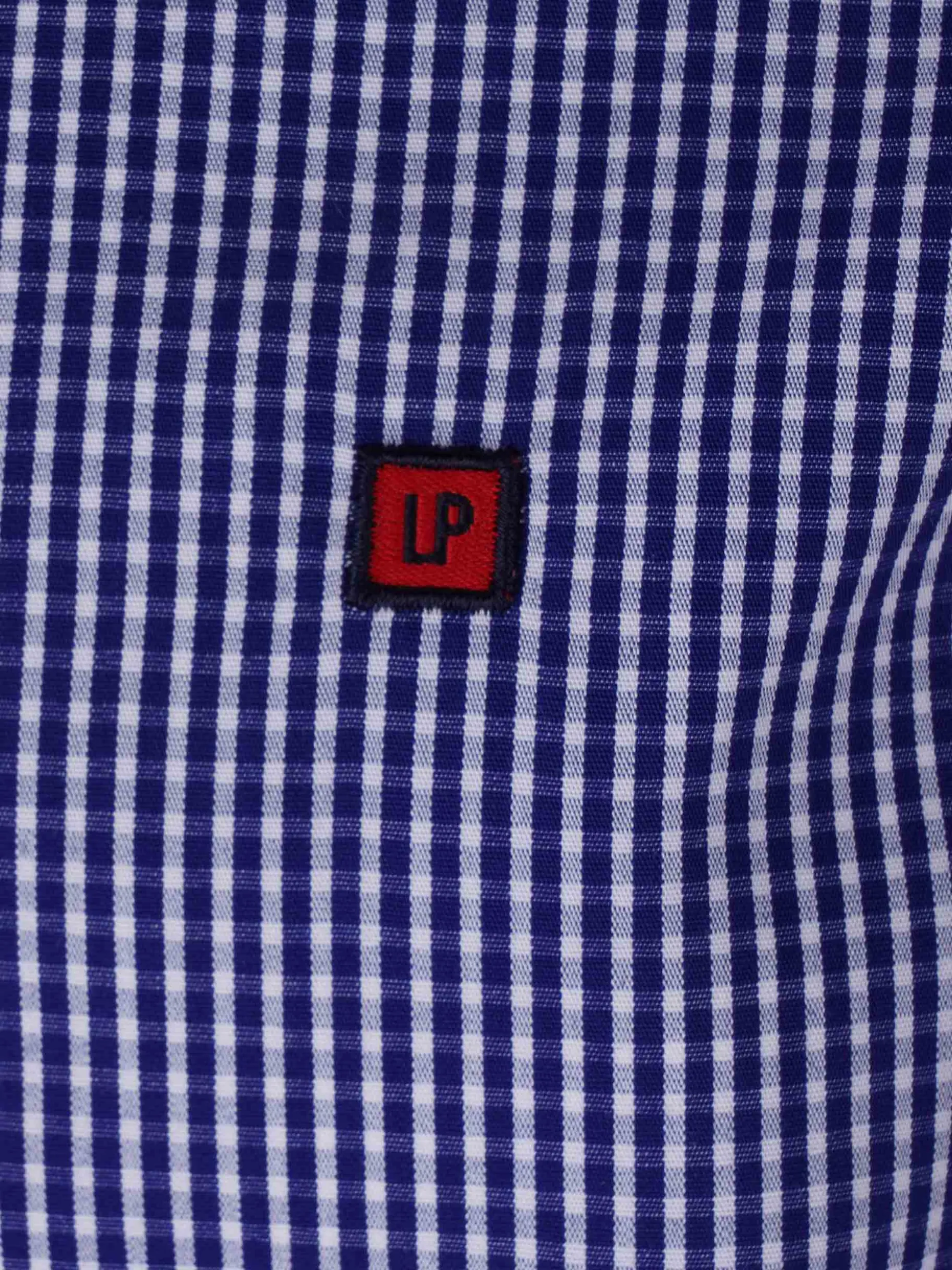 Camisa manga comprida em xadrez com etiqueta LP bordada a toda a volta no peito. Detalhe da fita de riscas atrás da gola.