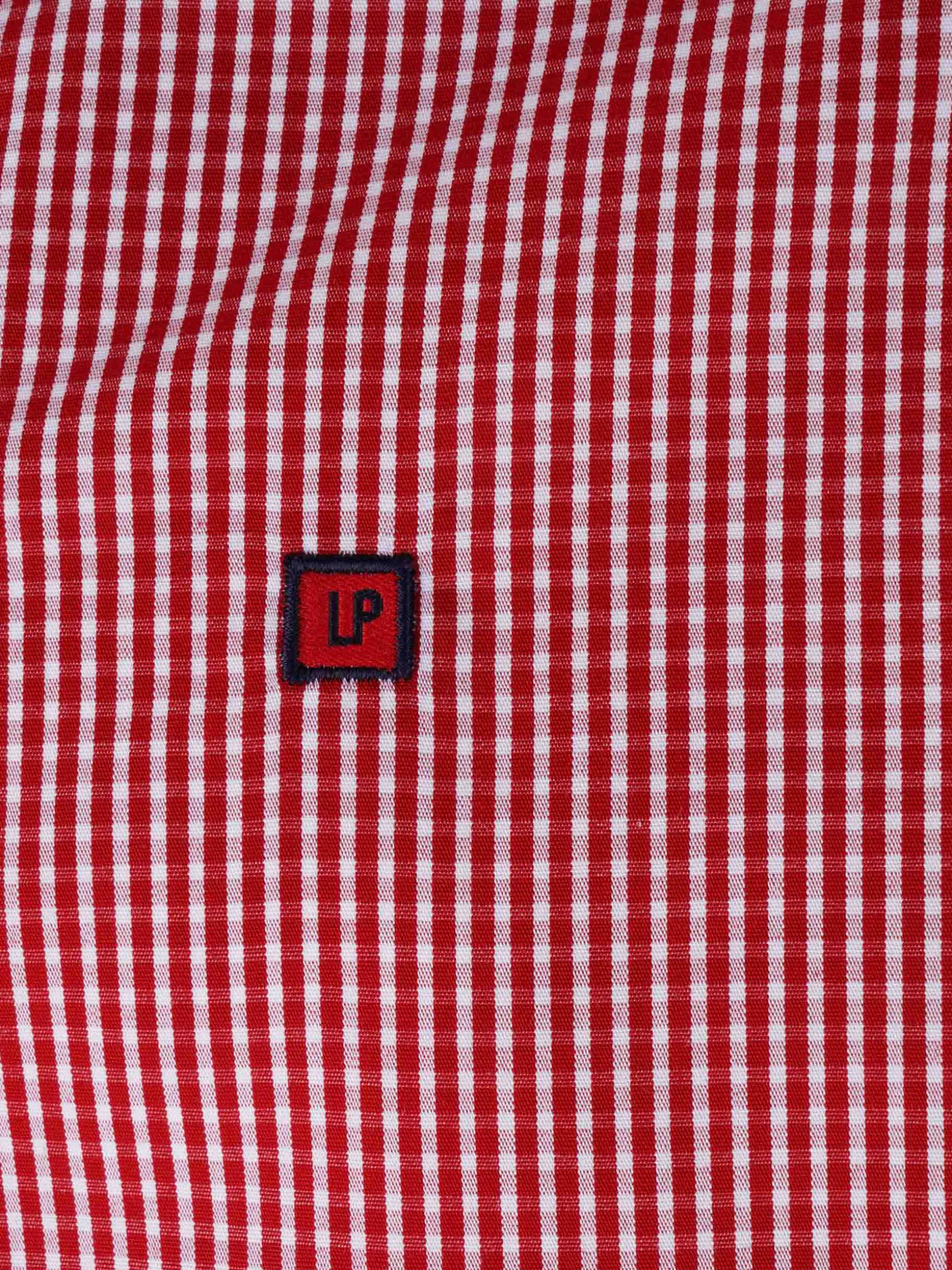 Camisa manga comprida em xadrez com etiqueta LP bordada a toda a volta no peito. Detalhe da fita de riscas atrás da gola.