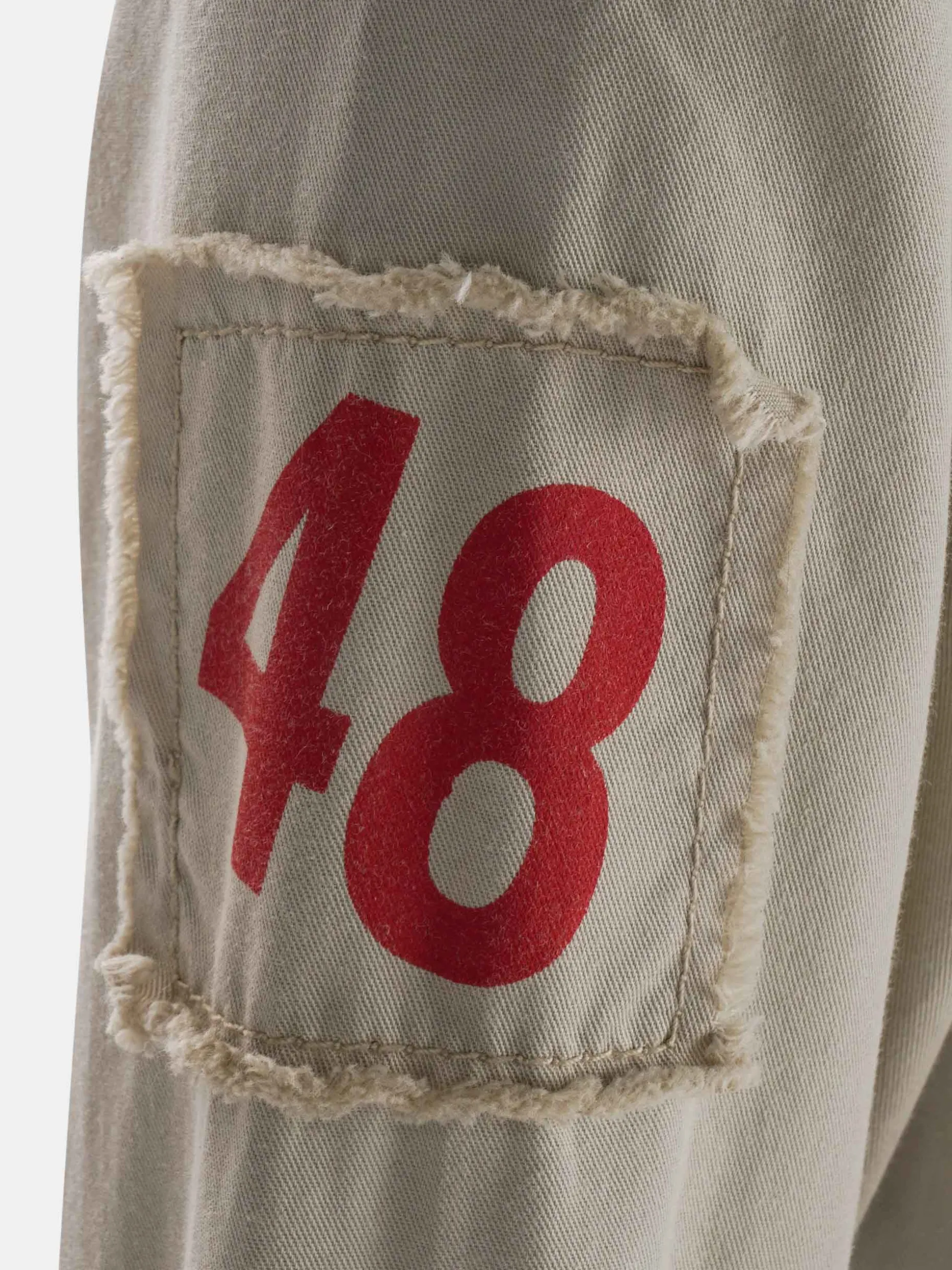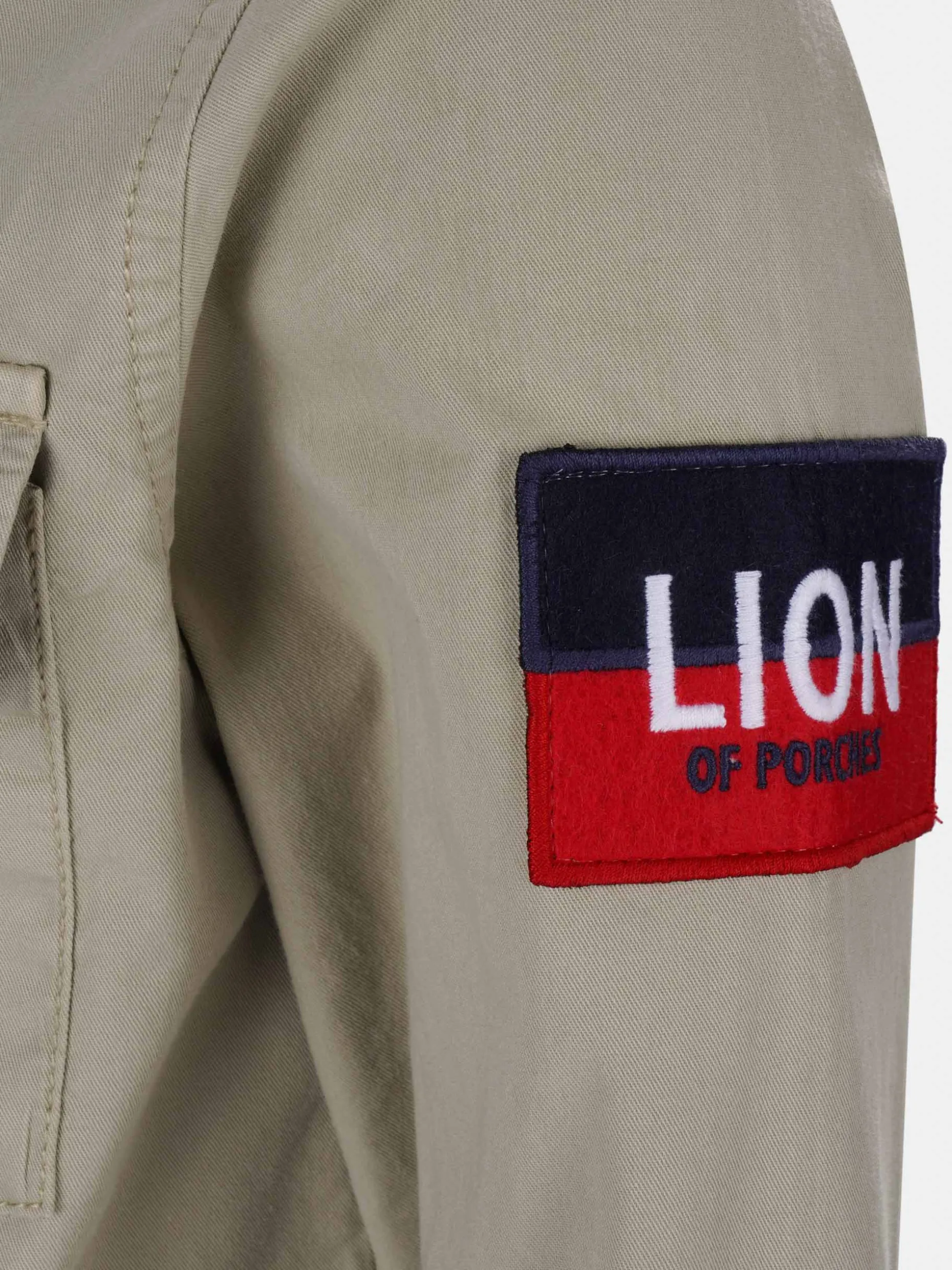 Camisa com bolsos na frente. Estampado “48” numa manga em contraste e bordado Lion of Porches noutra manga. Detalhe da fita de riscas atrás na gola.