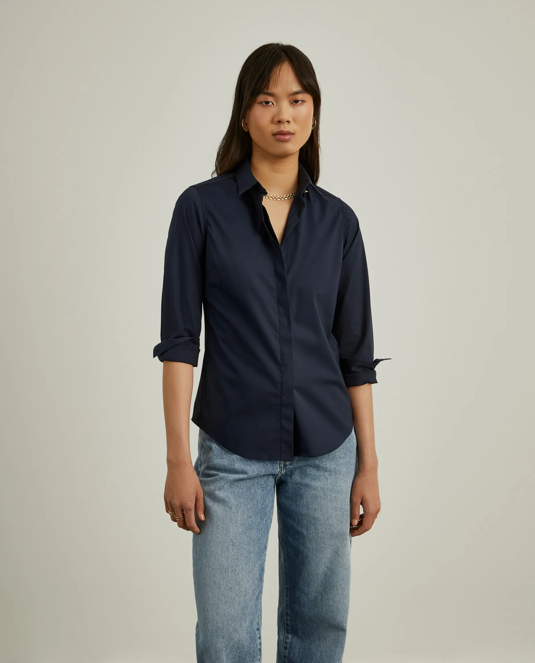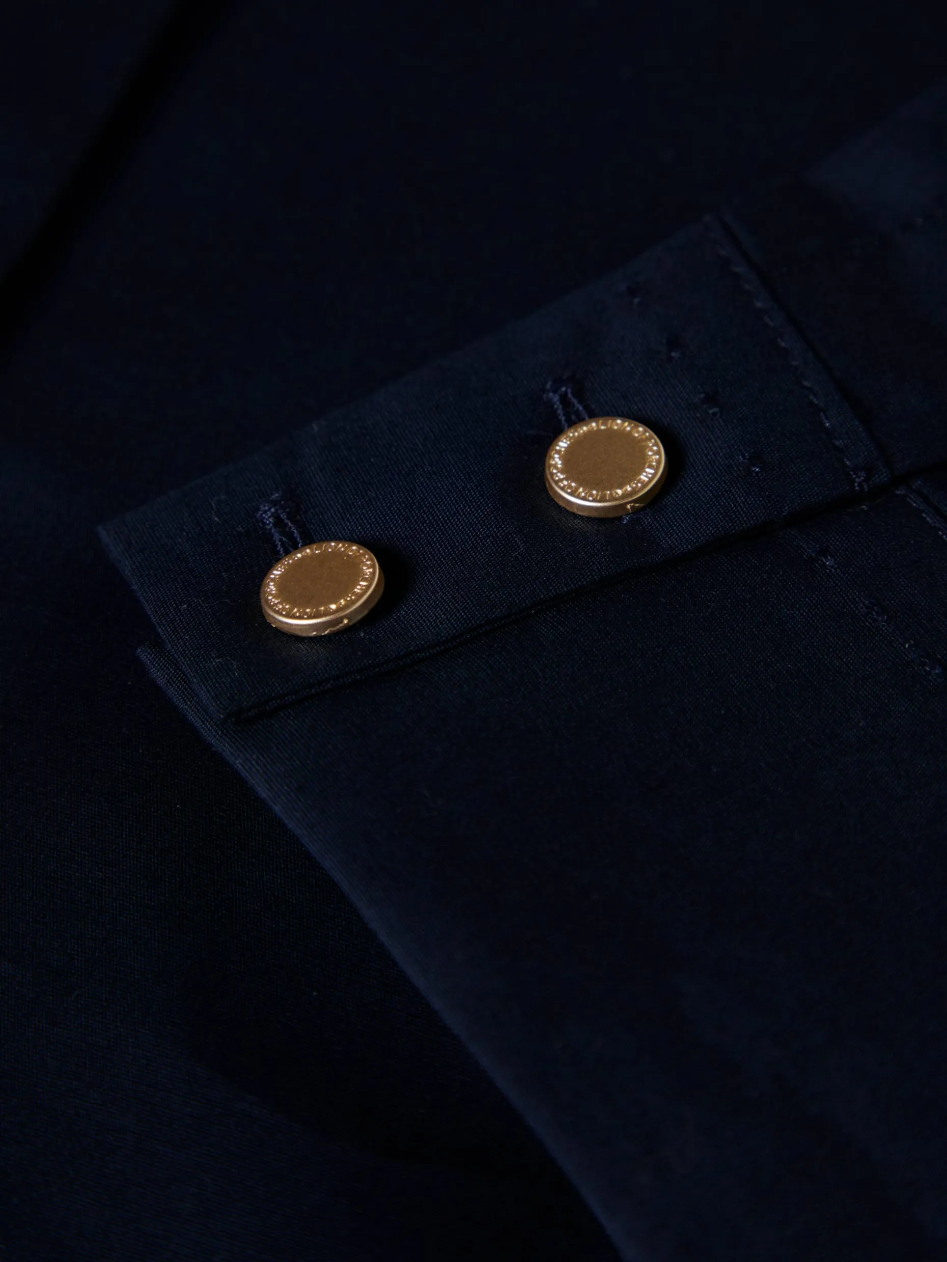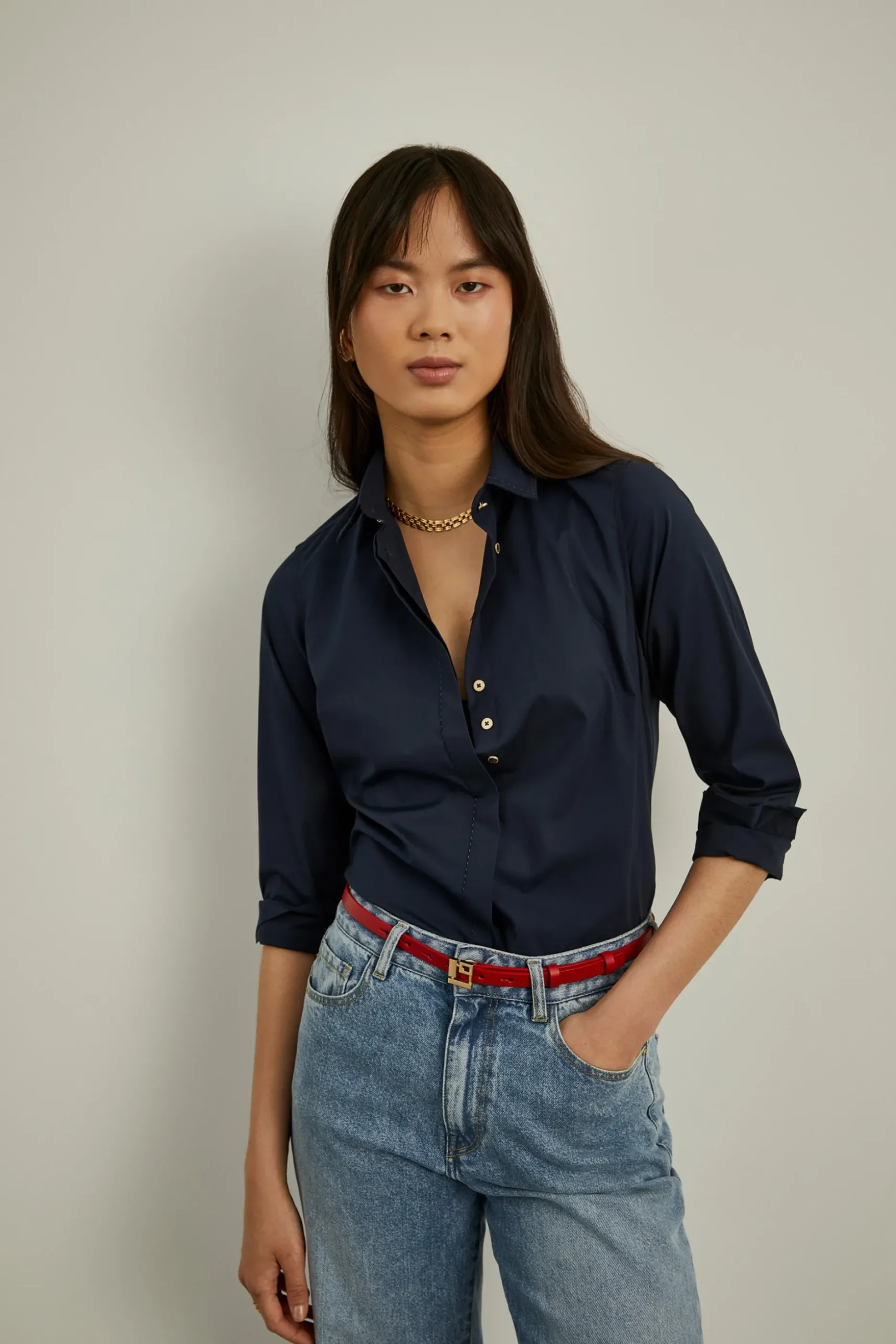 Camisa clássica, modelo regular fit, confecionada em algodão com uma pequena percentagem de elastano para maior conforto e suavidade. Aperta com botões ocultos por carcela na frente e ainda com botões dourados nos punhos.
