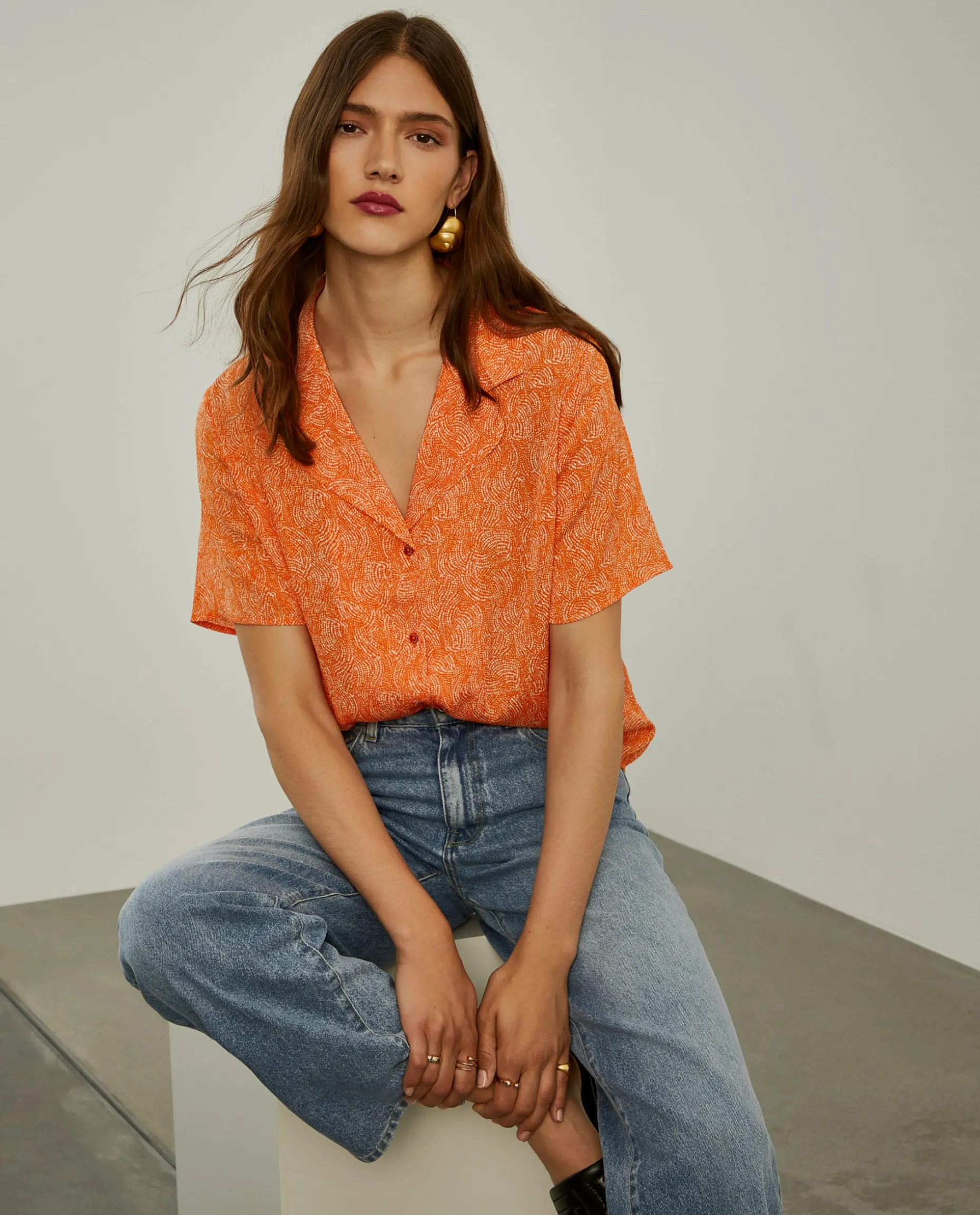 Camisa de manga curta com micro padrão polka dots. Com gola de bico com lapela, aperta na frente através de botões ao tom.