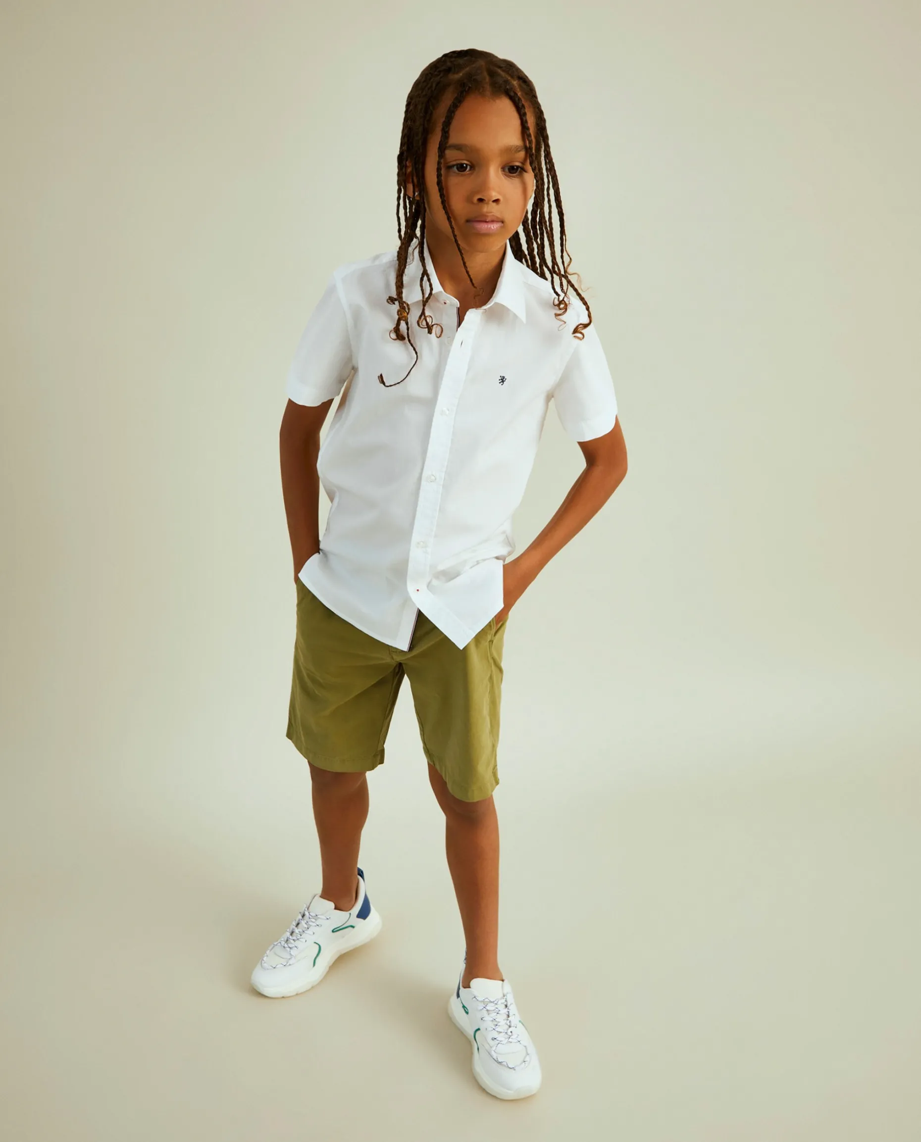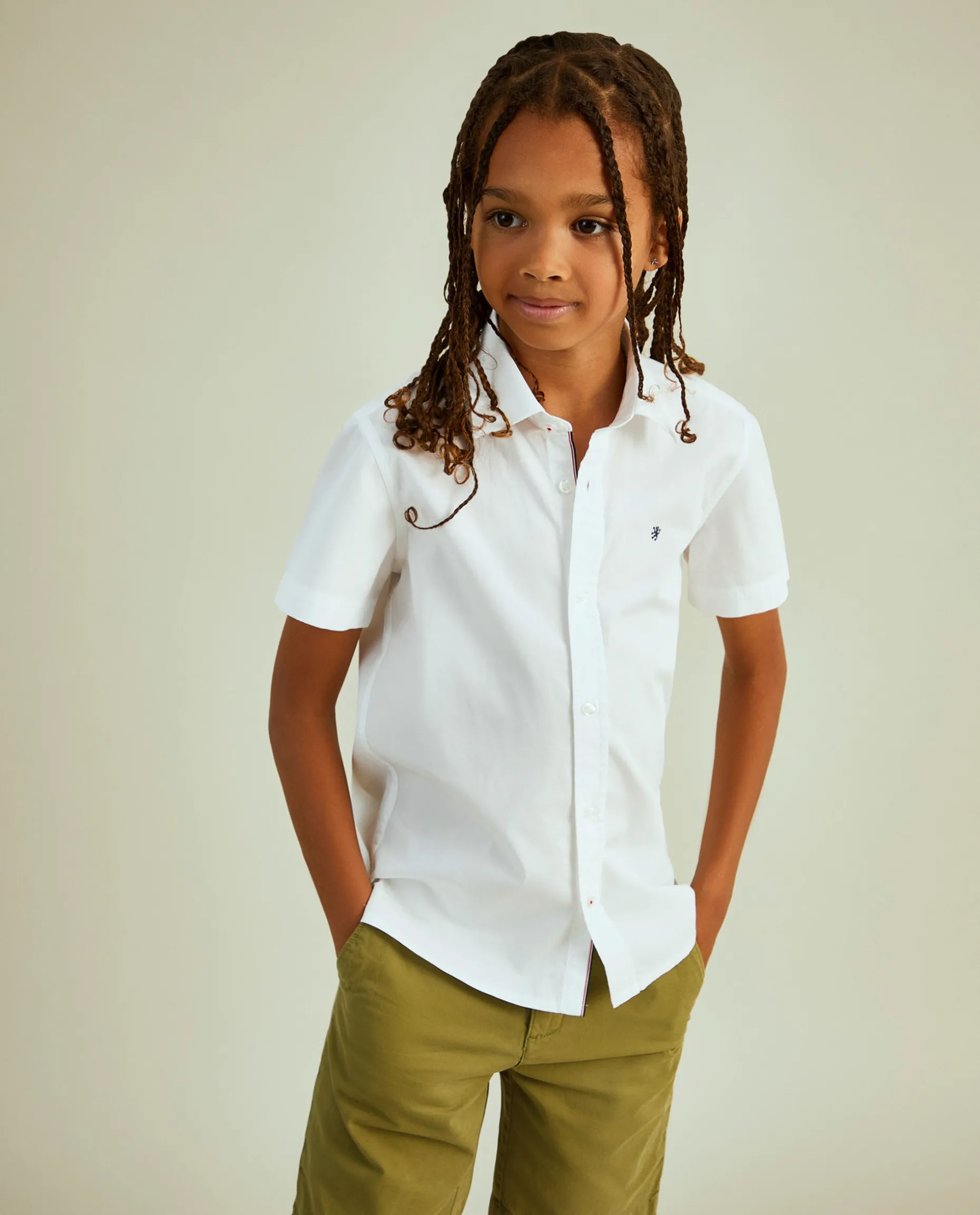 Camisa de manga curta, de cor lisa, com pequeno leão da marca em contraste no peito. Pormenor diferenciador de fita de riscas tricolor no interior da gola e no interior da carcela. Aperta com botões na frente. É confecionada, na totalidade, em algodão para maior conforto e suavidade.
