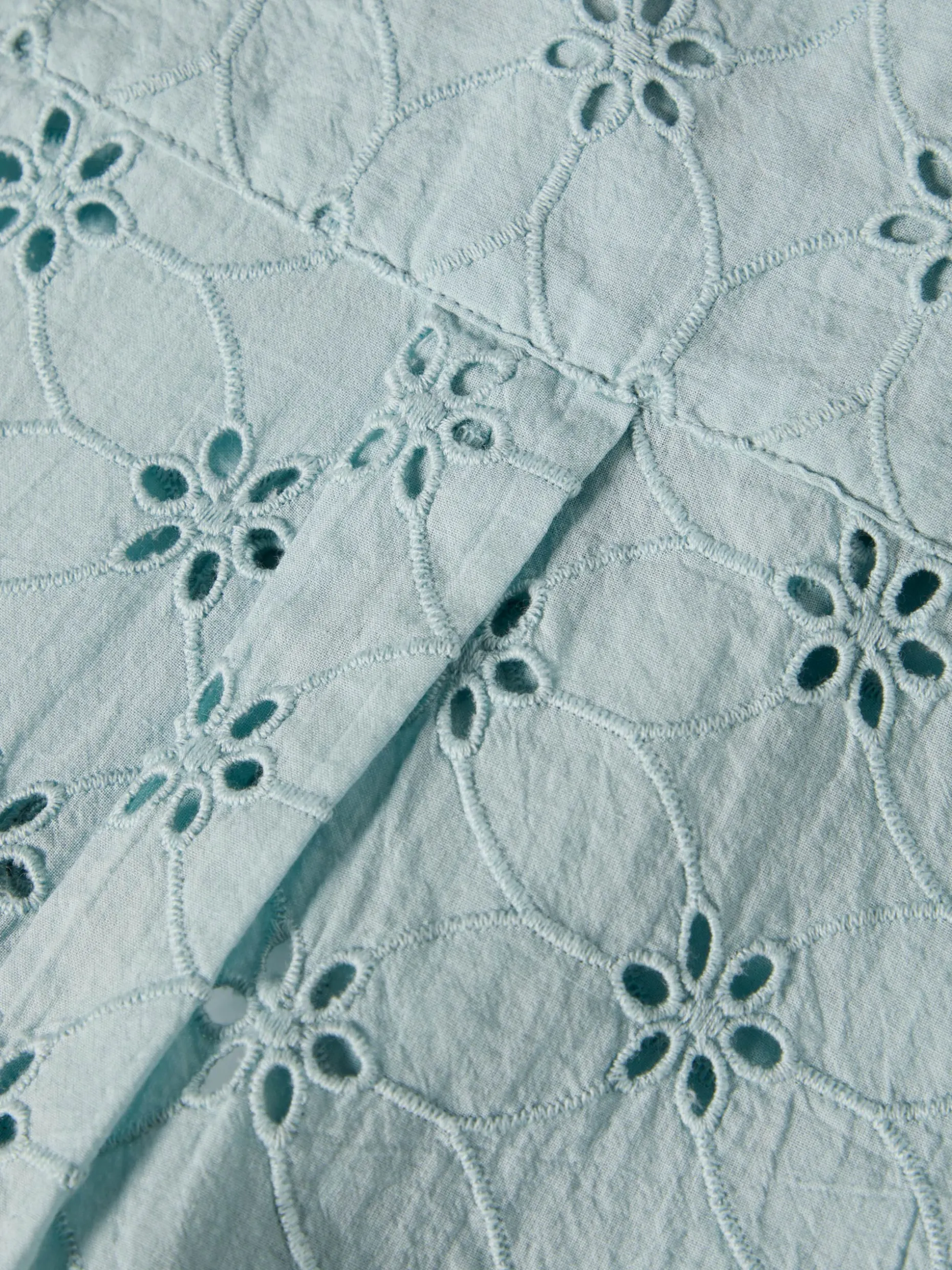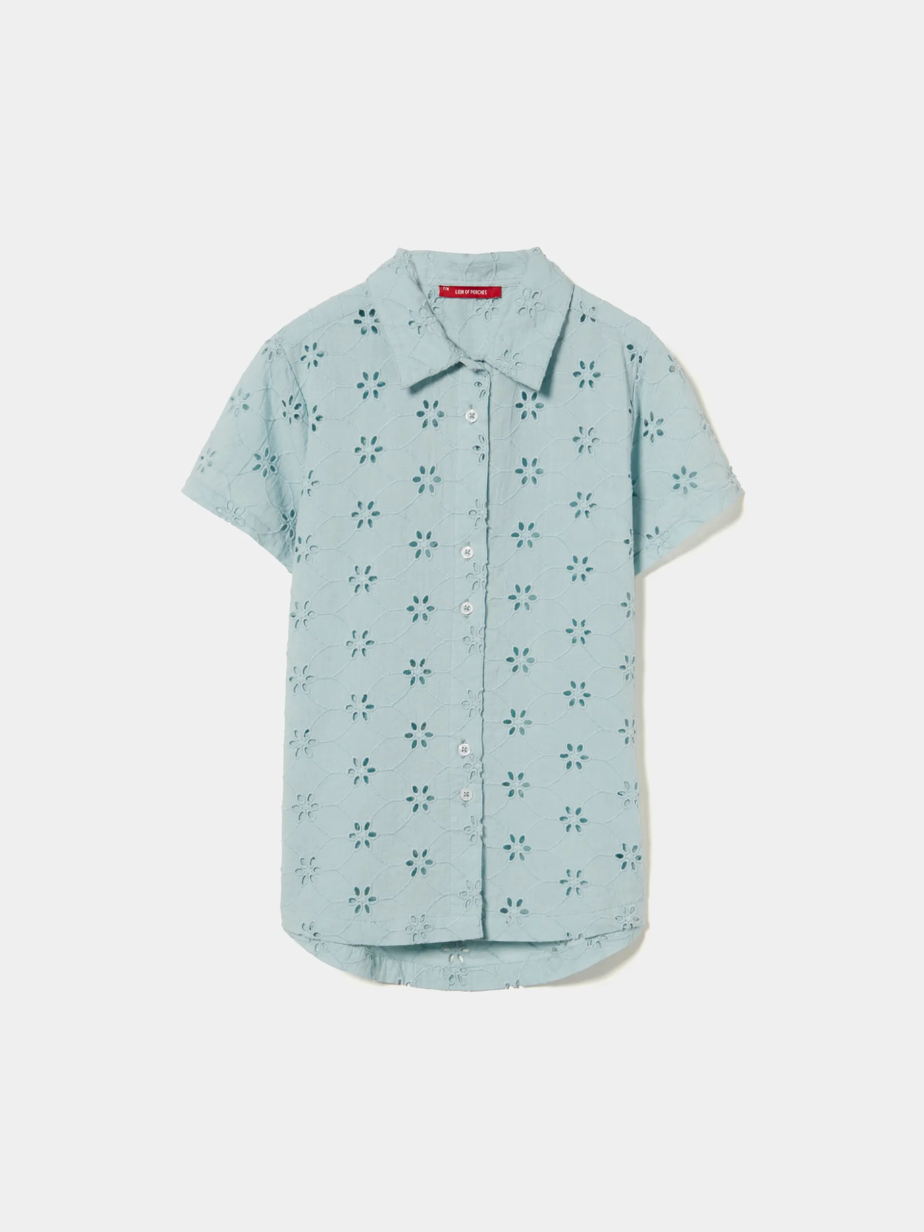Camisa de manga curta com bordado inglês por toda a peça. Aperta na frente com botões madre pérola e a base é assimétrica. É confecionada, na totalidade, em algodão conferindo à peça maior conforto e suavidade.