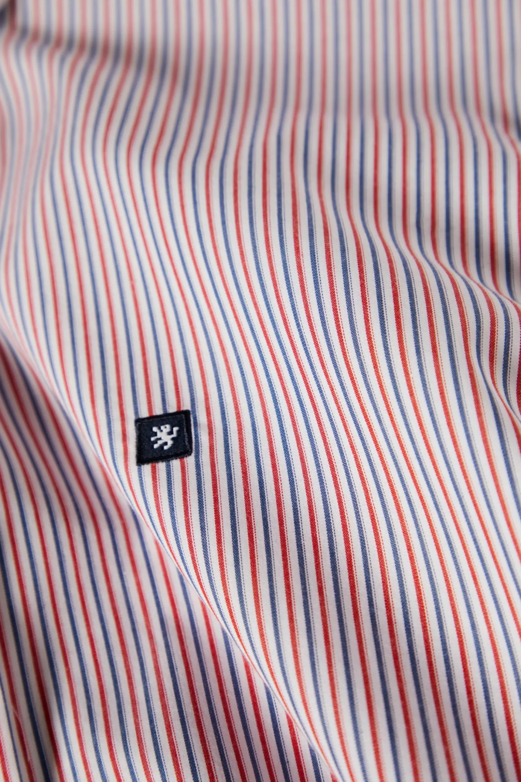 Camisa regular fit em popelina com padrão de riscas. Aperta com botões na frente, colarinho e punhos. Finaliza com bordado Lion of Porches no peito, em contraste de cor.