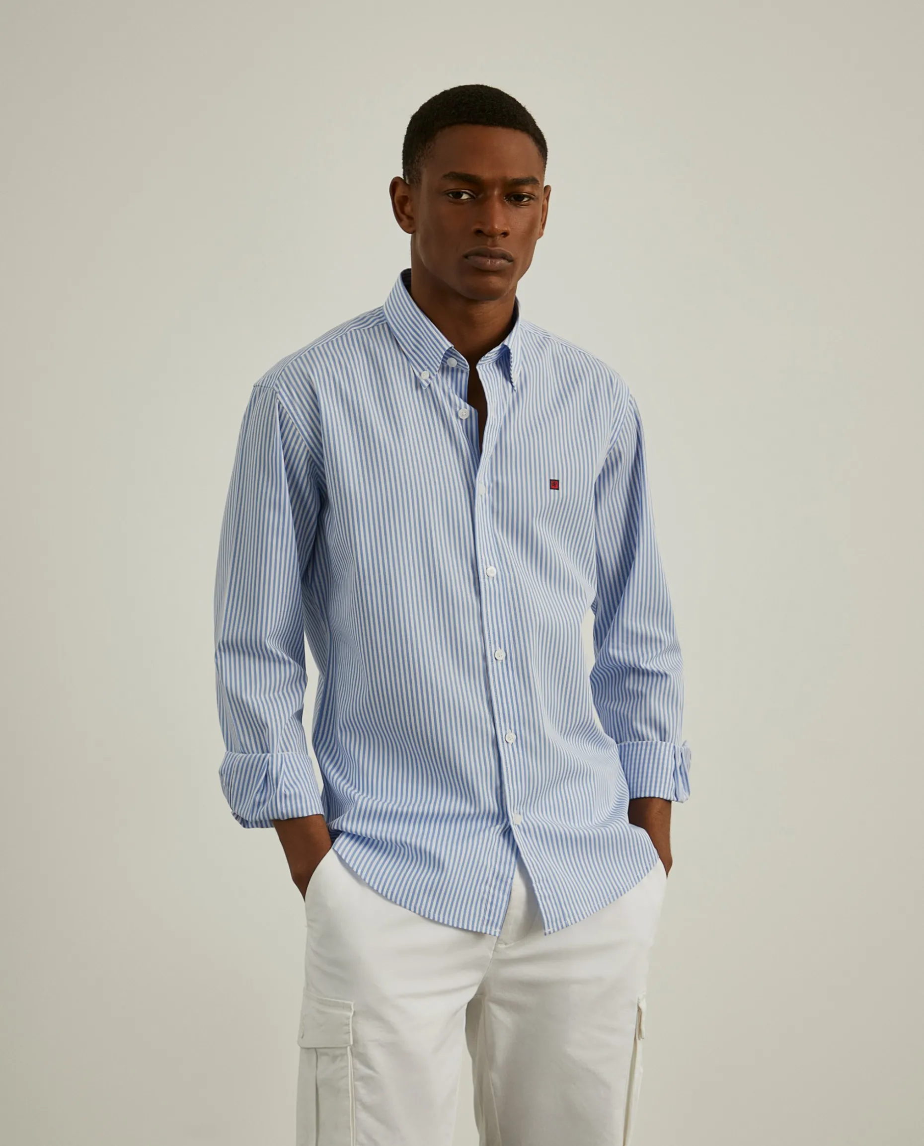 Camisa Slim Fit em tecido com padrão de riscas. Colarinho com dois botões. Bordado personalizado no peito. Botões personalizados.
