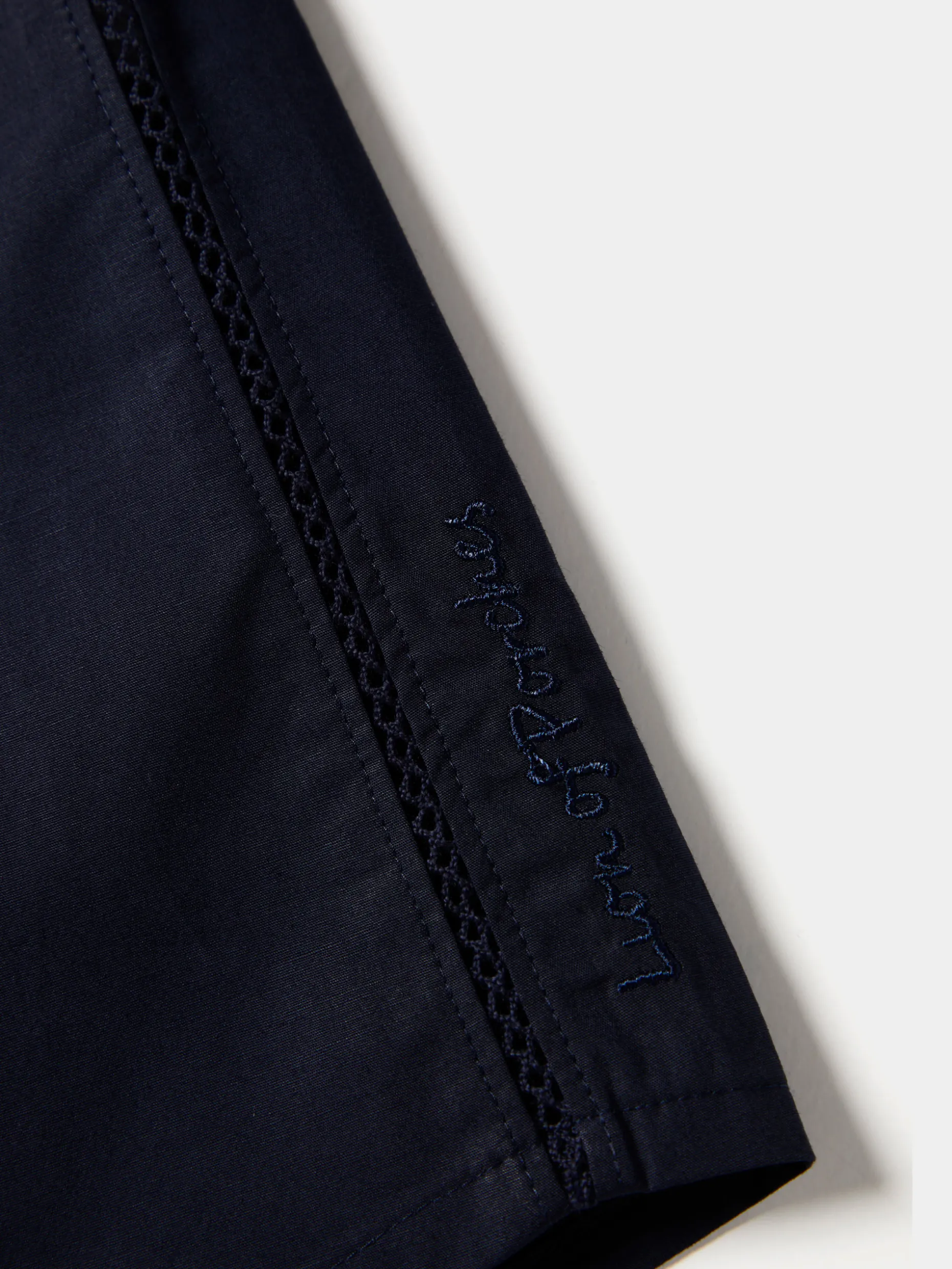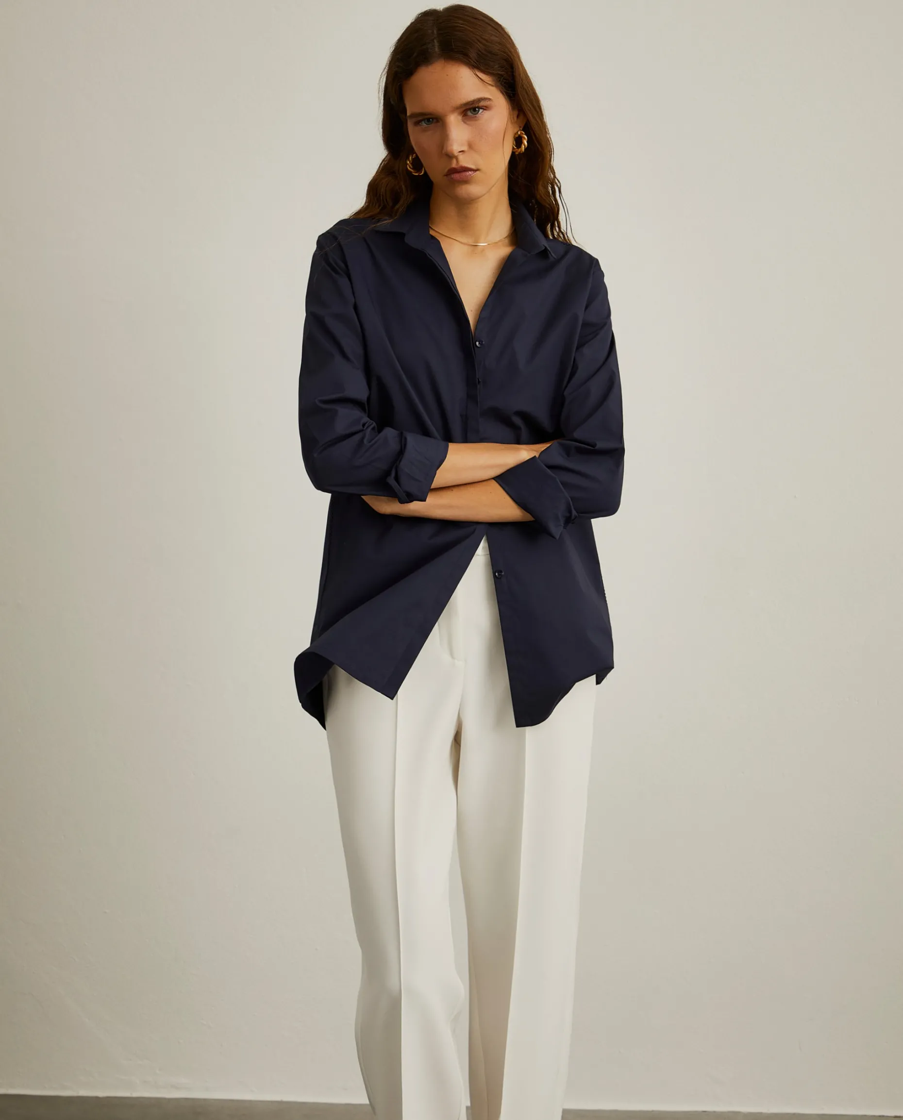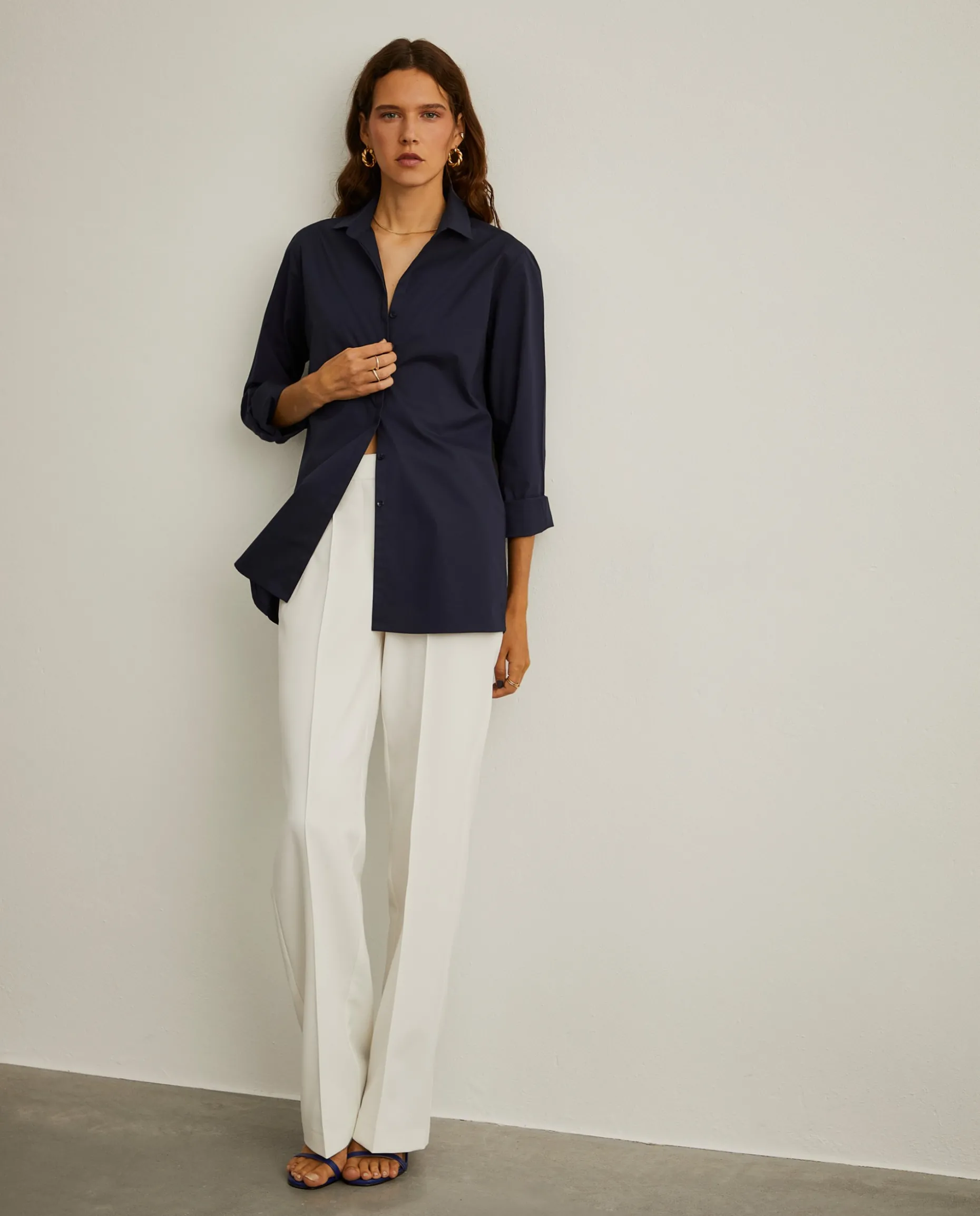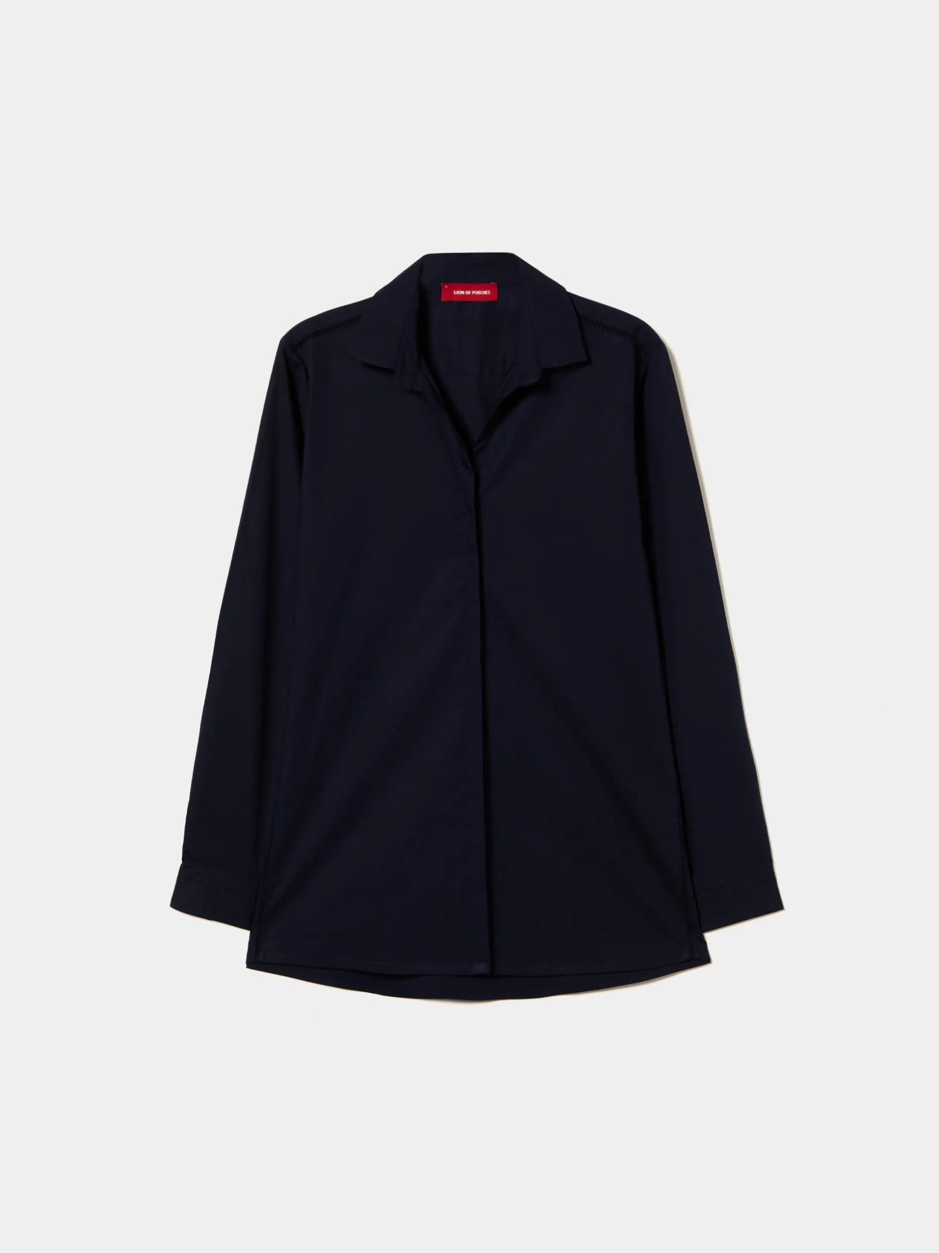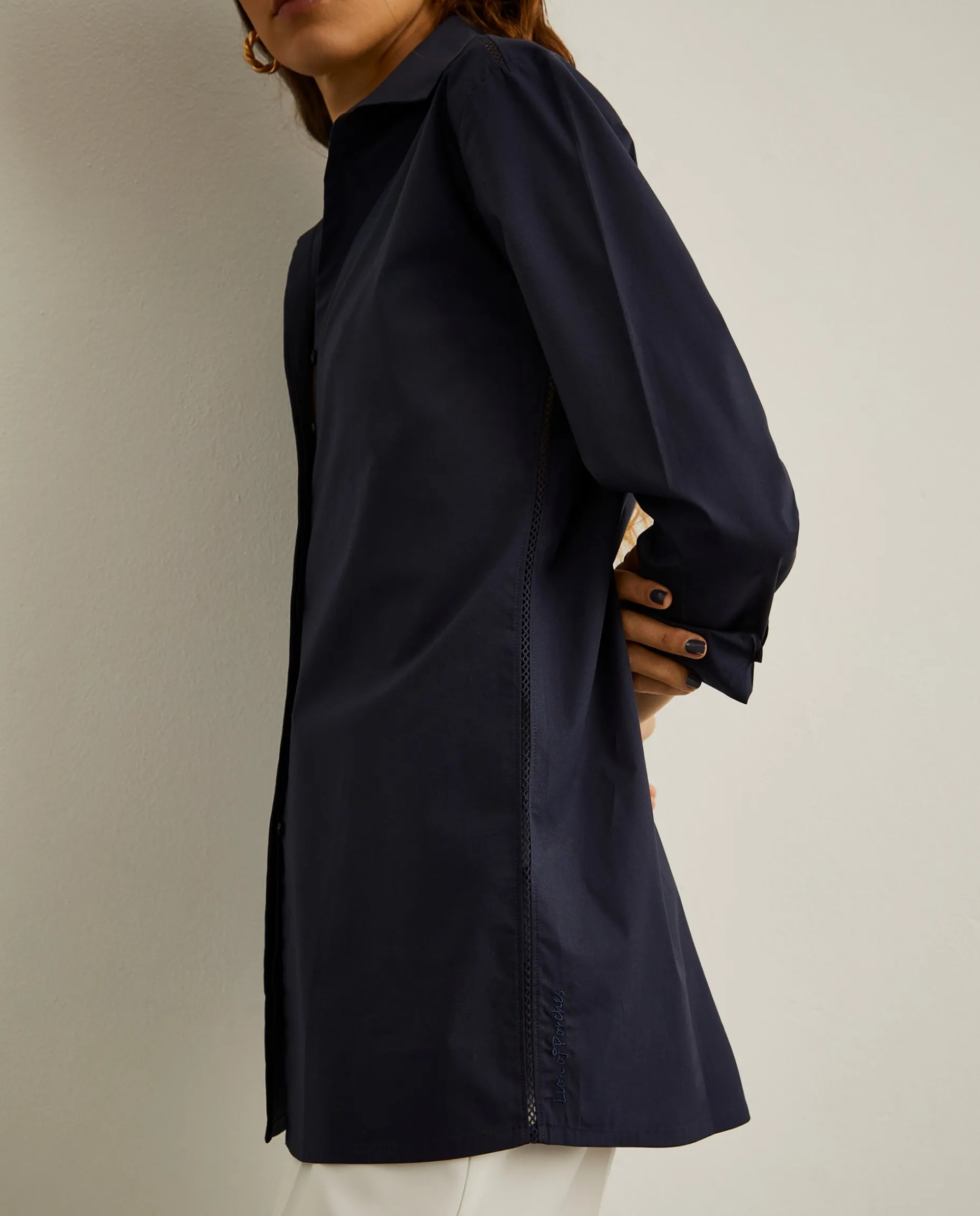 Camisa de algodão com pormenor elegante e diferenciador de bordado inglês nos ombros e laterais. Aperta na frente com botões ocultos por carcela e os punhos também fecham com dois botões.