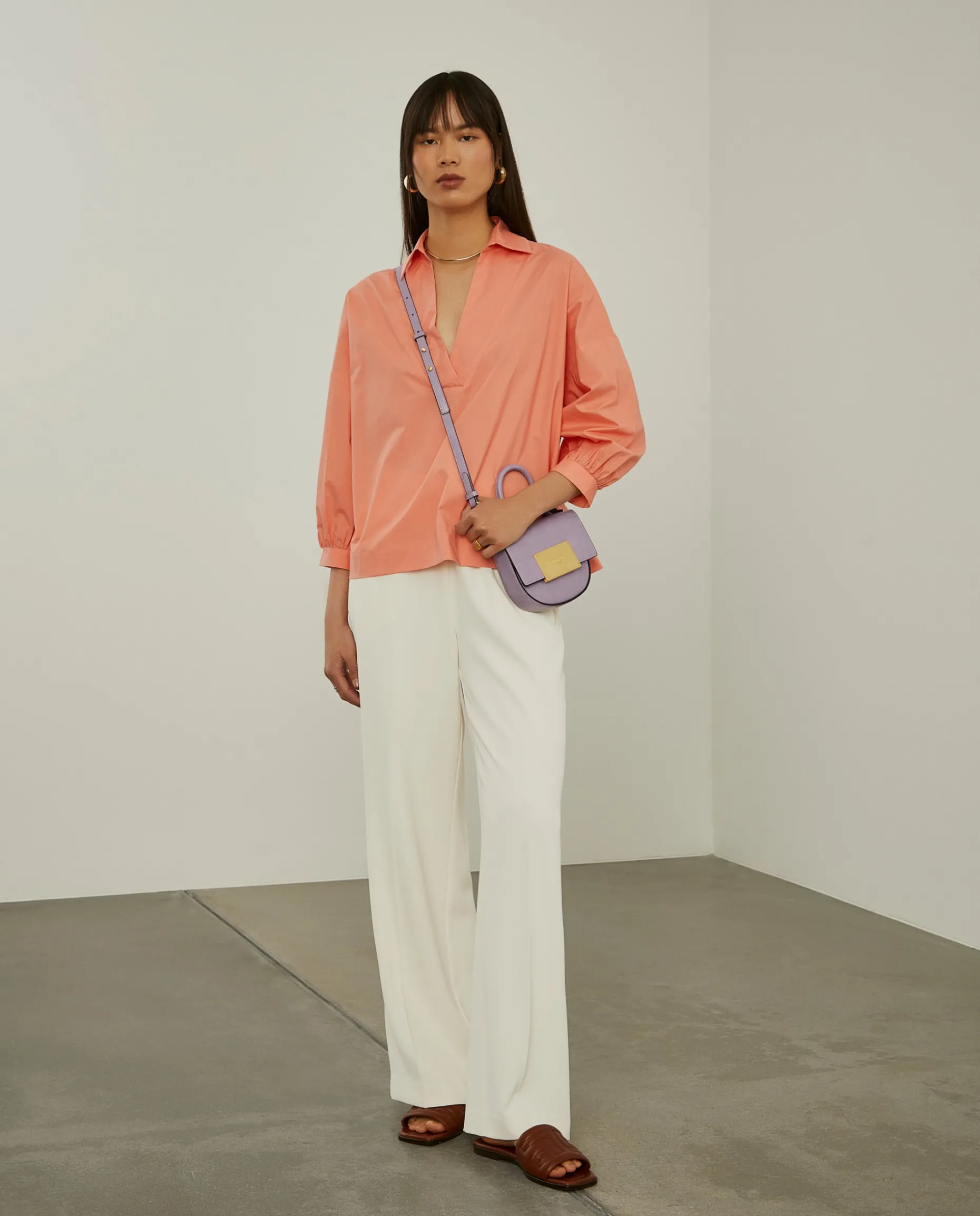 Camisa de fit largo com decote em V e mangas abalonadas que finalizam com pequenas pregas nos punhos. Finaliza com aberturas laterais e base assimétrica (mais comprida na parte de trás).