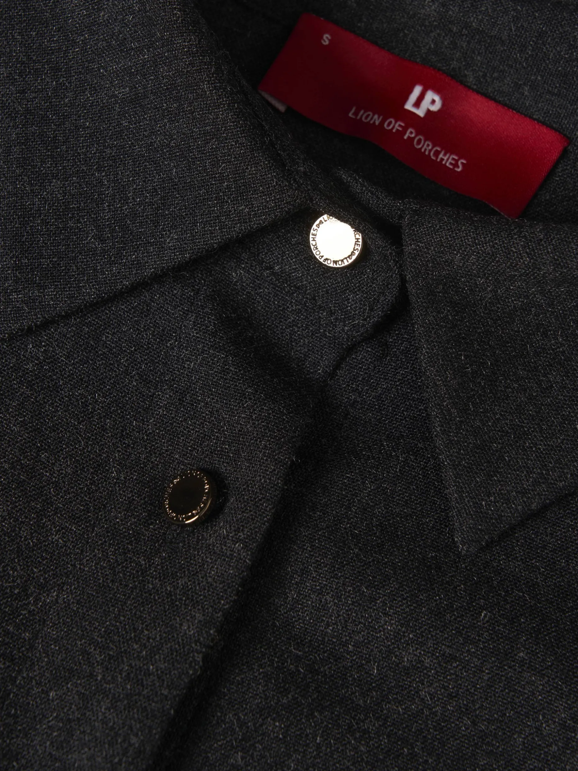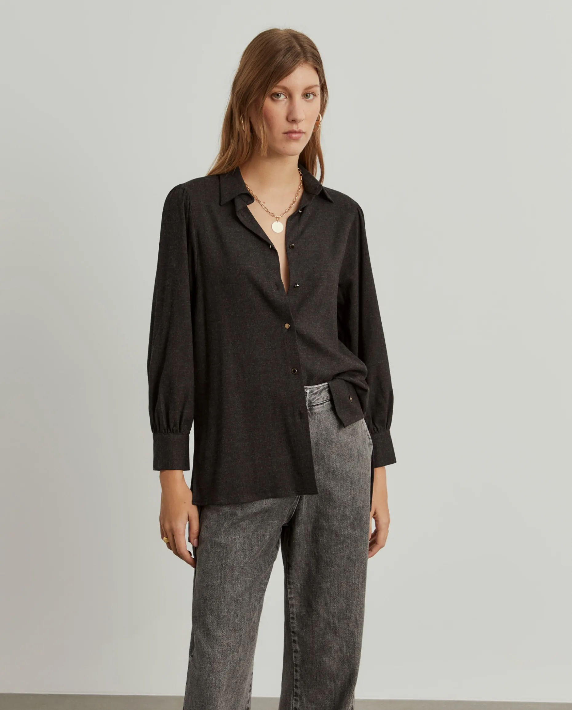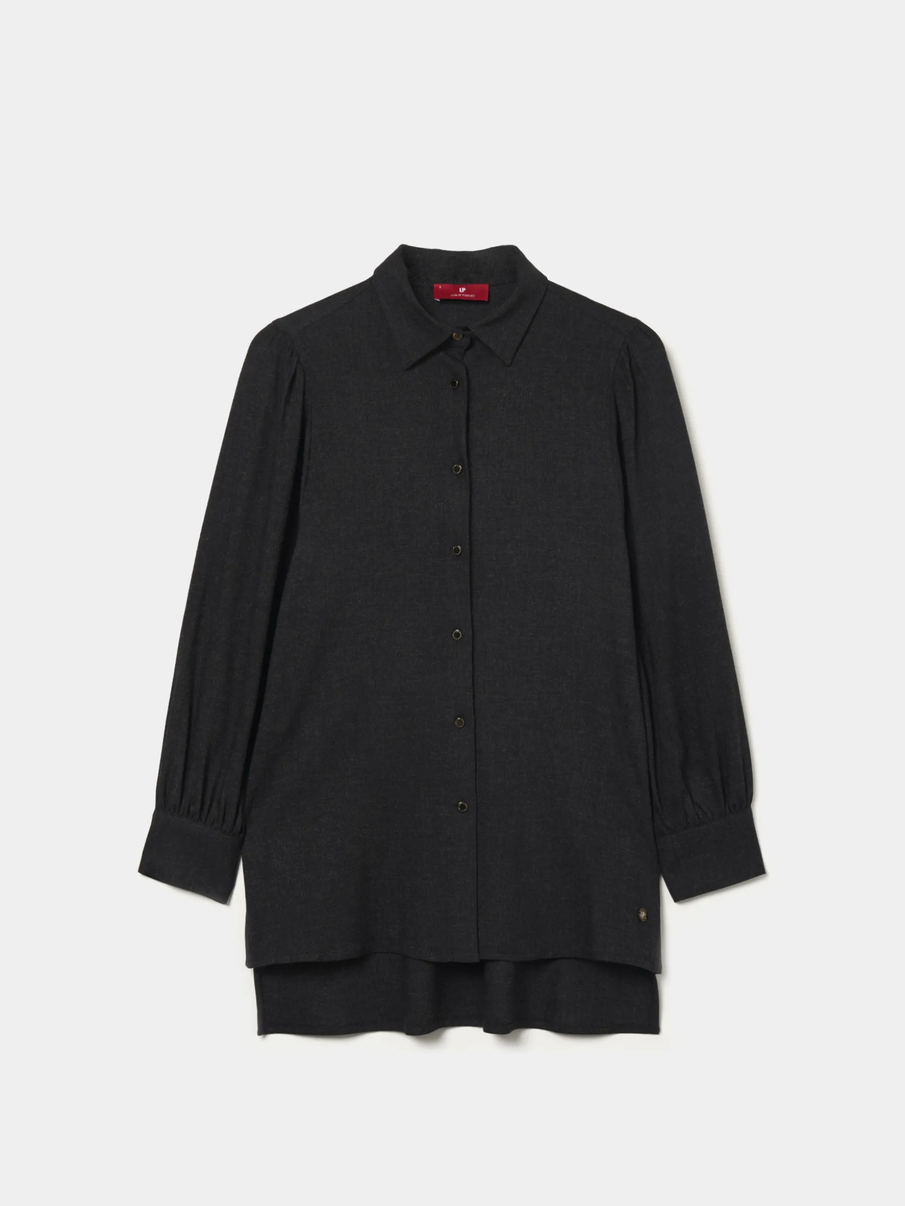 Camisa oversize assimétrica com manga comprida abalonada. Aperta com botões. Aberturas laterais.