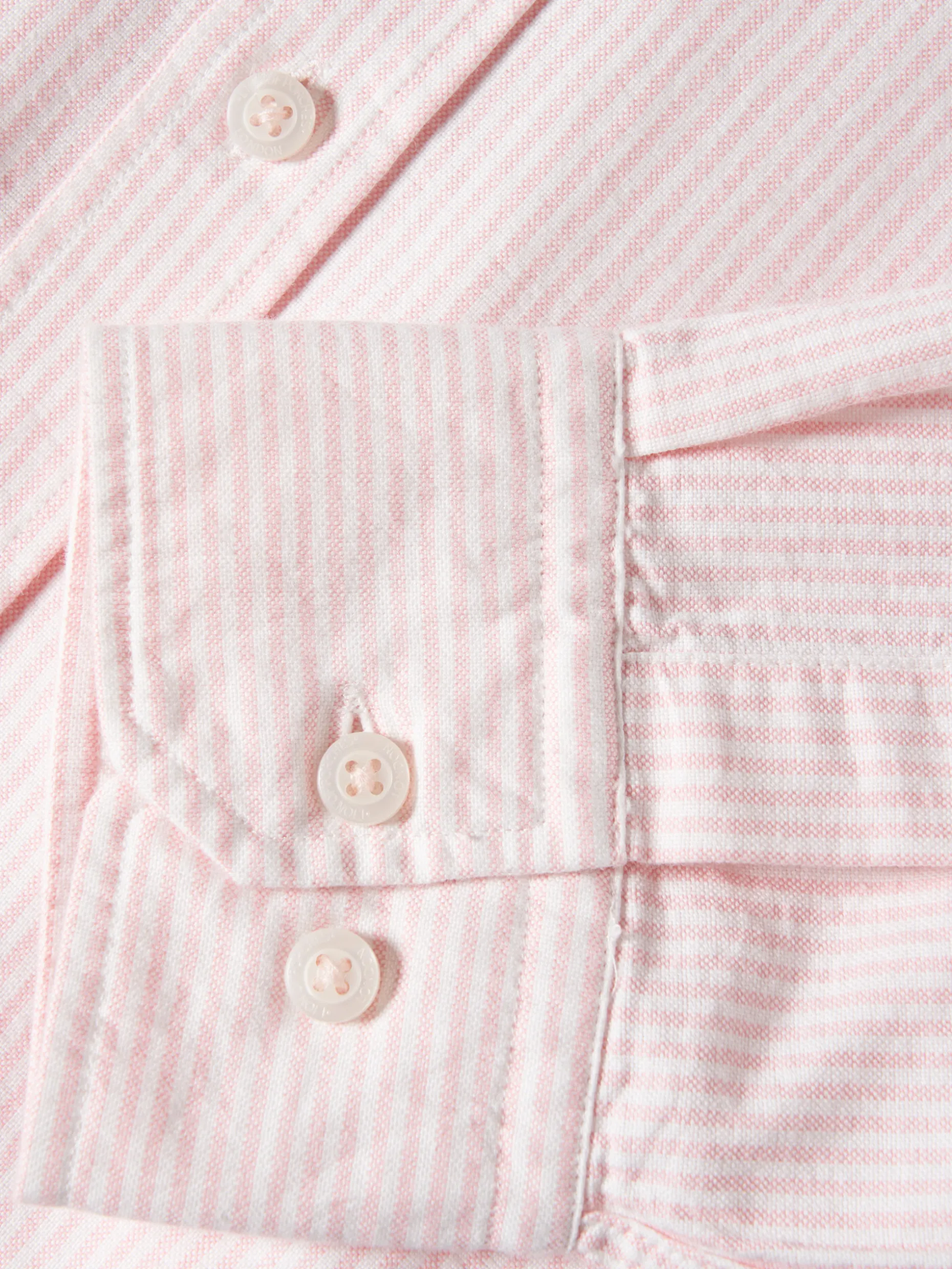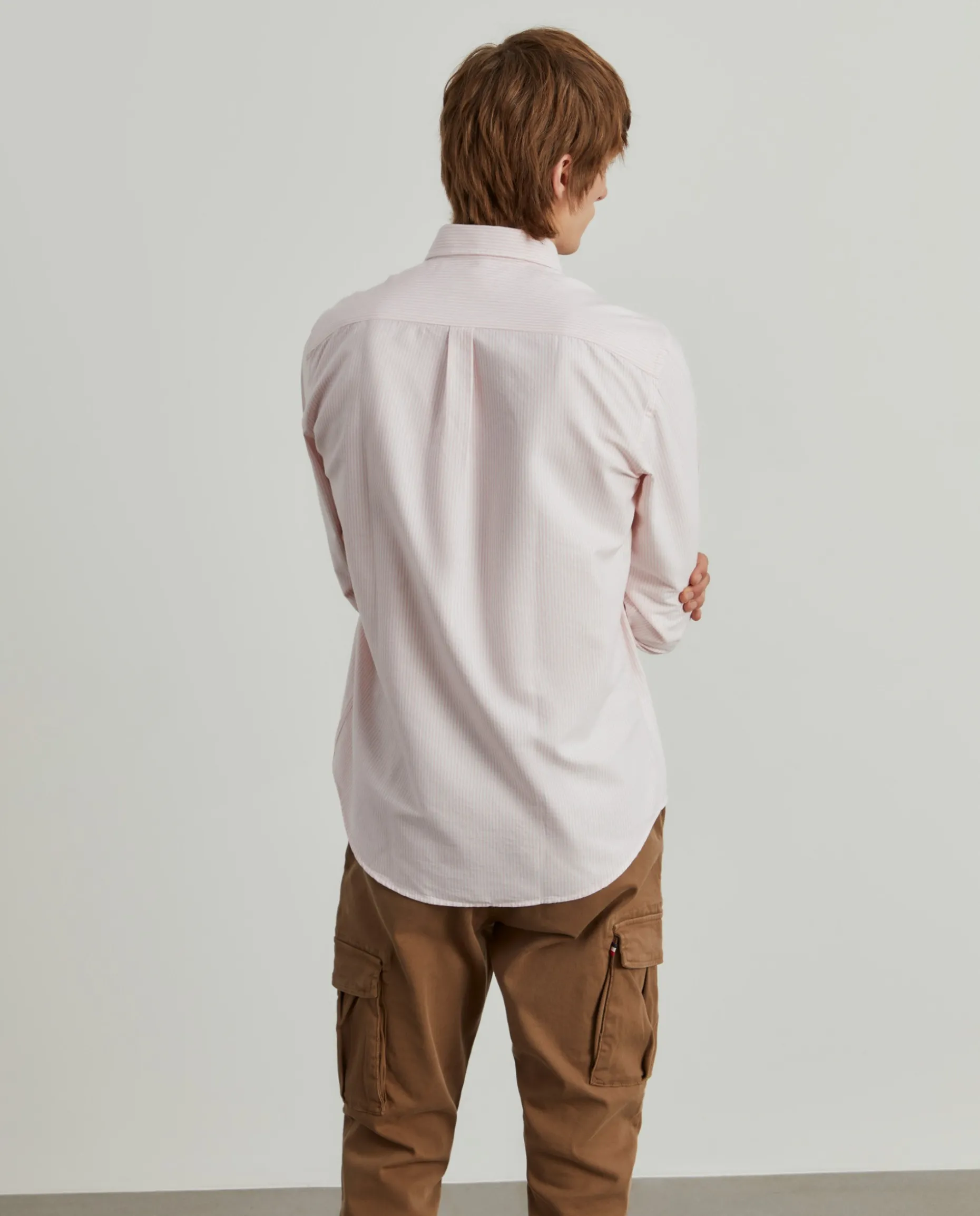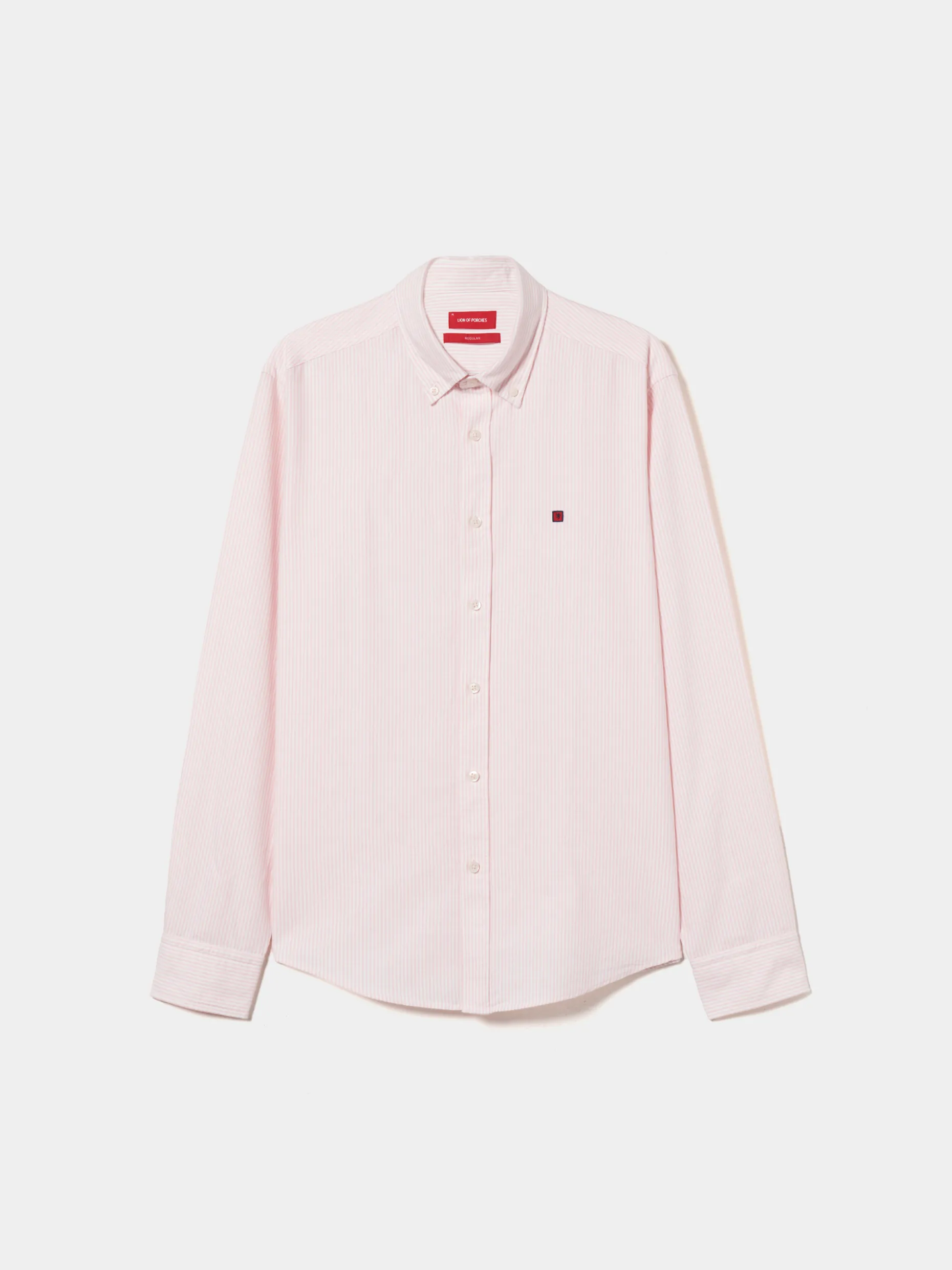 Camisa regular fit em tecido Oxford com padrão de riscas. Colarinho com dois botões. Branding Lion of Porches bordado no peito. Botões personalizados.
