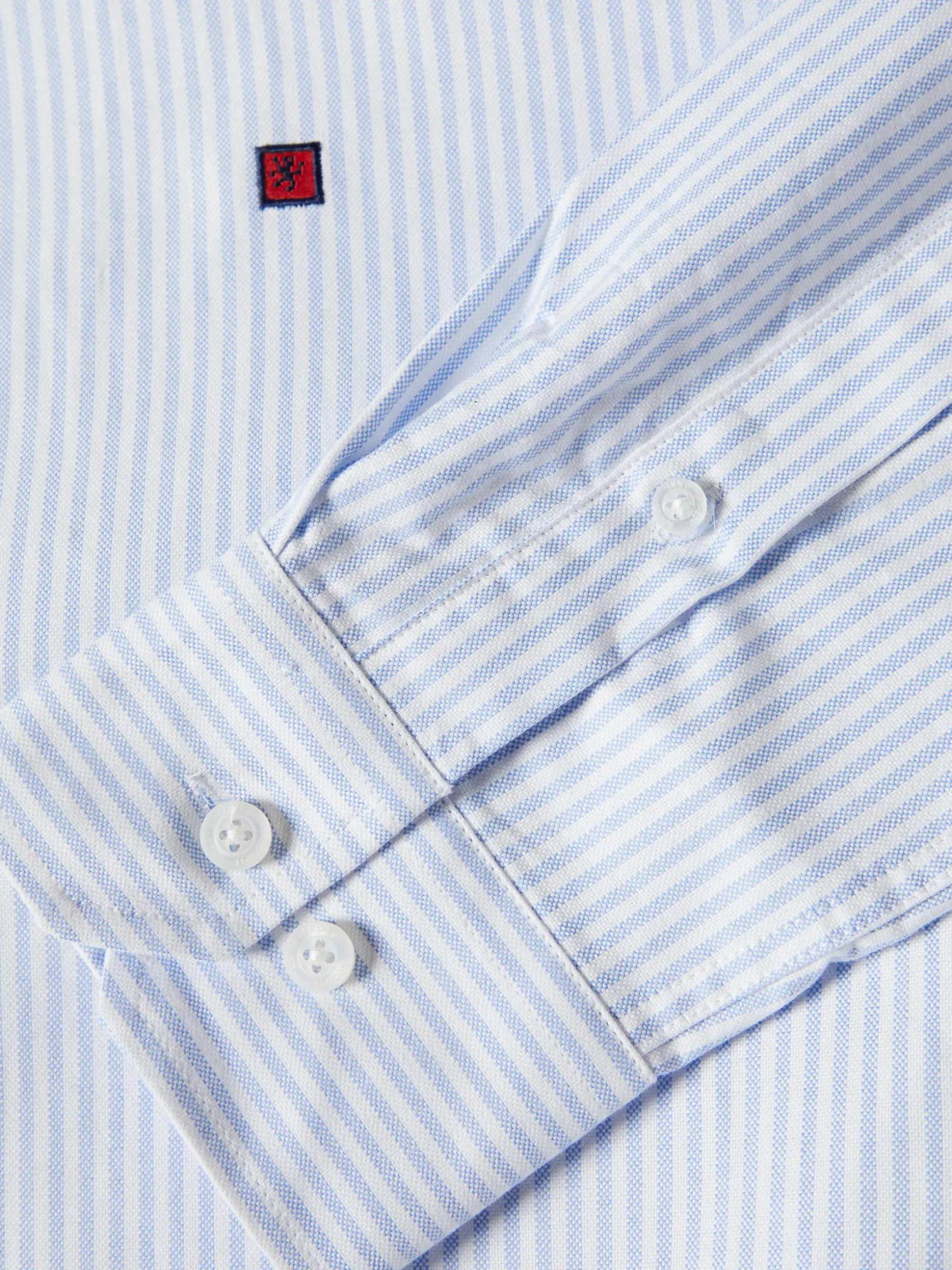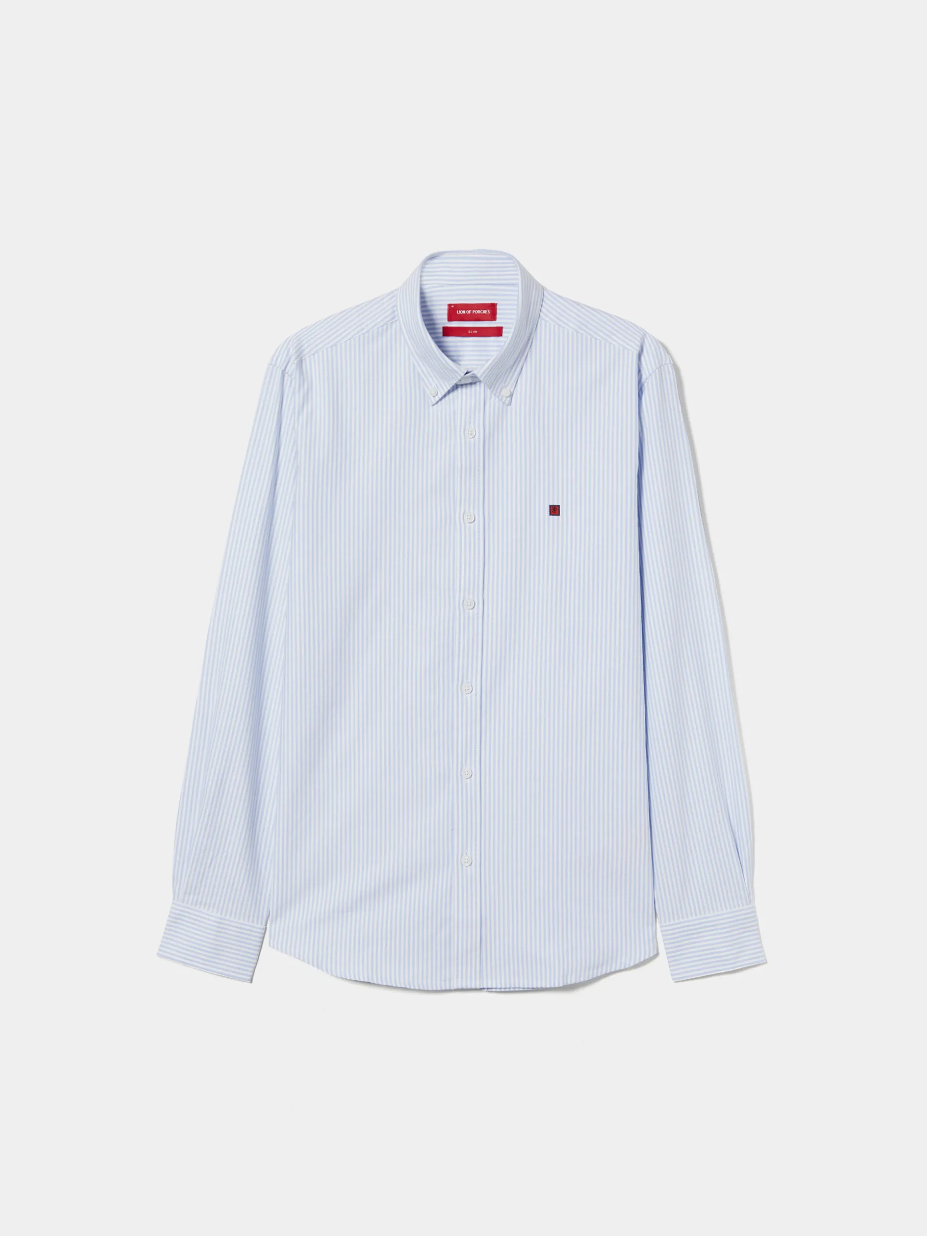Camisa Slim Fit em tecido oxford com padrão de riscas. Colarinho com dois botões. Bordado personalizado no peito. Botões personalizados.