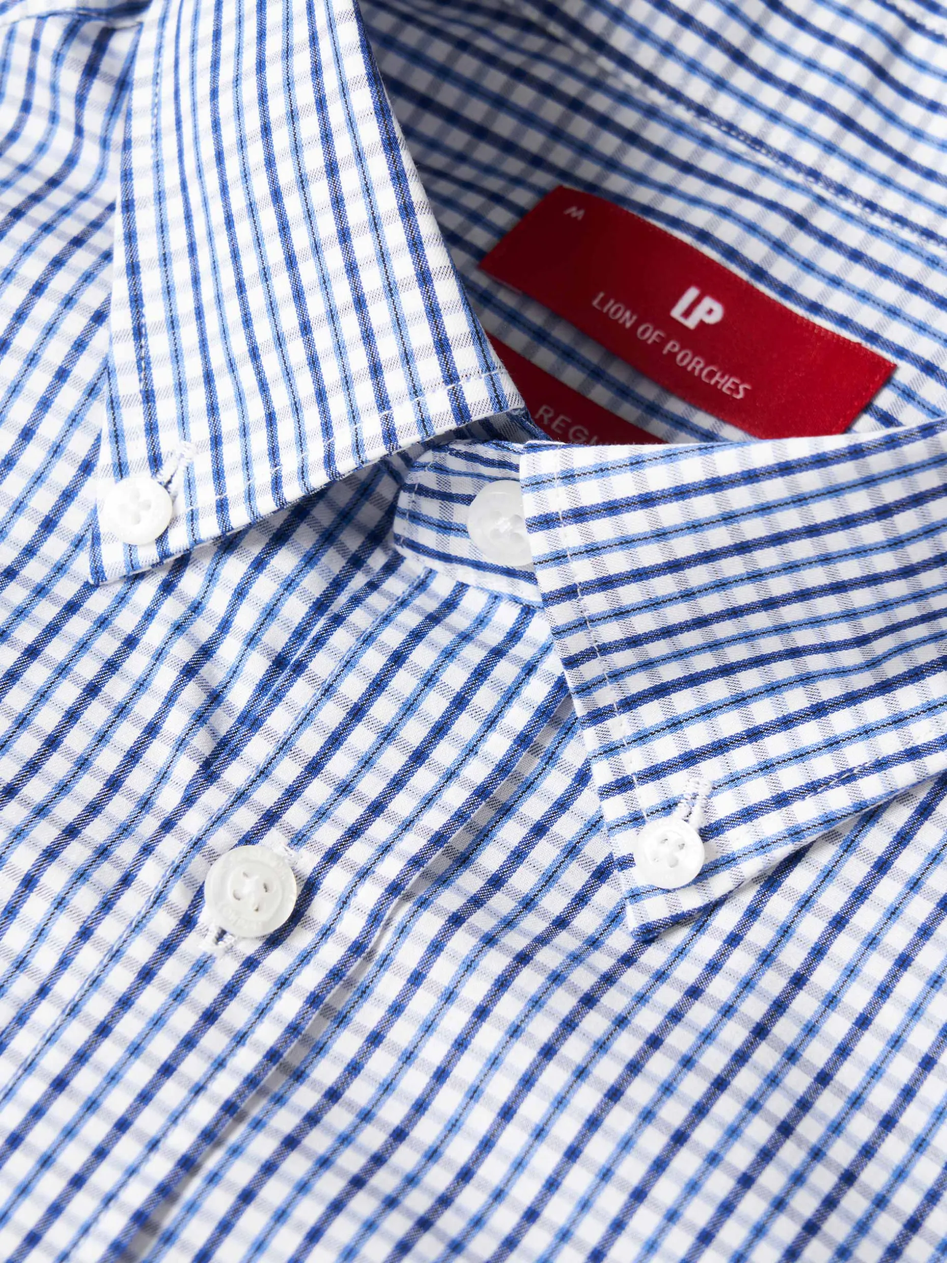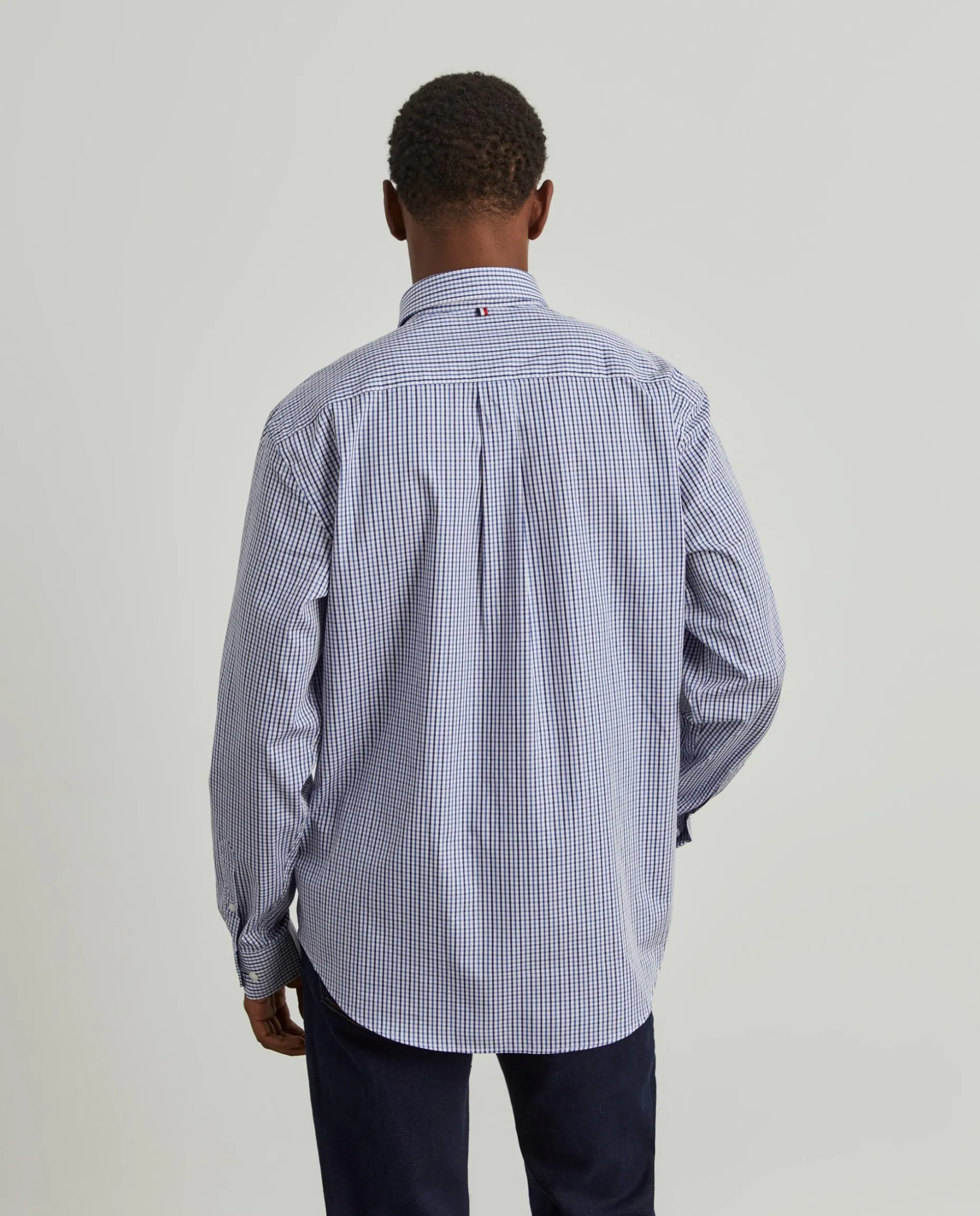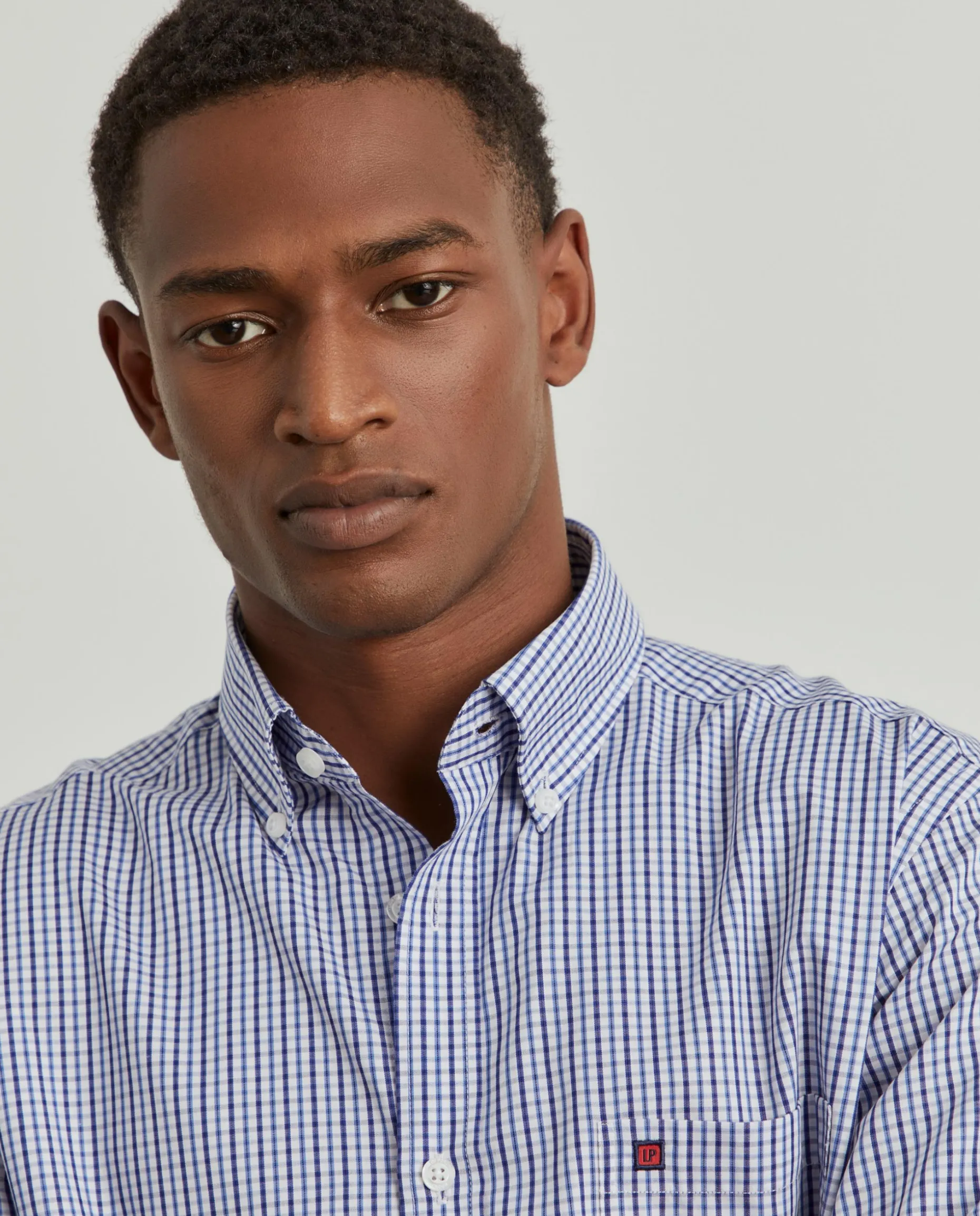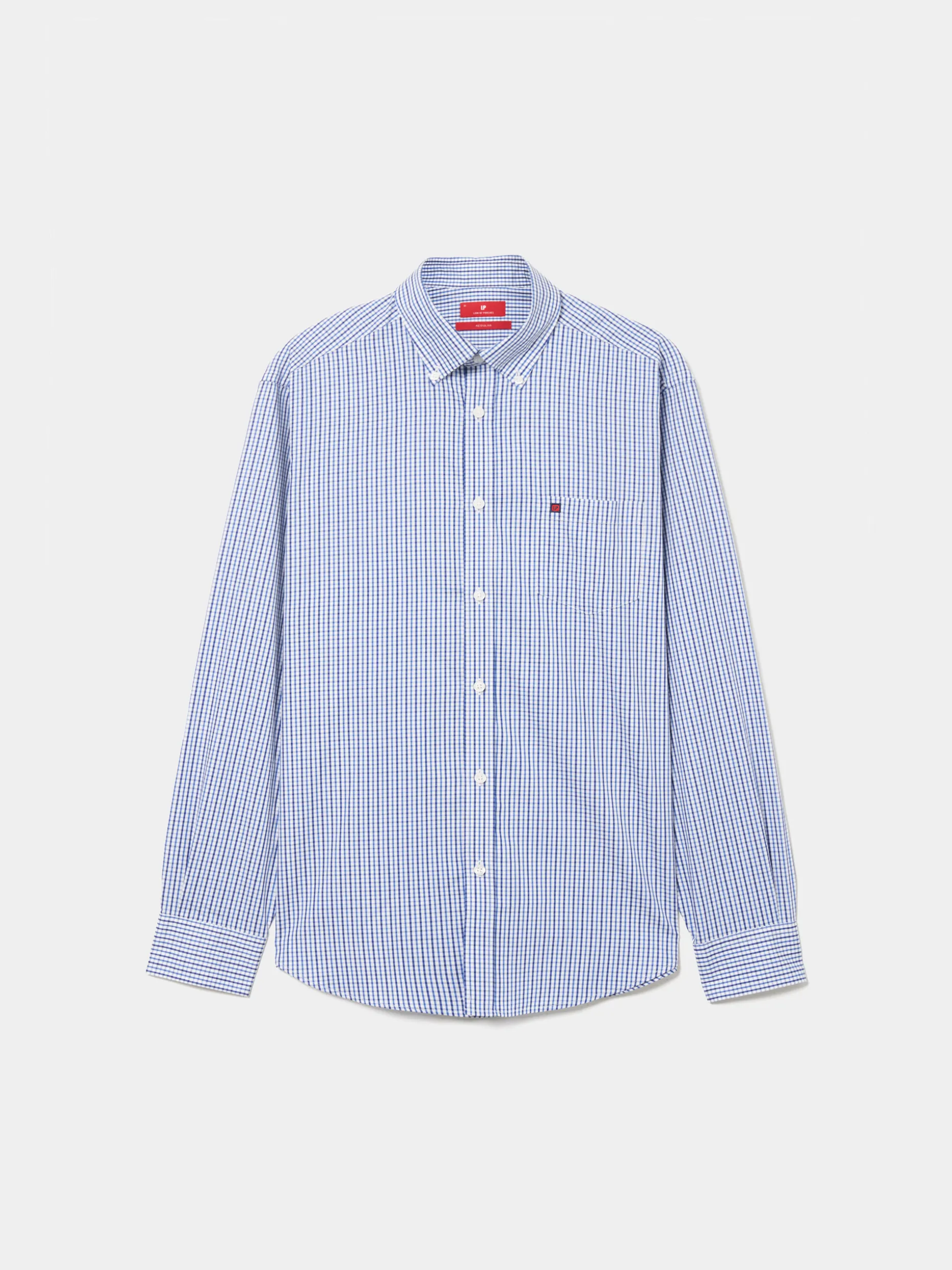 Camisa xadrez regular fit. Colarinho com dois botões. Bolso no peito com bordado personalizado. Botões personalizados. Macho de pregas nas costas.