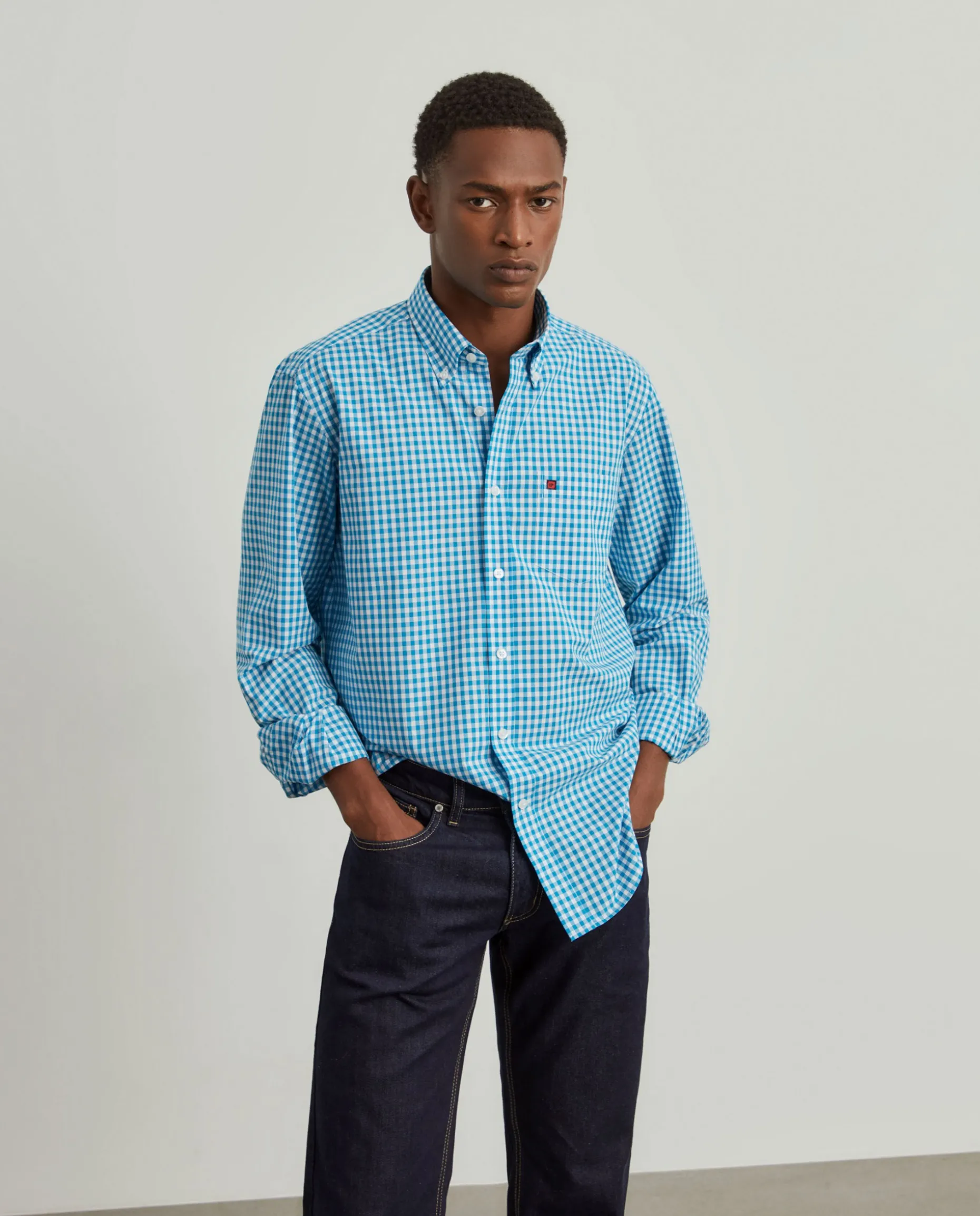 Camisa Regular Fit. Colarinho com dois botões. Bolso no peito com bordado personalizado. Botões personalizados. Macho de pregas nas costas. Fita decorativa no decote costas.