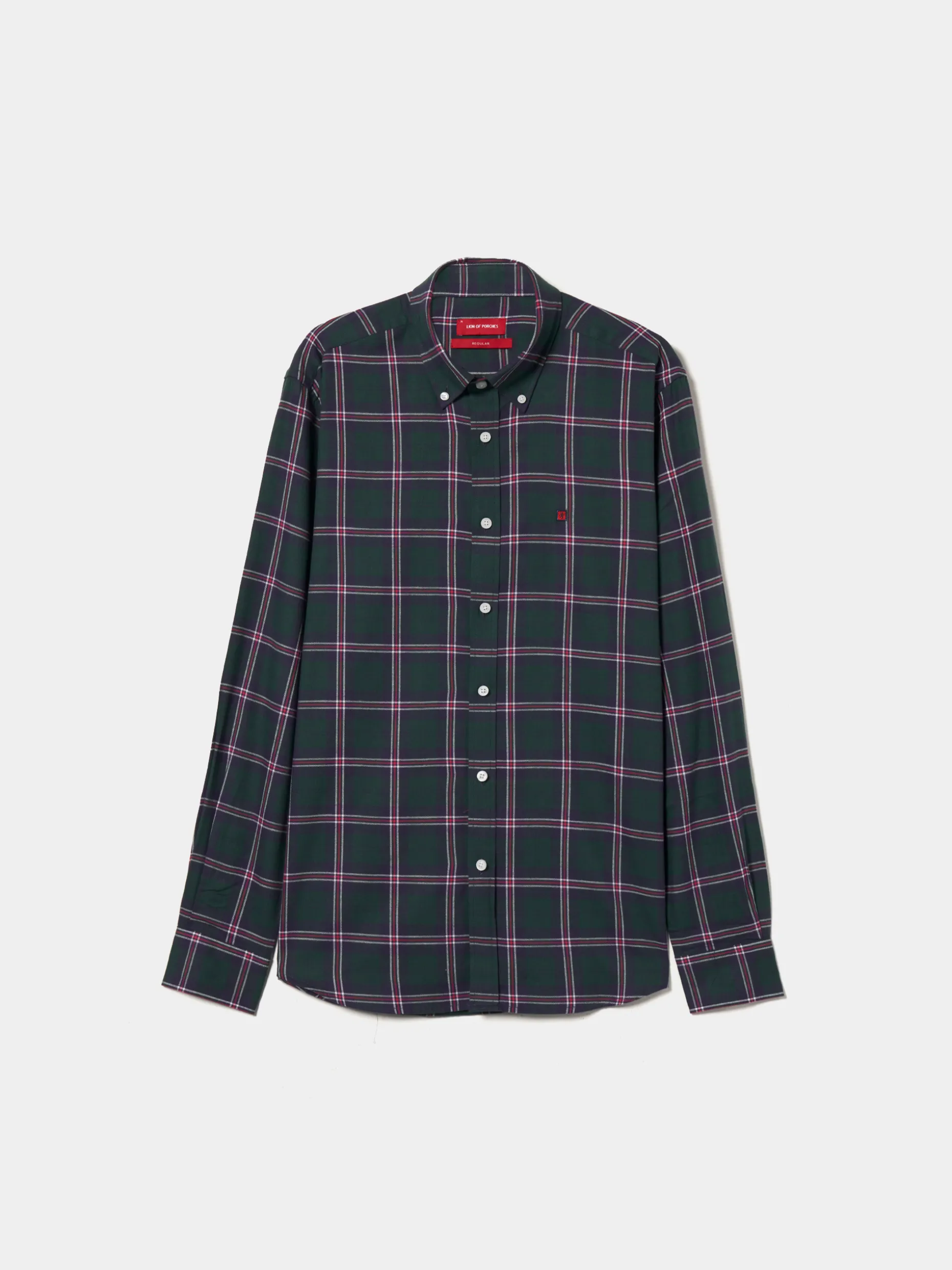 Camisa Regular Fit em tecido com padrão de xadrez. Colarinho com dois botões. Bordado personalizado no peito. Botões personalizados.