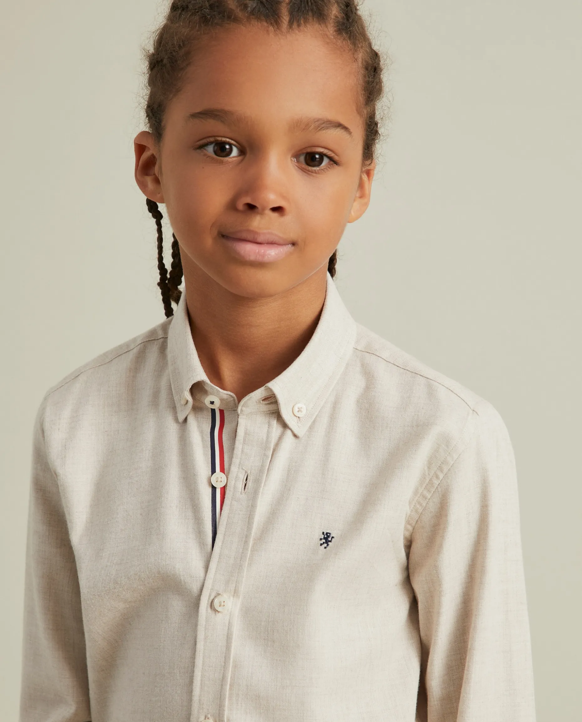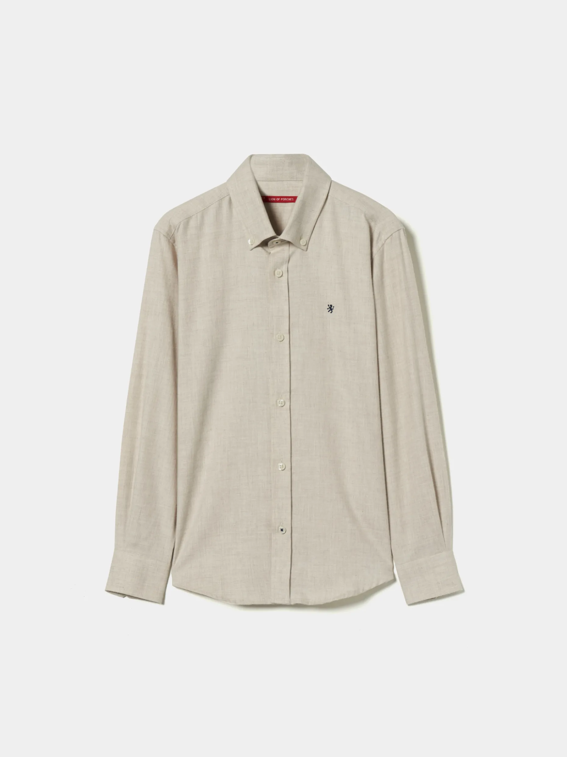 Camisa regular fit manga comprida com leão estampado no peito em contraste. Fita de riscas tricolor estampado no interior da carcela. Primeiro botão e último cosidos em contraste.