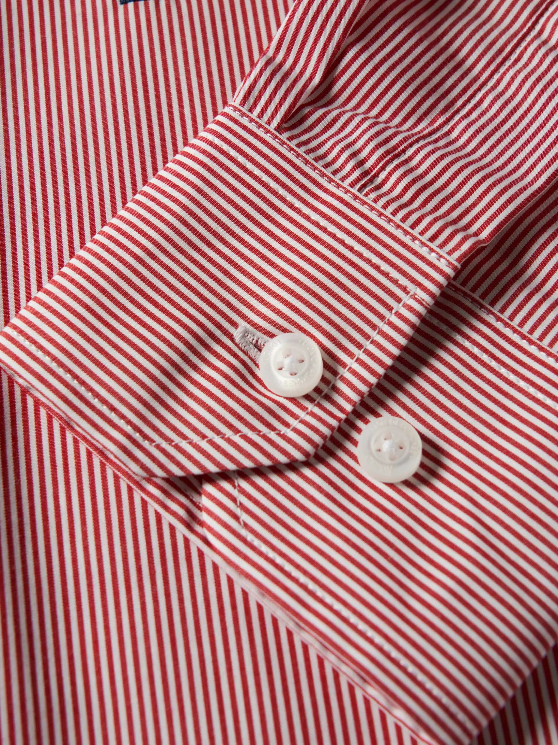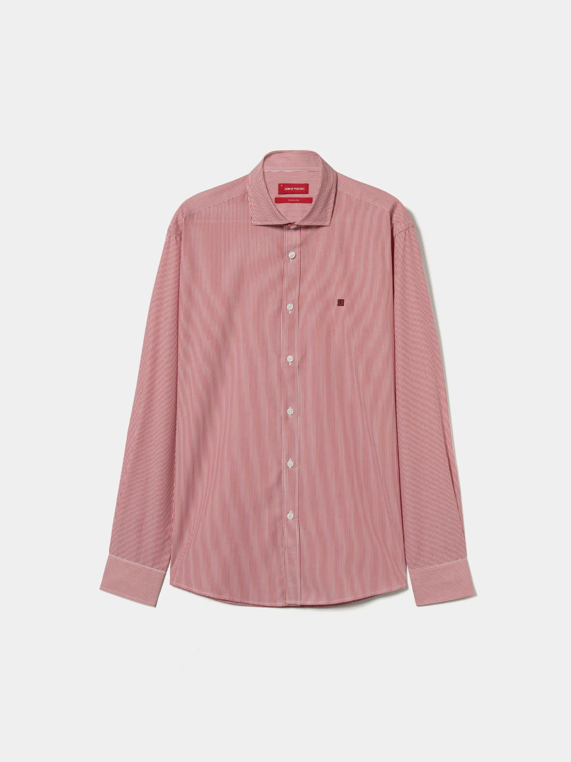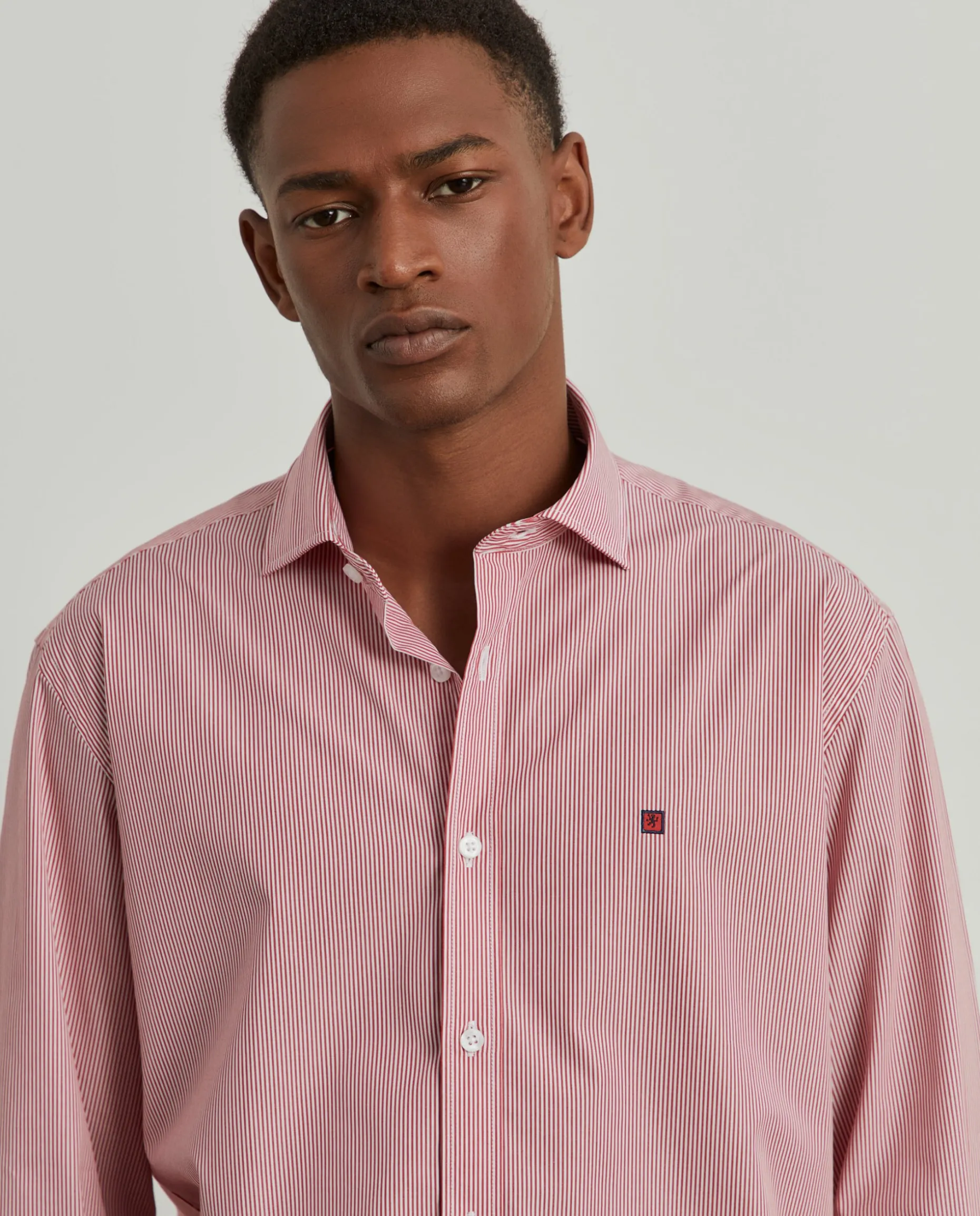 Camisa Regular Fit em tecido com padrão de riscas. Colarinho com dois botões. Bordado personalizado no peito. Botões personalizados.