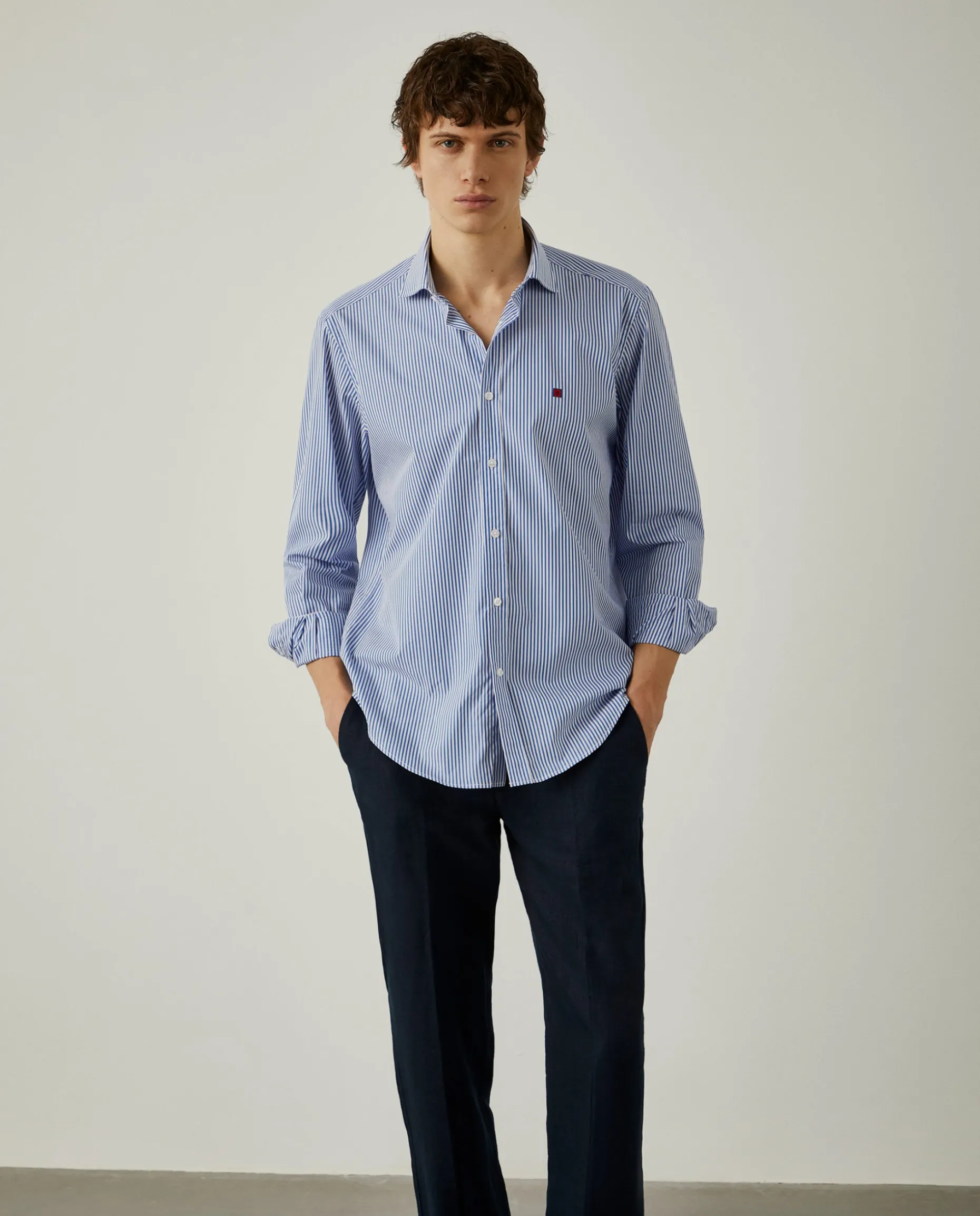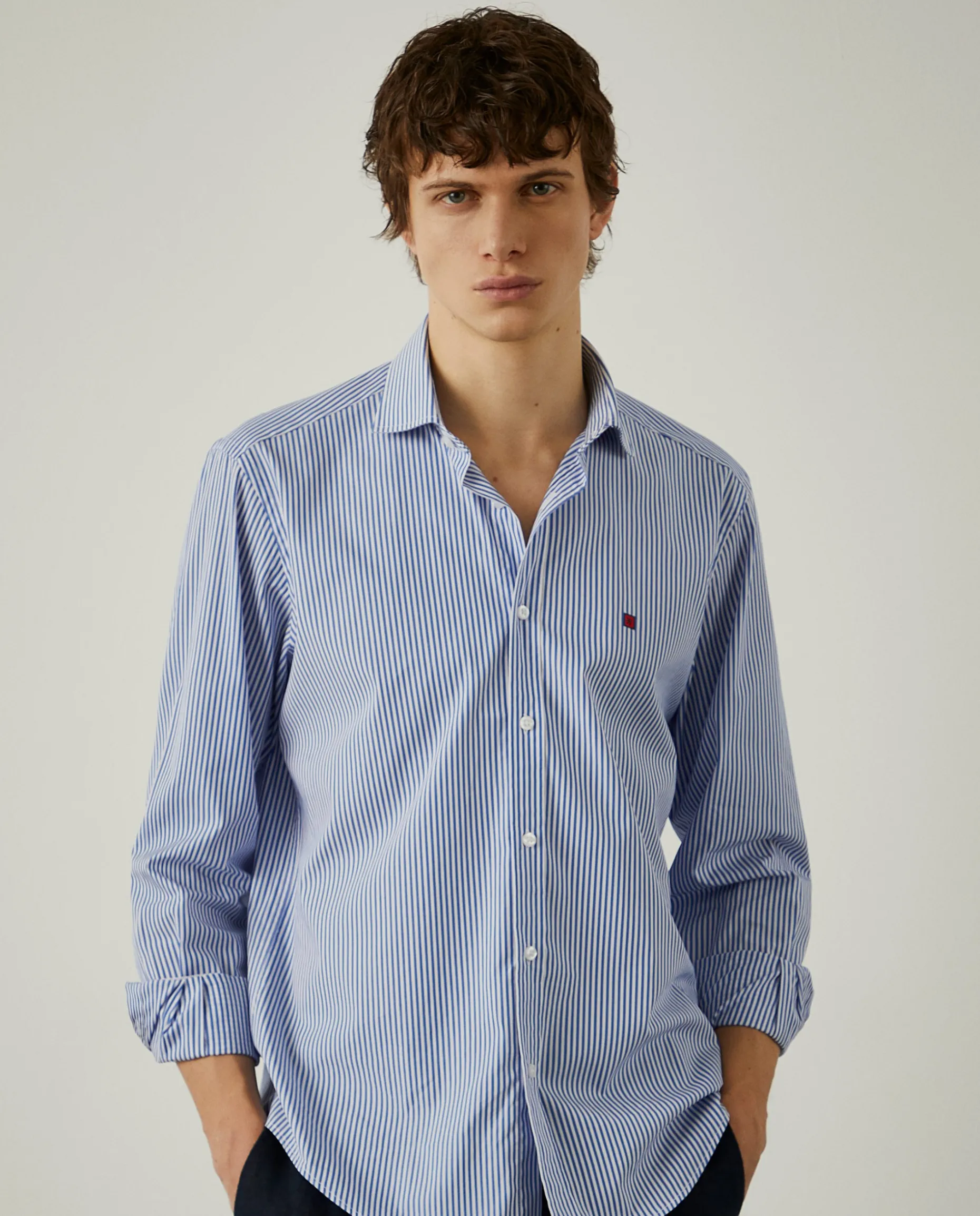 Camisa regular fit. Tecido com padrão de riscas. Colarinho “cutaway”. Branding Lion of Porches no peito. Botões personalizados.