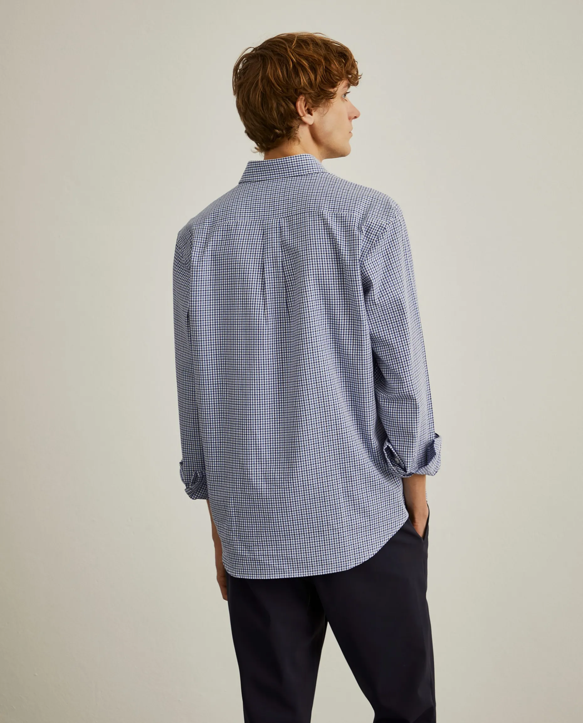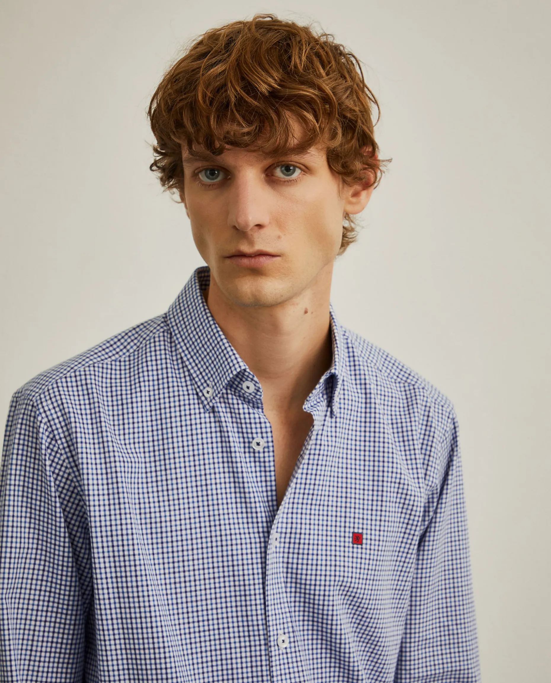 Camisa Regular Fit em tecido com padrão de quadrados. Colarinho com dois botões. Bordado personalizado no peito. Botões personalizados.