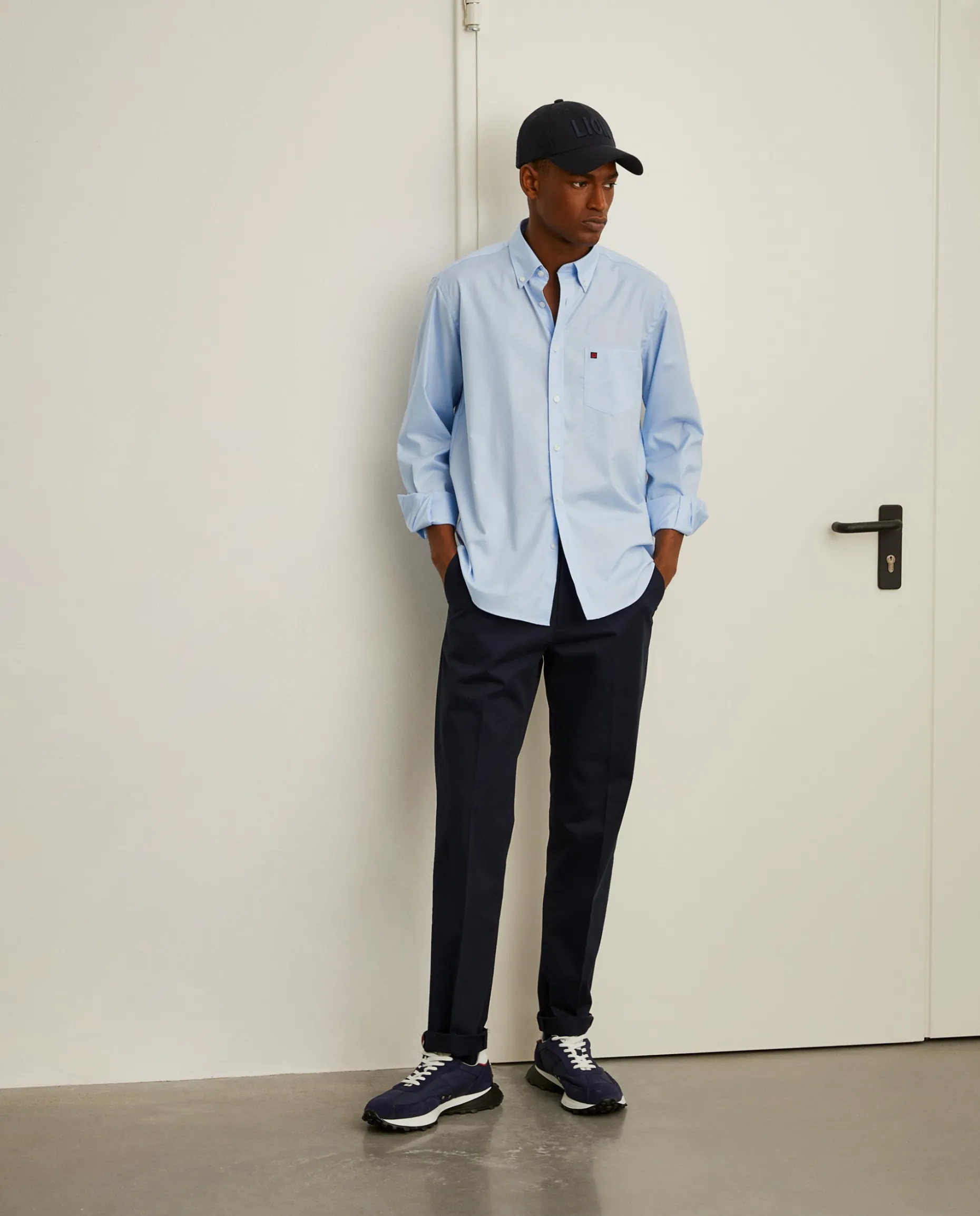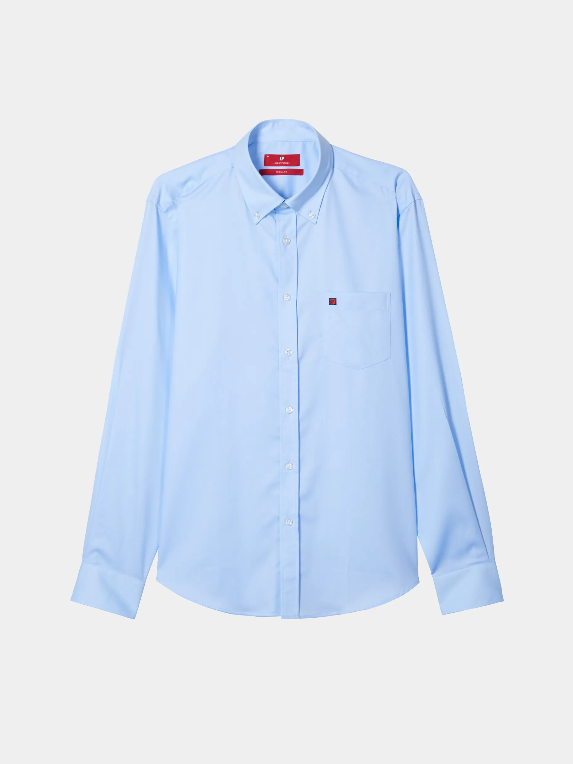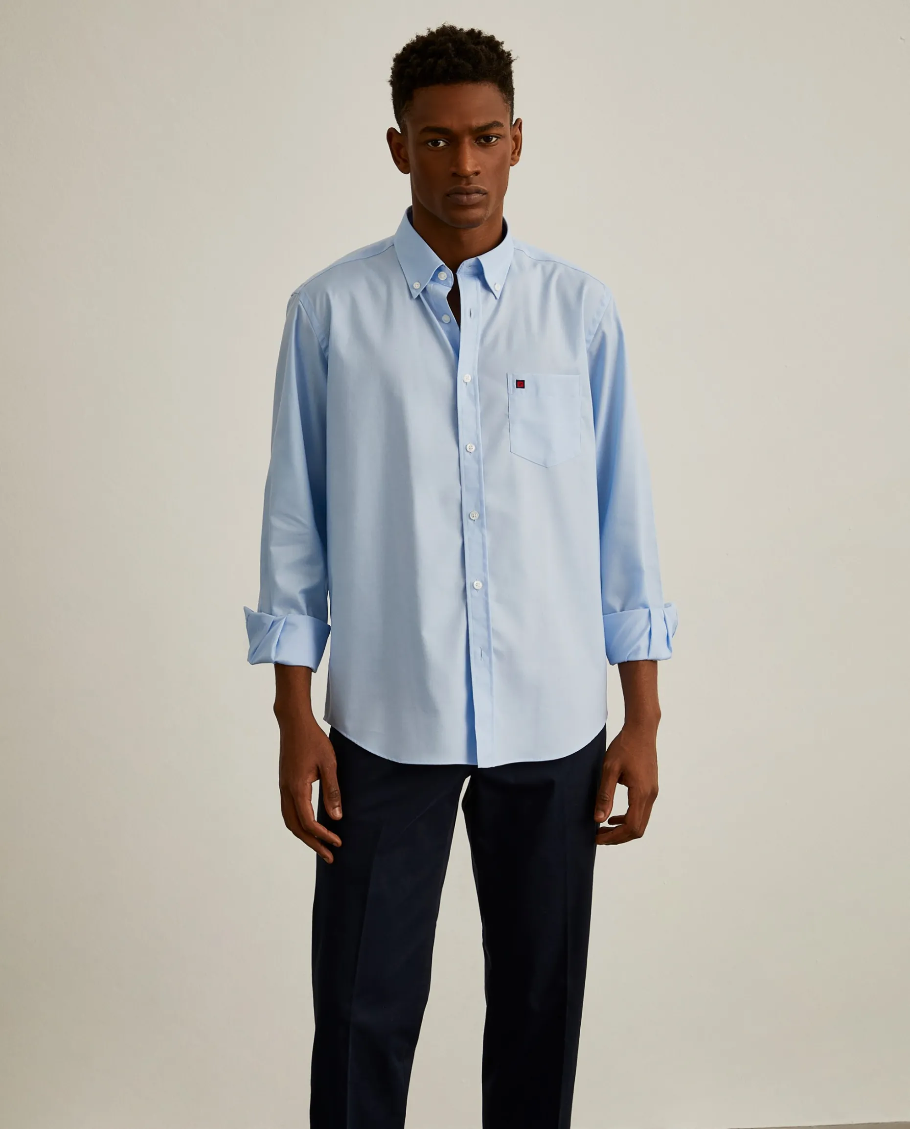 Camisa regular fit. Confecionada em algodão. Cor lisa. Colarinho com dois botões. Aperta com botões personalizados.