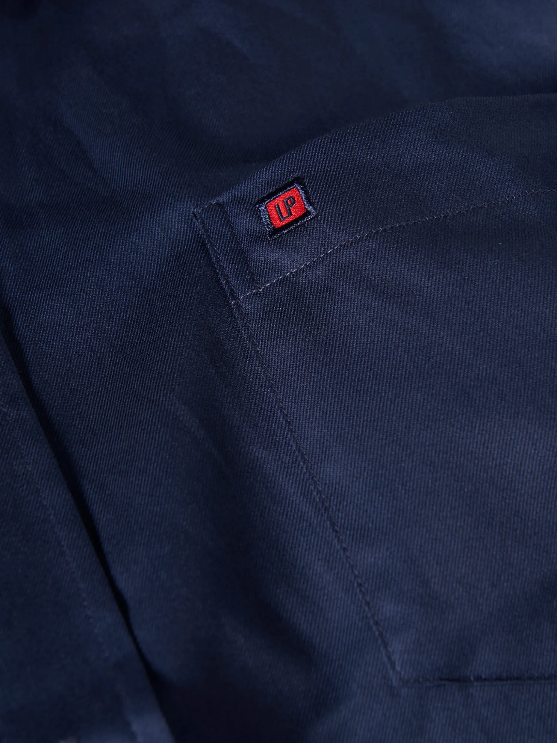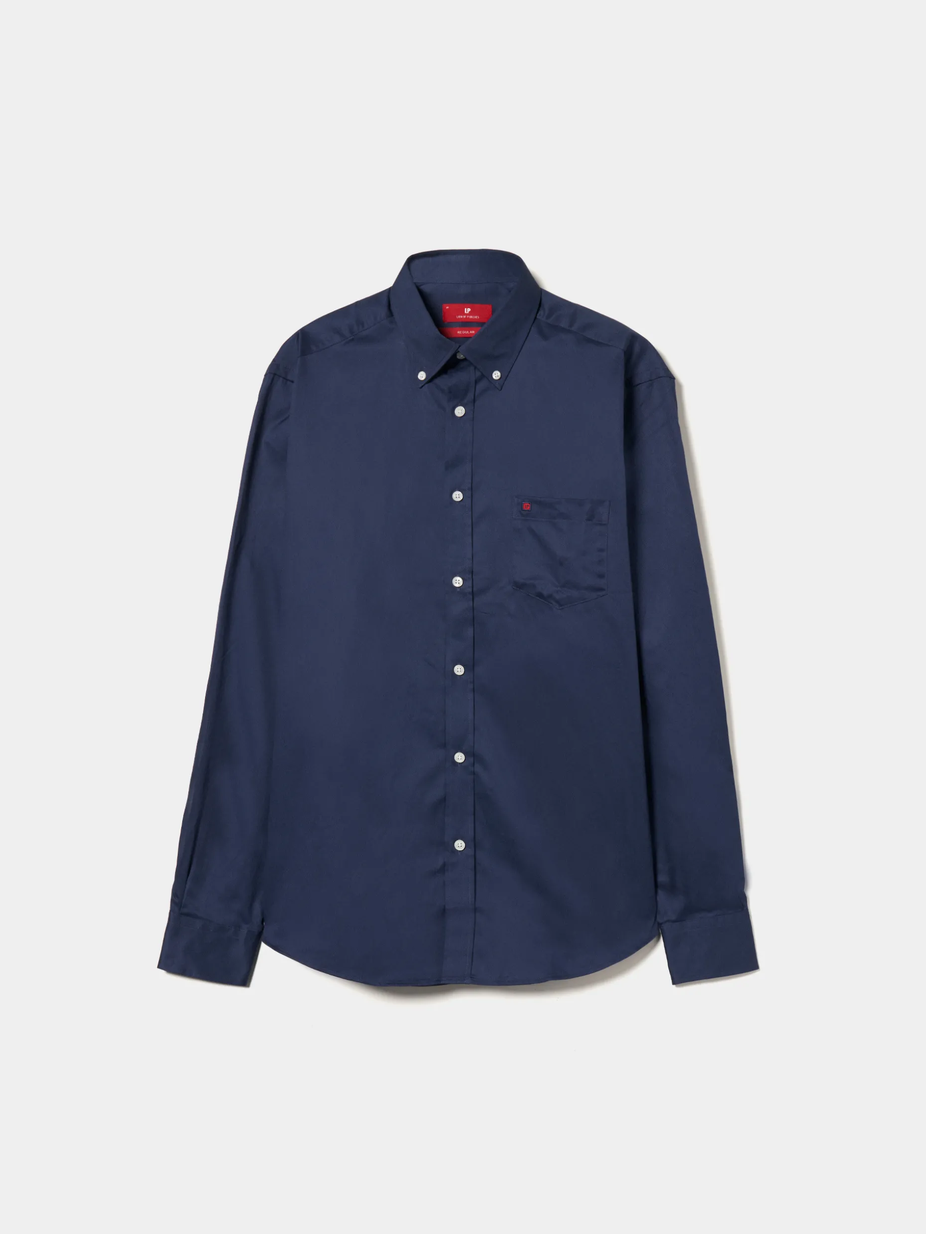 Camisa regular fit confecionada em popelina 100% algodão. Colarinho com dois botões. Bolso no peito com bordado personalizado. Botões personalizados. Macho de pregas nas costas.