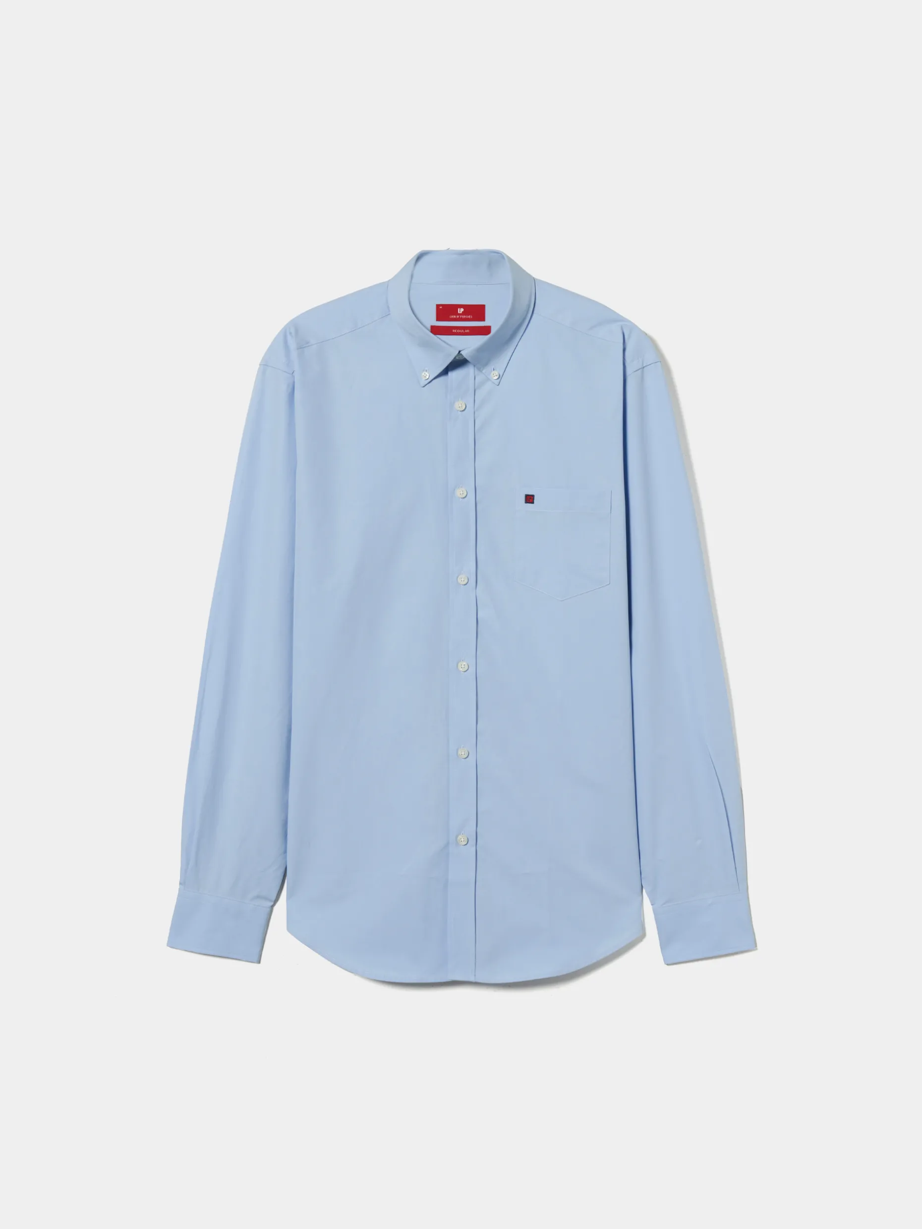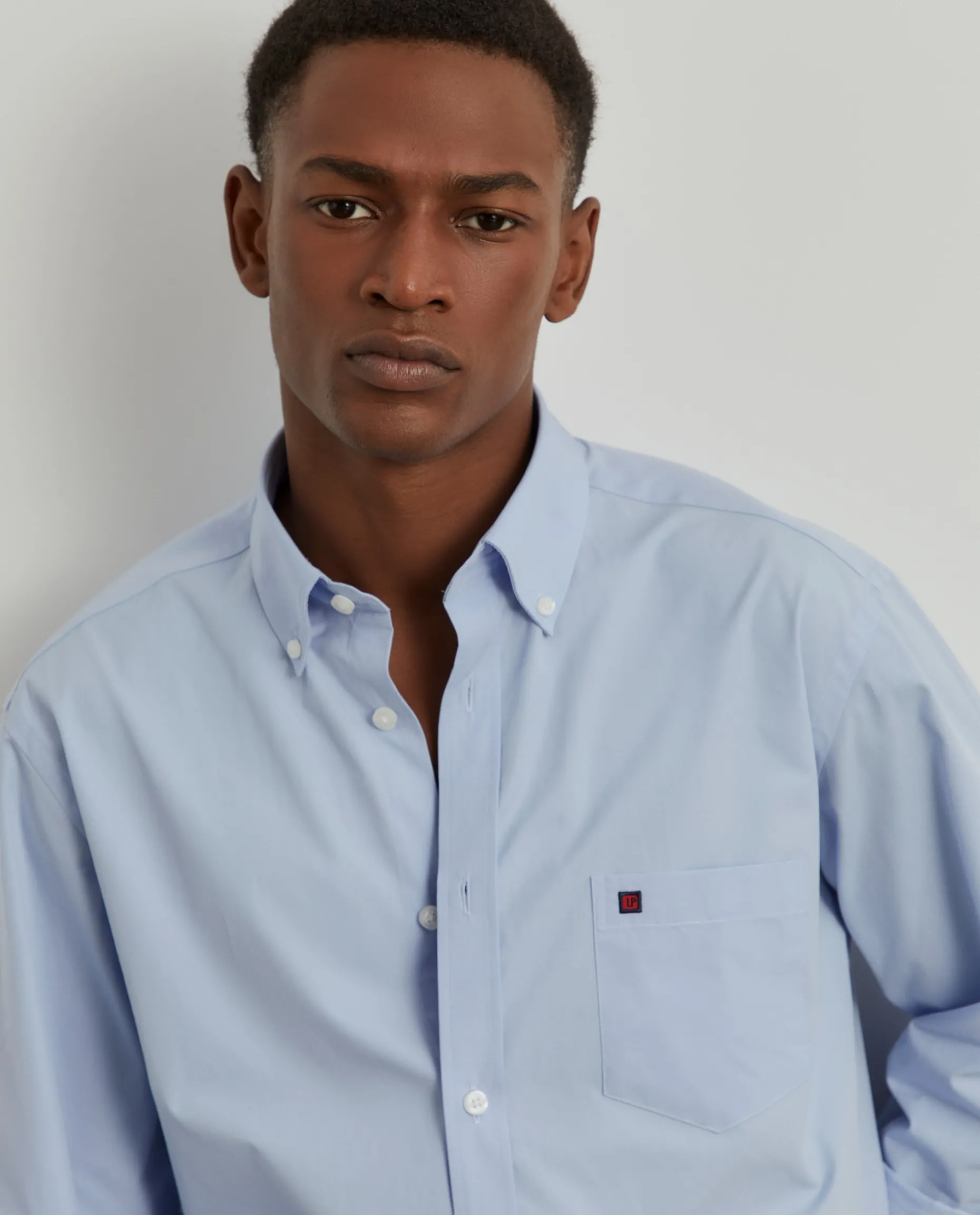 Camisa popelina regular fit. Colarinho com dois botões. Bolso no peito com bordado personalizado. Botões personalizados. Macho de pregas nas costas.