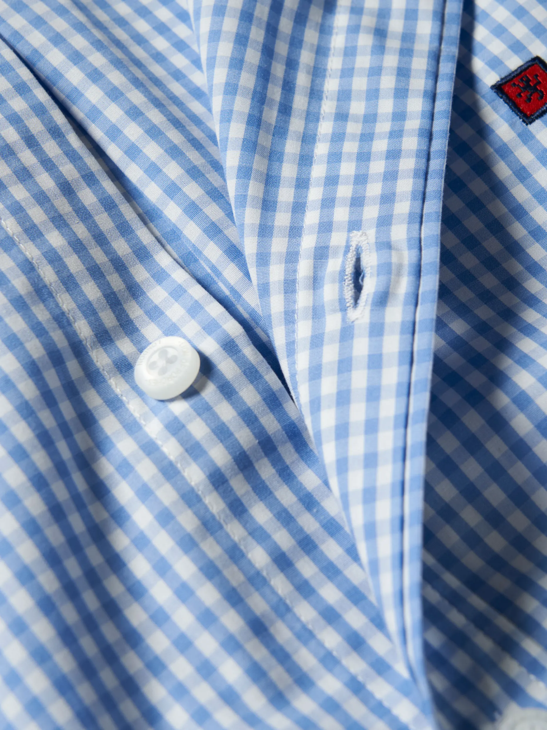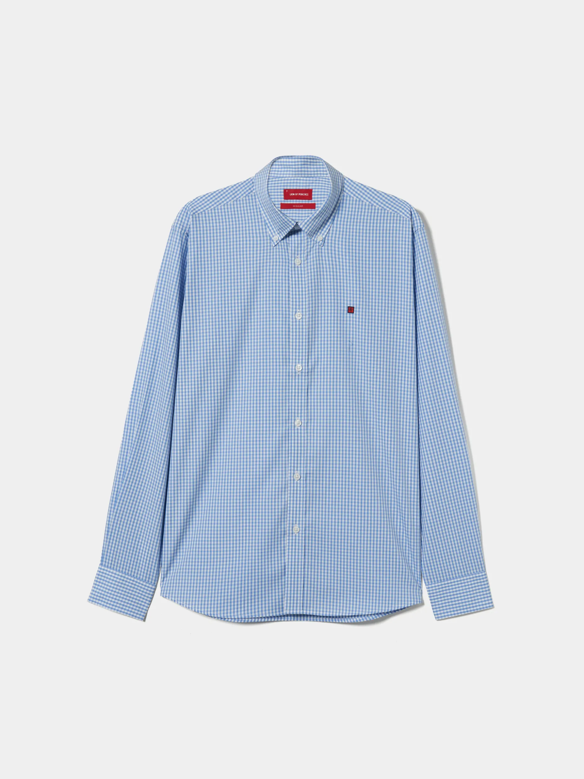 Camisa Regular Fit em tecido com padrão de quadrados. Colarinho com dois botões. Bordado personalizado no peito. Botões personalizados.