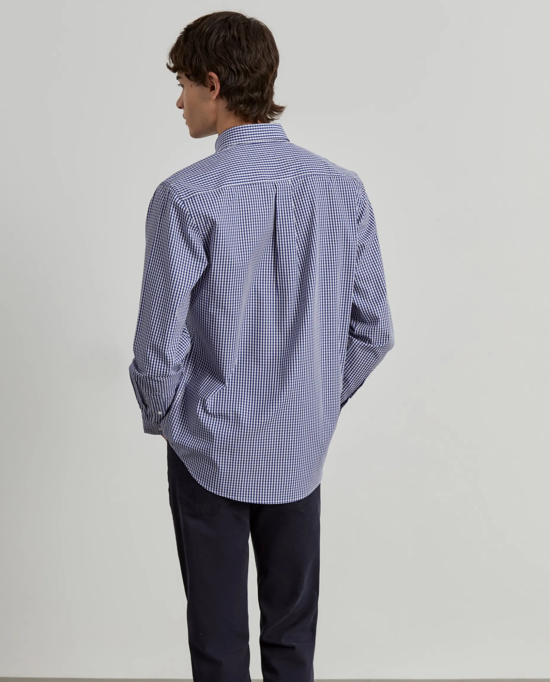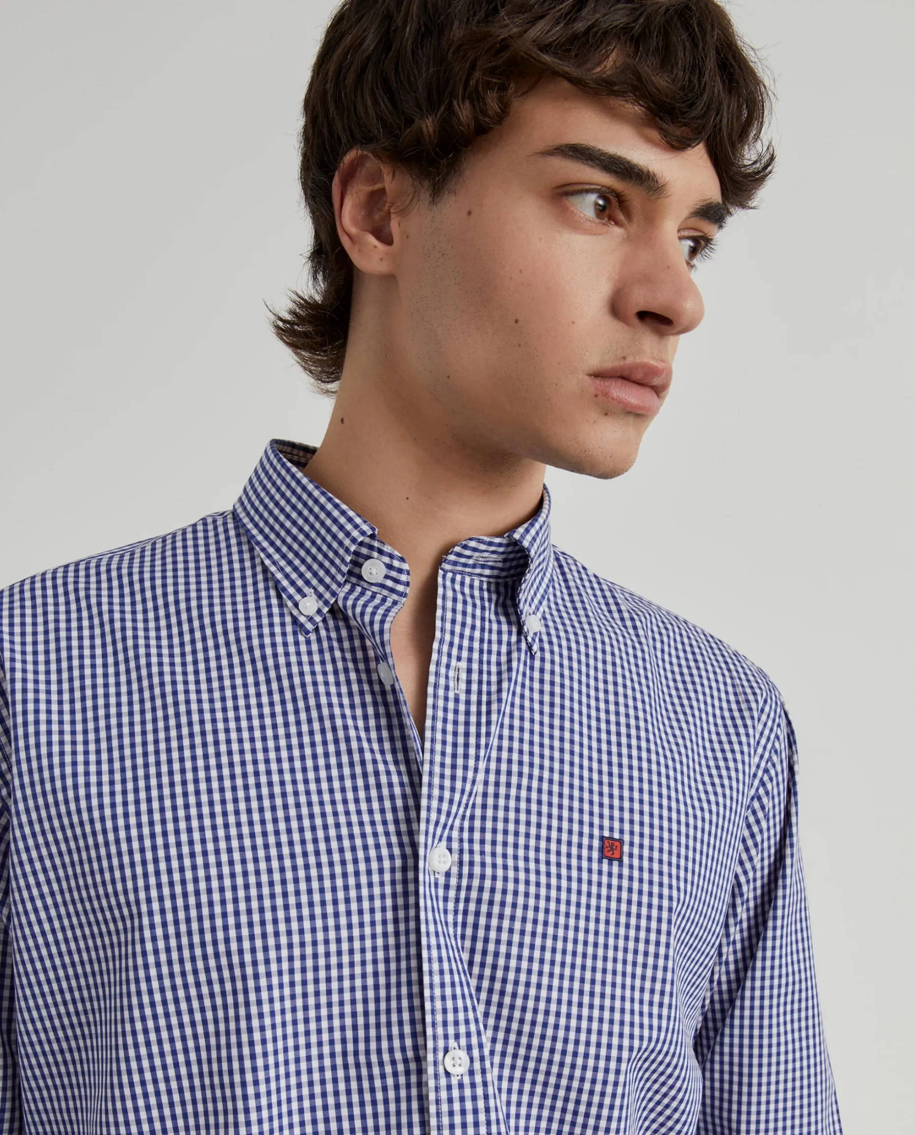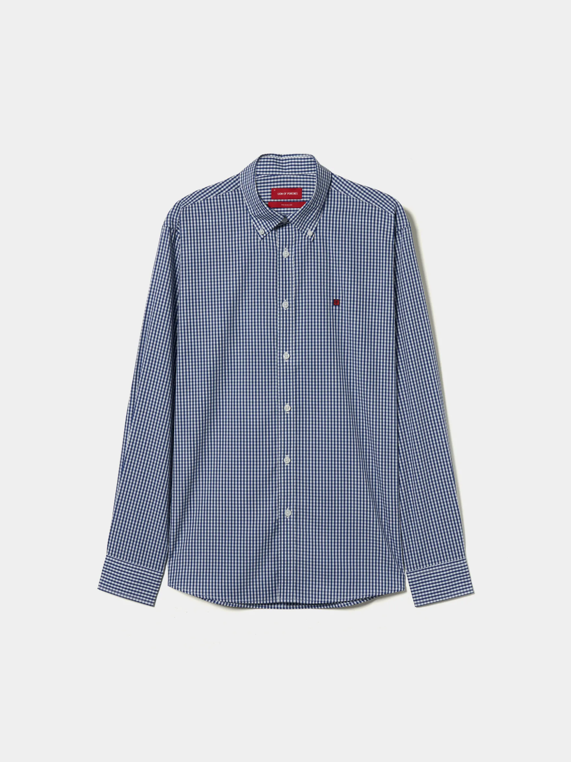Camisa Regular Fit em tecido com padrão de quadrados. Colarinho com dois botões. Bordado personalizado no peito. Botões personalizados.